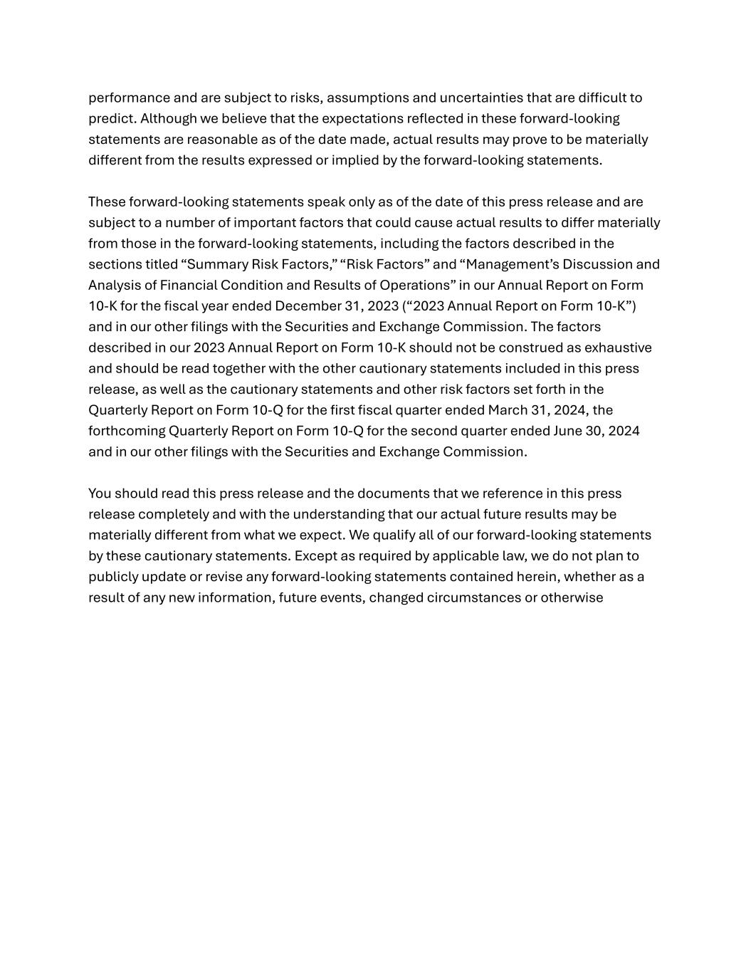 performance and are subject to risks, assumptions and uncertainties that are difficult to predict. Although we believe that the expectations reflected in these forward-looking statements are reasonable as of the date made, actual results may prove to be materially different from the results expressed or implied by the forward-looking statements. These forward-looking statements speak only as of the date of this press release and are subject to a number of important factors that could cause actual results to differ materially from those in the forward-looking statements, including the factors described in the sections titled “Summary Risk Factors,” “Risk Factors” and “Management’s Discussion and Analysis of Financial Condition and Results of Operations” in our Annual Report on Form 10-K for the fiscal year ended December 31, 2023 (“2023 Annual Report on Form 10-K”) and in our other filings with the Securities and Exchange Commission. The factors described in our 2023 Annual Report on Form 10-K should not be construed as exhaustive and should be read together with the other cautionary statements included in this press release, as well as the cautionary statements and other risk factors set forth in the Quarterly Report on Form 10-Q for the first fiscal quarter ended March 31, 2024, the forthcoming Quarterly Report on Form 10-Q for the second quarter ended June 30, 2024 and in our other filings with the Securities and Exchange Commission. You should read this press release and the documents that we reference in this press release completely and with the understanding that our actual future results may be materially different from what we expect. We qualify all of our forward-looking statements by these cautionary statements. Except as required by applicable law, we do not plan to publicly update or revise any forward-looking statements contained herein, whether as a result of any new information, future events, changed circumstances or otherwise