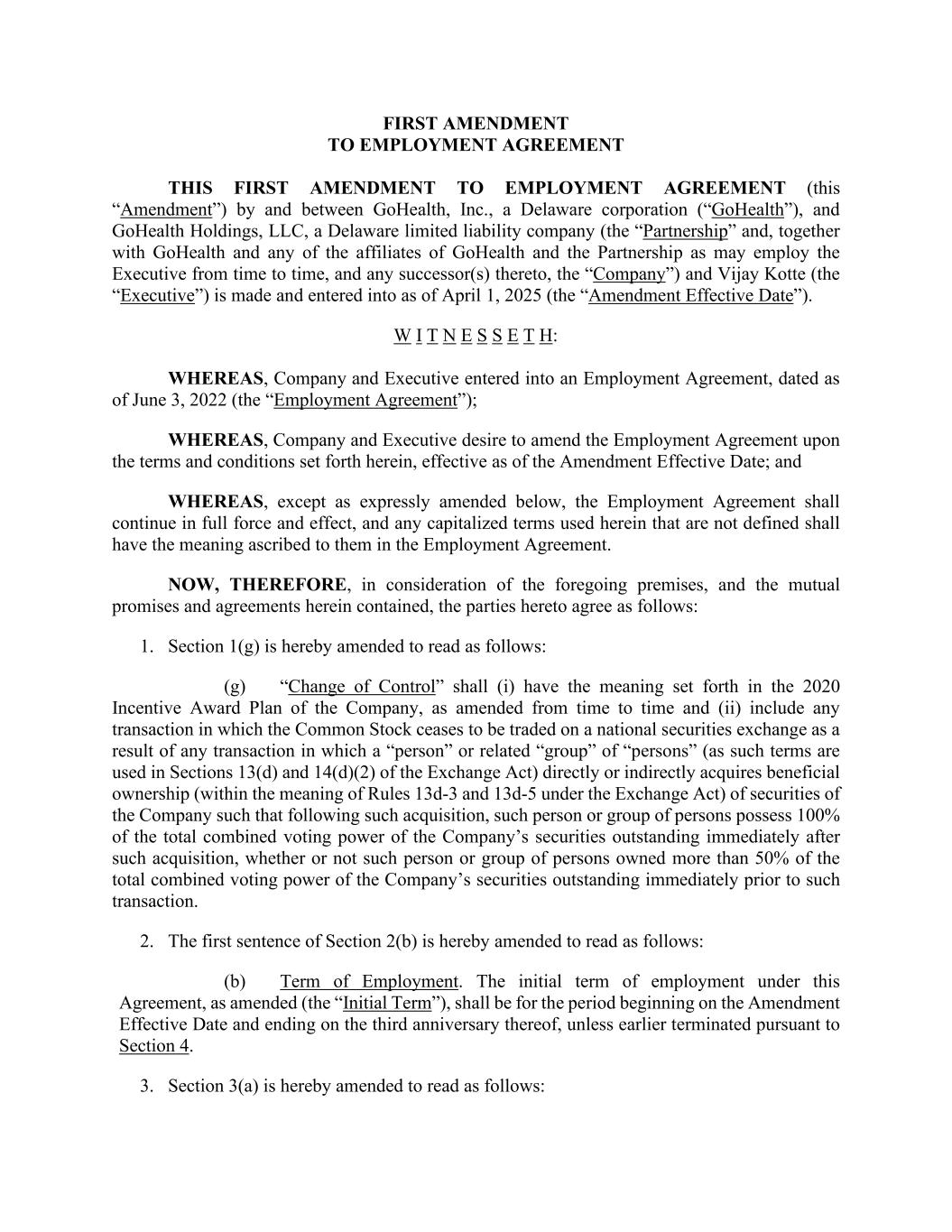 FIRST AMENDMENT TO EMPLOYMENT AGREEMENT THIS FIRST AMENDMENT TO EMPLOYMENT AGREEMENT (this “Amendment”) by and between GoHealth, Inc., a Delaware corporation (“GoHealth”), and GoHealth Holdings, LLC, a Delaware limited liability company (the “Partnership” and, together with GoHealth and any of the affiliates of GoHealth and the Partnership as may employ the Executive from time to time, and any successor(s) thereto, the “Company”) and Vijay Kotte (the “Executive”) is made and entered into as of April 1, 2025 (the “Amendment Effective Date”). W I T N E S S E T H: WHEREAS, Company and Executive entered into an Employment Agreement, dated as of June 3, 2022 (the “Employment Agreement”); WHEREAS, Company and Executive desire to amend the Employment Agreement upon the terms and conditions set forth herein, effective as of the Amendment Effective Date; and WHEREAS, except as expressly amended below, the Employment Agreement shall continue in full force and effect, and any capitalized terms used herein that are not defined shall have the meaning ascribed to them in the Employment Agreement. NOW, THEREFORE, in consideration of the foregoing premises, and the mutual promises and agreements herein contained, the parties hereto agree as follows: 1. Section 1(g) is hereby amended to read as follows: (g) “Change of Control” shall (i) have the meaning set forth in the 2020 Incentive Award Plan of the Company, as amended from time to time and (ii) include any transaction in which the Common Stock ceases to be traded on a national securities exchange as a result of any transaction in which a “person” or related “group” of “persons” (as such terms are used in Sections 13(d) and 14(d)(2) of the Exchange Act) directly or indirectly acquires beneficial ownership (within the meaning of Rules 13d-3 and 13d-5 under the Exchange Act) of securities of the Company such that following such acquisition, such person or group of persons possess 100% of the total combined voting power of the Company’s securities outstanding immediately after such acquisition, whether or not such person or group of persons owned more than 50% of the total combined voting power of the Company’s securities outstanding immediately prior to such transaction. 2. The first sentence of Section 2(b) is hereby amended to read as follows: (b) Term of Employment. The initial term of employment under this Agreement, as amended (the “Initial Term”), shall be for the period beginning on the Amendment Effective Date and ending on the third anniversary thereof, unless earlier terminated pursuant to Section 4. 3. Section 3(a) is hereby amended to read as follows: