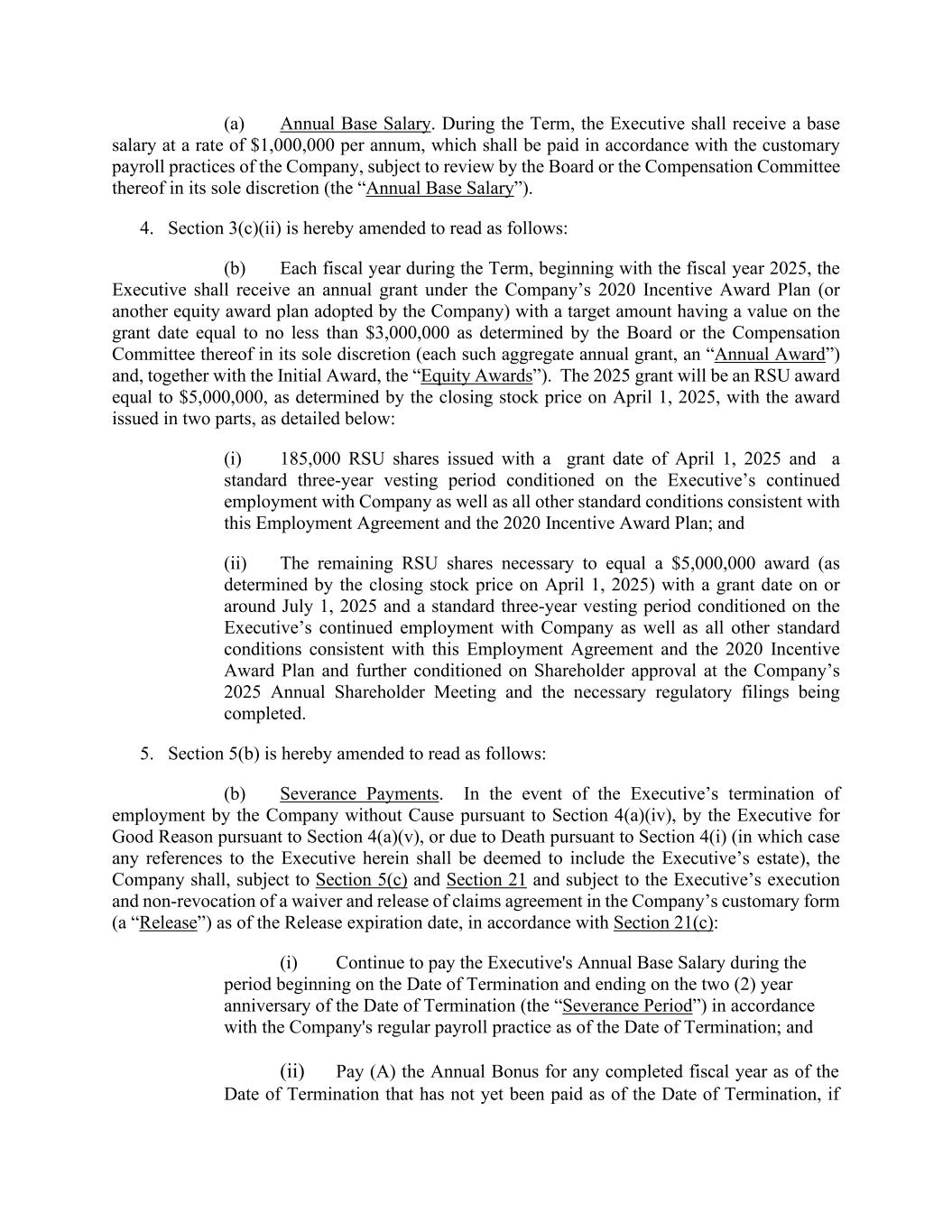 (a) Annual Base Salary. During the Term, the Executive shall receive a base salary at a rate of $1,000,000 per annum, which shall be paid in accordance with the customary payroll practices of the Company, subject to review by the Board or the Compensation Committee thereof in its sole discretion (the “Annual Base Salary”). 4. Section 3(c)(ii) is hereby amended to read as follows: (b) Each fiscal year during the Term, beginning with the fiscal year 2025, the Executive shall receive an annual grant under the Company’s 2020 Incentive Award Plan (or another equity award plan adopted by the Company) with a target amount having a value on the grant date equal to no less than $3,000,000 as determined by the Board or the Compensation Committee thereof in its sole discretion (each such aggregate annual grant, an “Annual Award”) and, together with the Initial Award, the “Equity Awards”). The 2025 grant will be an RSU award equal to $5,000,000, as determined by the closing stock price on April 1, 2025, with the award issued in two parts, as detailed below: (i) 185,000 RSU shares issued with a grant date of April 1, 2025 and a standard three-year vesting period conditioned on the Executive’s continued employment with Company as well as all other standard conditions consistent with this Employment Agreement and the 2020 Incentive Award Plan; and (ii) The remaining RSU shares necessary to equal a $5,000,000 award (as determined by the closing stock price on April 1, 2025) with a grant date on or around July 1, 2025 and a standard three-year vesting period conditioned on the Executive’s continued employment with Company as well as all other standard conditions consistent with this Employment Agreement and the 2020 Incentive Award Plan and further conditioned on Shareholder approval at the Company’s 2025 Annual Shareholder Meeting and the necessary regulatory filings being completed. 5. Section 5(b) is hereby amended to read as follows: (b) Severance Payments. In the event of the Executive’s termination of employment by the Company without Cause pursuant to Section 4(a)(iv), by the Executive for Good Reason pursuant to Section 4(a)(v), or due to Death pursuant to Section 4(i) (in which case any references to the Executive herein shall be deemed to include the Executive’s estate), the Company shall, subject to Section 5(c) and Section 21 and subject to the Executive’s execution and non-revocation of a waiver and release of claims agreement in the Company’s customary form (a “Release”) as of the Release expiration date, in accordance with Section 21(c): (i) Continue to pay the Executive's Annual Base Salary during the period beginning on the Date of Termination and ending on the two (2) year anniversary of the Date of Termination (the “Severance Period”) in accordance with the Company's regular payroll practice as of the Date of Termination; and (ii) Pay (A) the Annual Bonus for any completed fiscal year as of the Date of Termination that has not yet been paid as of the Date of Termination, if