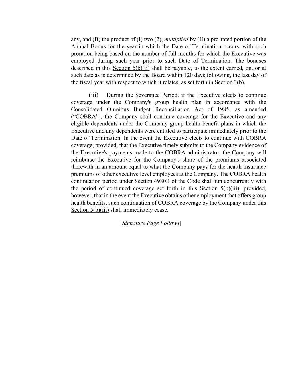 any, and (B) the product of (I) two (2), multiplied by (II) a pro-rated portion of the Annual Bonus for the year in which the Date of Termination occurs, with such proration being based on the number of full months for which the Executive was employed during such year prior to such Date of Termination. The bonuses described in this Section 5(b)(ii) shall be payable, to the extent earned, on, or at such date as is determined by the Board within 120 days following, the last day of the fiscal year with respect to which it relates, as set forth in Section 3(b). (iii) During the Severance Period, if the Executive elects to continue coverage under the Company's group health plan in accordance with the Consolidated Omnibus Budget Reconciliation Act of 1985, as amended (“COBRA”), the Company shall continue coverage for the Executive and any eligible dependents under the Company group health benefit plans in which the Executive and any dependents were entitled to participate immediately prior to the Date of Termination. In the event the Executive elects to continue with COBRA coverage, provided, that the Executive timely submits to the Company evidence of the Executive's payments made to the COBRA administrator, the Company will reimburse the Executive for the Company's share of the premiums associated therewith in an amount equal to what the Company pays for the health insurance premiums of other executive level employees at the Company. The COBRA health continuation period under Section 4980B of the Code shall tun concurrently with the period of continued coverage set forth in this Section 5(b)(iii); provided, however, that in the event the Executive obtains other employment that offers group health benefits, such continuation of COBRA coverage by the Company under this Section 5(b)(iii) shall immediately cease. [Signature Page Follows]