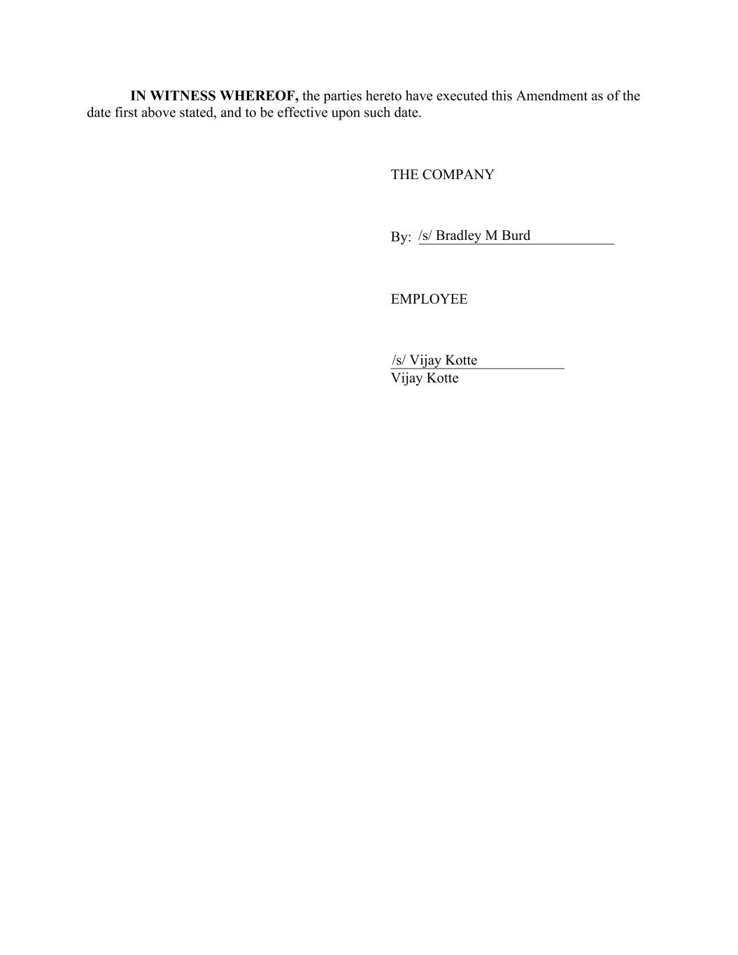 IN WITNESS WHEREOF, the parties hereto have executed this Amendment as of the date first above stated, and to be effective upon such date. THE COMPANY By: ___________________________ EMPLOYEE ________________________ Vijay Kotte /s/ Bradley M Burd /s/ Vijay Kotte