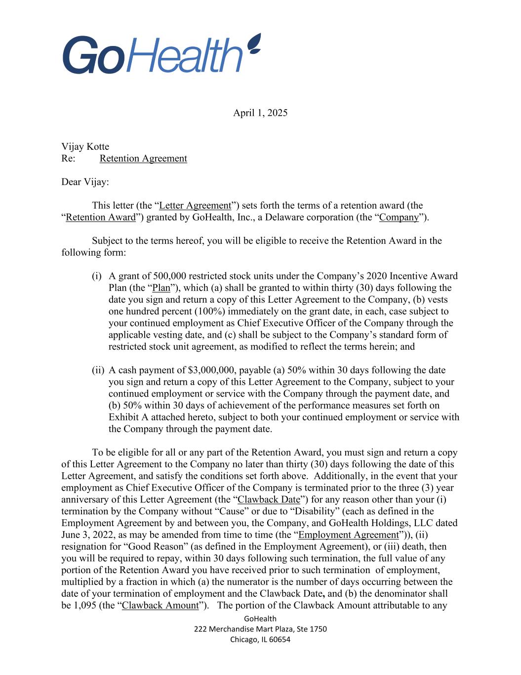 GoHealth 222 Merchandise Mart Plaza, Ste 1750 Chicago, IL 60654 April 1, 2025 Vijay Kotte Re: Retention Agreement Dear Vijay: This letter (the “Letter Agreement”) sets forth the terms of a retention award (the “Retention Award”) granted by GoHealth, Inc., a Delaware corporation (the “Company”). Subject to the terms hereof, you will be eligible to receive the Retention Award in the following form: (i) A grant of 500,000 restricted stock units under the Company’s 2020 Incentive Award Plan (the “Plan”), which (a) shall be granted to within thirty (30) days following the date you sign and return a copy of this Letter Agreement to the Company, (b) vests one hundred percent (100%) immediately on the grant date, in each, case subject to your continued employment as Chief Executive Officer of the Company through the applicable vesting date, and (c) shall be subject to the Company’s standard form of restricted stock unit agreement, as modified to reflect the terms herein; and (ii) A cash payment of $3,000,000, payable (a) 50% within 30 days following the date you sign and return a copy of this Letter Agreement to the Company, subject to your continued employment or service with the Company through the payment date, and (b) 50% within 30 days of achievement of the performance measures set forth on Exhibit A attached hereto, subject to both your continued employment or service with the Company through the payment date. To be eligible for all or any part of the Retention Award, you must sign and return a copy of this Letter Agreement to the Company no later than thirty (30) days following the date of this Letter Agreement, and satisfy the conditions set forth above. Additionally, in the event that your employment as Chief Executive Officer of the Company is terminated prior to the three (3) year anniversary of this Letter Agreement (the “Clawback Date”) for any reason other than your (i) termination by the Company without “Cause” or due to “Disability” (each as defined in the Employment Agreement by and between you, the Company, and GoHealth Holdings, LLC dated June 3, 2022, as may be amended from time to time (the “Employment Agreement”)), (ii) resignation for “Good Reason” (as defined in the Employment Agreement), or (iii) death, then you will be required to repay, within 30 days following such termination, the full value of any portion of the Retention Award you have received prior to such termination of employment, multiplied by a fraction in which (a) the numerator is the number of days occurring between the date of your termination of employment and the Clawback Date, and (b) the denominator shall be 1,095 (the “Clawback Amount”). The portion of the Clawback Amount attributable to any