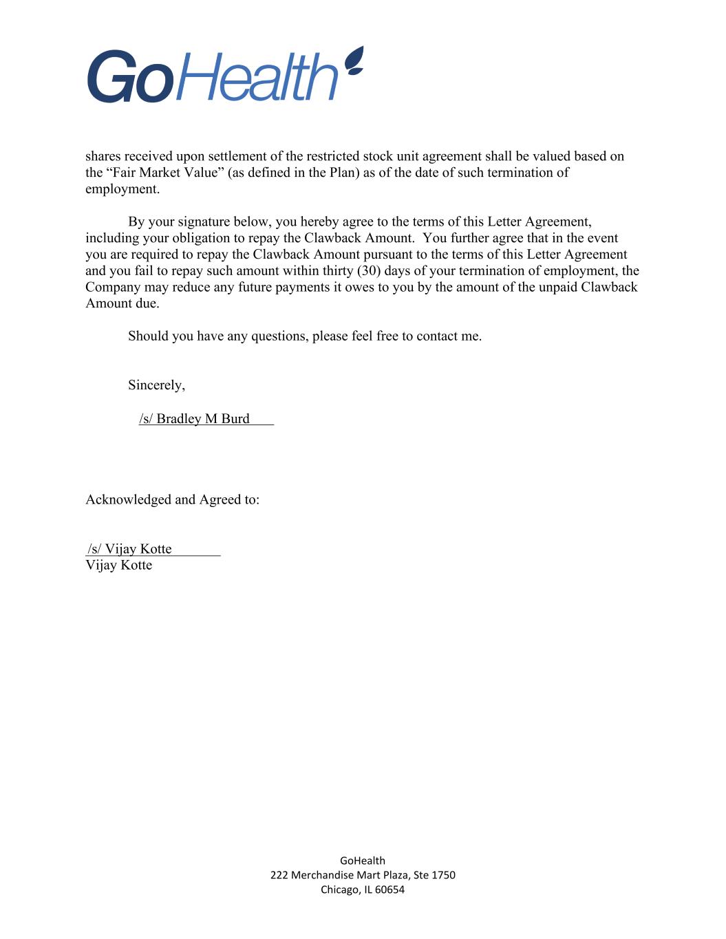 GoHealth 222 Merchandise Mart Plaza, Ste 1750 Chicago, IL 60654 shares received upon settlement of the restricted stock unit agreement shall be valued based on the “Fair Market Value” (as defined in the Plan) as of the date of such termination of employment. By your signature below, you hereby agree to the terms of this Letter Agreement, including your obligation to repay the Clawback Amount. You further agree that in the event you are required to repay the Clawback Amount pursuant to the terms of this Letter Agreement and you fail to repay such amount within thirty (30) days of your termination of employment, the Company may reduce any future payments it owes to you by the amount of the unpaid Clawback Amount due. Should you have any questions, please feel free to contact me. Sincerely, ___________________ Acknowledged and Agreed to: ___________________ Vijay Kotte /s/ Bradley M Burd /s/ Vijay Kotte