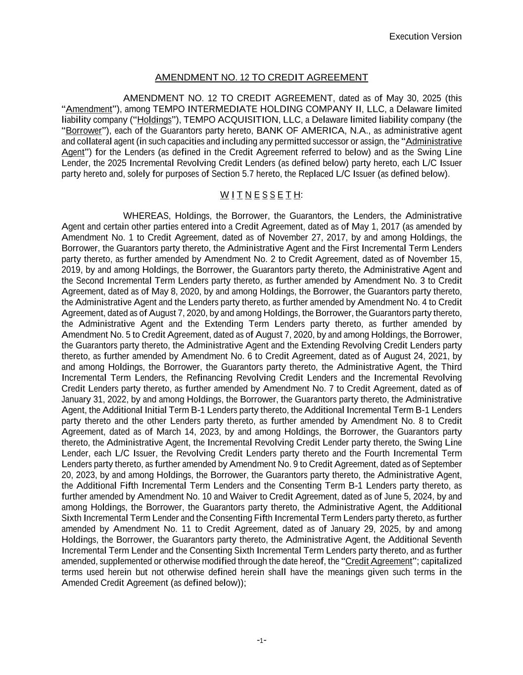 Execution Version -1- AMENDMENT NO. 12 TO CREDIT AGREEMENT AMENDMENT NO. 12 TO CREDIT AGREEMENT, dated as of May 30, 2025 (this “Amendment”), among TEMPO INTERMEDIATE HOLDING COMPANY II, LLC, a Delaware limited liability company (“Holdings”), TEMPO ACQUISITION, LLC, a Delaware limited liability company (the “Borrower”), each of the Guarantors party hereto, BANK OF AMERICA, N.A., as administrative agent and collateral agent (in such capacities and including any permitted successor or assign, the “Administrative Agent”) for the Lenders (as defined in the Credit Agreement referred to below) and as the Swing Line Lender, the 2025 Incremental Revolving Credit Lenders (as defined below) party hereto, each L/C Issuer party hereto and, solely for purposes of Section 5.7 hereto, the Replaced L/C Issuer (as defined below). W I T N E S S E T H: WHEREAS, Holdings, the Borrower, the Guarantors, the Lenders, the Administrative Agent and certain other parties entered into a Credit Agreement, dated as of May 1, 2017 (as amended by Amendment No. 1 to Credit Agreement, dated as of November 27, 2017, by and among Holdings, the Borrower, the Guarantors party thereto, the Administrative Agent and the First Incremental Term Lenders party thereto, as further amended by Amendment No. 2 to Credit Agreement, dated as of November 15, 2019, by and among Holdings, the Borrower, the Guarantors party thereto, the Administrative Agent and the Second Incremental Term Lenders party thereto, as further amended by Amendment No. 3 to Credit Agreement, dated as of May 8, 2020, by and among Holdings, the Borrower, the Guarantors party thereto, the Administrative Agent and the Lenders party thereto, as further amended by Amendment No. 4 to Credit Agreement, dated as of August 7, 2020, by and among Holdings, the Borrower, the Guarantors party thereto, the Administrative Agent and the Extending Term Lenders party thereto, as further amended by Amendment No. 5 to Credit Agreement, dated as of August 7, 2020, by and among Holdings, the Borrower, the Guarantors party thereto, the Administrative Agent and the Extending Revolving Credit Lenders party thereto, as further amended by Amendment No. 6 to Credit Agreement, dated as of August 24, 2021, by and among Holdings, the Borrower, the Guarantors party thereto, the Administrative Agent, the Third Incremental Term Lenders, the Refinancing Revolving Credit Lenders and the Incremental Revolving Credit Lenders party thereto, as further amended by Amendment No. 7 to Credit Agreement, dated as of January 31, 2022, by and among Holdings, the Borrower, the Guarantors party thereto, the Administrative Agent, the Additional Initial Term B-1 Lenders party thereto, the Additional Incremental Term B-1 Lenders party thereto and the other Lenders party thereto, as further amended by Amendment No. 8 to Credit Agreement, dated as of March 14, 2023, by and among Holdings, the Borrower, the Guarantors party thereto, the Administrative Agent, the Incremental Revolving Credit Lender party thereto, the Swing Line Lender, each L/C Issuer, the Revolving Credit Lenders party thereto and the Fourth Incremental Term Lenders party thereto, as further amended by Amendment No. 9 to Credit Agreement, dated as of September 20, 2023, by and among Holdings, the Borrower, the Guarantors party thereto, the Administrative Agent, the Additional Fifth Incremental Term Lenders and the Consenting Term B-1 Lenders party thereto, as further amended by Amendment No. 10 and Waiver to Credit Agreement, dated as of June 5, 2024, by and among Holdings, the Borrower, the Guarantors party thereto, the Administrative Agent, the Additional Sixth Incremental Term Lender and the Consenting Fifth Incremental Term Lenders party thereto, as further amended by Amendment No. 11 to Credit Agreement, dated as of January 29, 2025, by and among Holdings, the Borrower, the Guarantors party thereto, the Administrative Agent, the Additional Seventh Incremental Term Lender and the Consenting Sixth Incremental Term Lenders party thereto, and as further amended, supplemented or otherwise modified through the date hereof, the “Credit Agreement”; capitalized terms used herein but not otherwise defined herein shall have the meanings given such terms in the Amended Credit Agreement (as defined below));