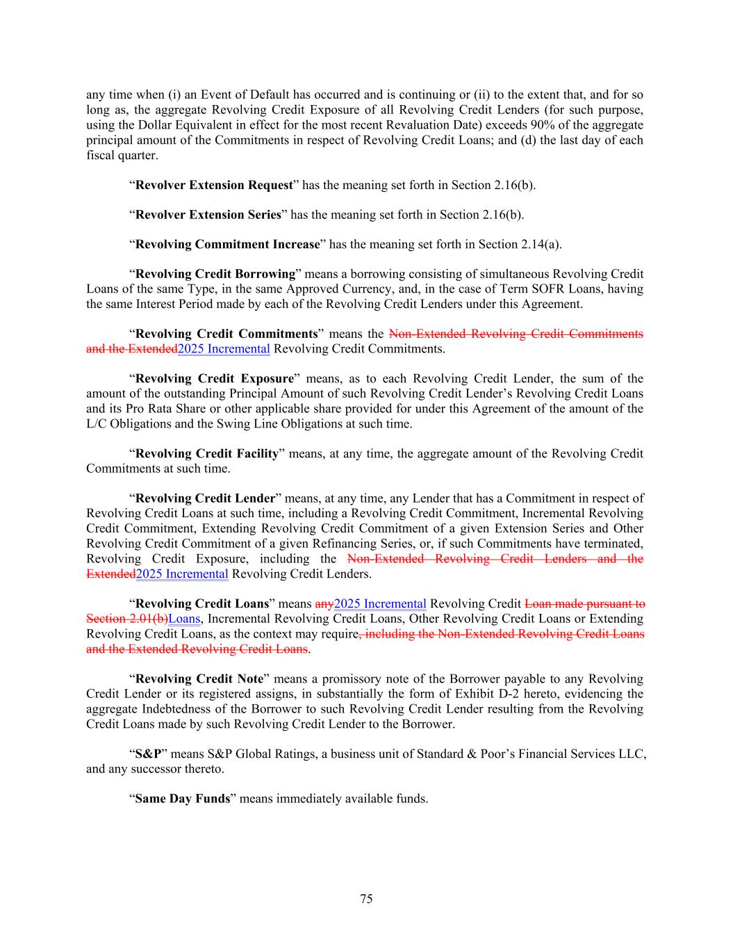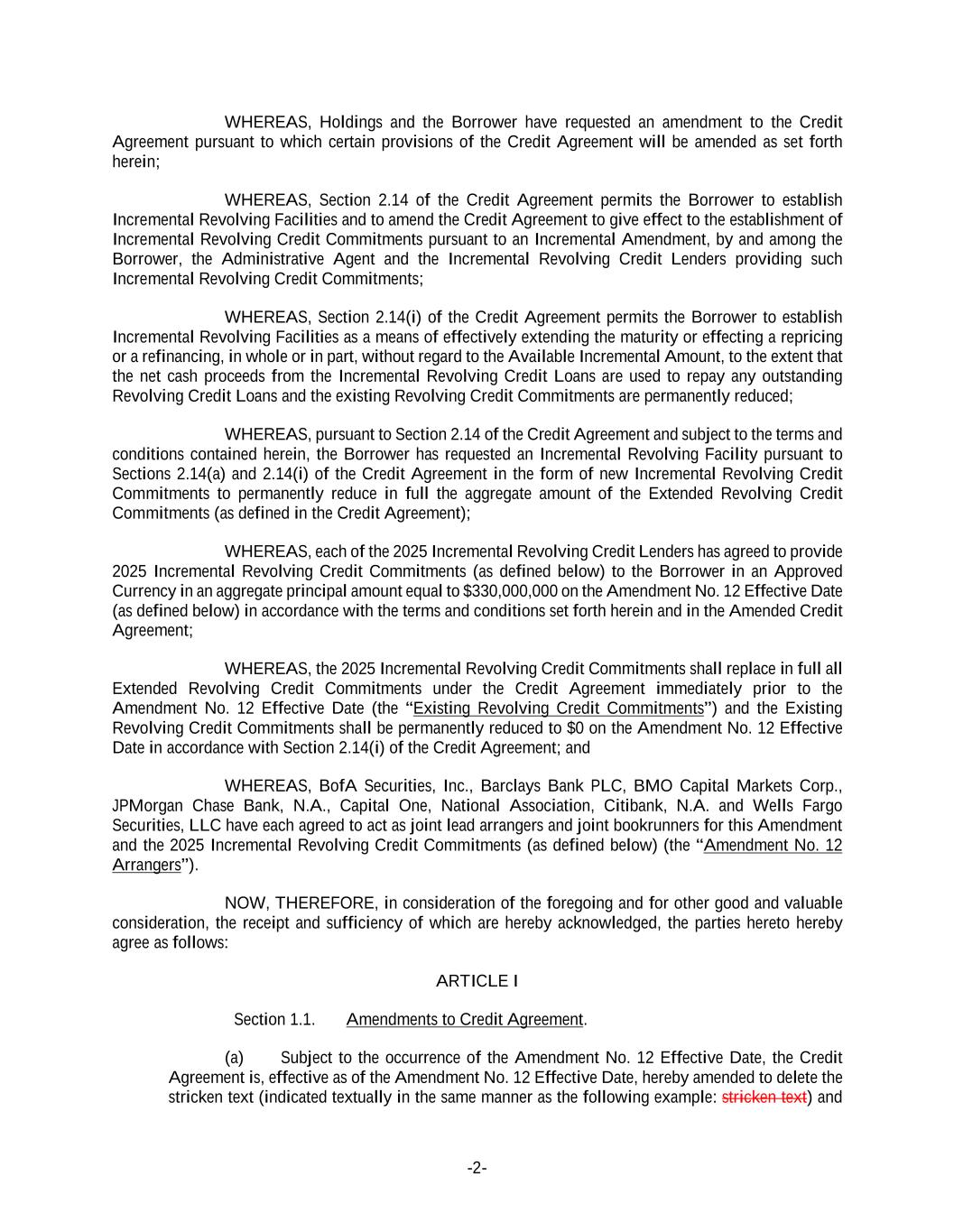 -2- WHEREAS, Holdings and the Borrower have requested an amendment to the Credit Agreement pursuant to which certain provisions of the Credit Agreement will be amended as set forth herein; WHEREAS, Section 2.14 of the Credit Agreement permits the Borrower to establish Incremental Revolving Facilities and to amend the Credit Agreement to give effect to the establishment of Incremental Revolving Credit Commitments pursuant to an Incremental Amendment, by and among the Borrower, the Administrative Agent and the Incremental Revolving Credit Lenders providing such Incremental Revolving Credit Commitments; WHEREAS, Section 2.14(i) of the Credit Agreement permits the Borrower to establish Incremental Revolving Facilities as a means of effectively extending the maturity or effecting a repricing or a refinancing, in whole or in part, without regard to the Available Incremental Amount, to the extent that the net cash proceeds from the Incremental Revolving Credit Loans are used to repay any outstanding Revolving Credit Loans and the existing Revolving Credit Commitments are permanently reduced; WHEREAS, pursuant to Section 2.14 of the Credit Agreement and subject to the terms and conditions contained herein, the Borrower has requested an Incremental Revolving Facility pursuant to Sections 2.14(a) and 2.14(i) of the Credit Agreement in the form of new Incremental Revolving Credit Commitments to permanently reduce in full the aggregate amount of the Extended Revolving Credit Commitments (as defined in the Credit Agreement); WHEREAS, each of the 2025 Incremental Revolving Credit Lenders has agreed to provide 2025 Incremental Revolving Credit Commitments (as defined below) to the Borrower in an Approved Currency in an aggregate principal amount equal to $330,000,000 on the Amendment No. 12 Effective Date (as defined below) in accordance with the terms and conditions set forth herein and in the Amended Credit Agreement; WHEREAS, the 2025 Incremental Revolving Credit Commitments shall replace in full all Extended Revolving Credit Commitments under the Credit Agreement immediately prior to the Amendment No. 12 Effective Date (the “Existing Revolving Credit Commitments”) and the Existing Revolving Credit Commitments shall be permanently reduced to $0 on the Amendment No. 12 Effective Date in accordance with Section 2.14(i) of the Credit Agreement; and WHEREAS, BofA Securities, Inc., Barclays Bank PLC, BMO Capital Markets Corp., JPMorgan Chase Bank, N.A., Capital One, National Association, Citibank, N.A. and Wells Fargo Securities, LLC have each agreed to act as joint lead arrangers and joint bookrunners for this Amendment and the 2025 Incremental Revolving Credit Commitments (as defined below) (the “Amendment No. 12 Arrangers”). NOW, THEREFORE, in consideration of the foregoing and for other good and valuable consideration, the receipt and sufficiency of which are hereby acknowledged, the parties hereto hereby agree as follows: ARTICLE I Section 1.1. Amendments to Credit Agreement. (a) Subject to the occurrence of the Amendment No. 12 Effective Date, the Credit Agreement is, effective as of the Amendment No. 12 Effective Date, hereby amended to delete the stricken text (indicated textually in the same manner as the following example: stricken text) and