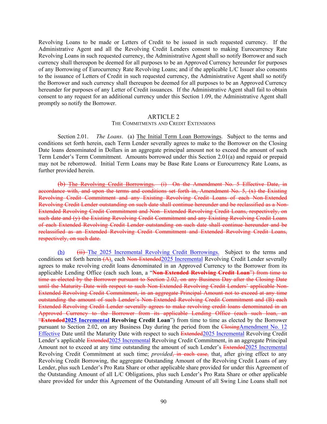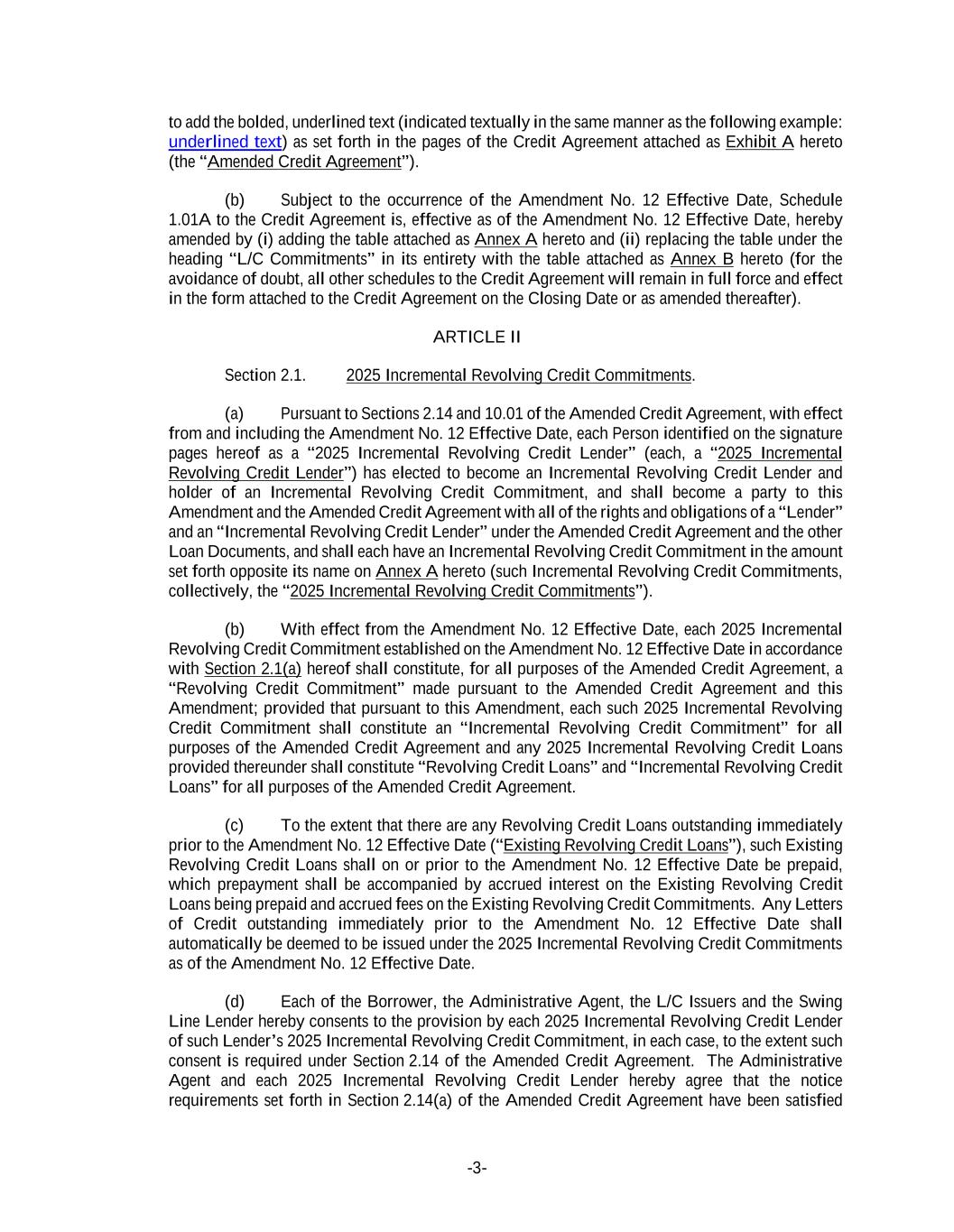 -3- to add the bolded, underlined text (indicated textually in the same manner as the following example: underlined text) as set forth in the pages of the Credit Agreement attached as Exhibit A hereto (the “Amended Credit Agreement”). (b) Subject to the occurrence of the Amendment No. 12 Effective Date, Schedule 1.01A to the Credit Agreement is, effective as of the Amendment No. 12 Effective Date, hereby amended by (i) adding the table attached as Annex A hereto and (ii) replacing the table under the heading “L/C Commitments” in its entirety with the table attached as Annex B hereto (for the avoidance of doubt, all other schedules to the Credit Agreement will remain in full force and effect in the form attached to the Credit Agreement on the Closing Date or as amended thereafter). ARTICLE II Section 2.1. 2025 Incremental Revolving Credit Commitments. (a) Pursuant to Sections 2.14 and 10.01 of the Amended Credit Agreement, with effect from and including the Amendment No. 12 Effective Date, each Person identified on the signature pages hereof as a “2025 Incremental Revolving Credit Lender” (each, a “2025 Incremental Revolving Credit Lender”) has elected to become an Incremental Revolving Credit Lender and holder of an Incremental Revolving Credit Commitment, and shall become a party to this Amendment and the Amended Credit Agreement with all of the rights and obligations of a “Lender” and an “Incremental Revolving Credit Lender” under the Amended Credit Agreement and the other Loan Documents, and shall each have an Incremental Revolving Credit Commitment in the amount set forth opposite its name on Annex A hereto (such Incremental Revolving Credit Commitments, collectively, the “2025 Incremental Revolving Credit Commitments”). (b) With effect from the Amendment No. 12 Effective Date, each 2025 Incremental Revolving Credit Commitment established on the Amendment No. 12 Effective Date in accordance with Section 2.1(a) hereof shall constitute, for all purposes of the Amended Credit Agreement, a “Revolving Credit Commitment” made pursuant to the Amended Credit Agreement and this Amendment; provided that pursuant to this Amendment, each such 2025 Incremental Revolving Credit Commitment shall constitute an “Incremental Revolving Credit Commitment” for all purposes of the Amended Credit Agreement and any 2025 Incremental Revolving Credit Loans provided thereunder shall constitute “Revolving Credit Loans” and “Incremental Revolving Credit Loans” for all purposes of the Amended Credit Agreement. (c) To the extent that there are any Revolving Credit Loans outstanding immediately prior to the Amendment No. 12 Effective Date (“Existing Revolving Credit Loans”), such Existing Revolving Credit Loans shall on or prior to the Amendment No. 12 Effective Date be prepaid, which prepayment shall be accompanied by accrued interest on the Existing Revolving Credit Loans being prepaid and accrued fees on the Existing Revolving Credit Commitments. Any Letters of Credit outstanding immediately prior to the Amendment No. 12 Effective Date shall automatically be deemed to be issued under the 2025 Incremental Revolving Credit Commitments as of the Amendment No. 12 Effective Date. (d) Each of the Borrower, the Administrative Agent, the L/C Issuers and the Swing Line Lender hereby consents to the provision by each 2025 Incremental Revolving Credit Lender of such Lender’s 2025 Incremental Revolving Credit Commitment, in each case, to the extent such consent is required under Section 2.14 of the Amended Credit Agreement. The Administrative Agent and each 2025 Incremental Revolving Credit Lender hereby agree that the notice requirements set forth in Section 2.14(a) of the Amended Credit Agreement have been satisfied