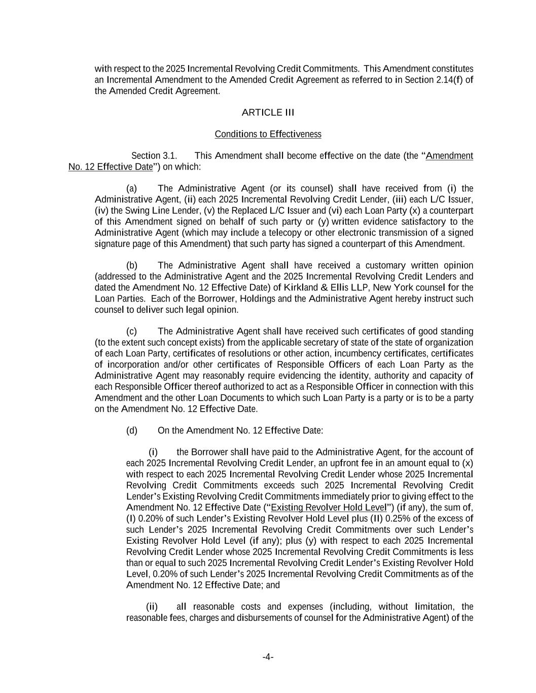 -4- with respect to the 2025 Incremental Revolving Credit Commitments. This Amendment constitutes an Incremental Amendment to the Amended Credit Agreement as referred to in Section 2.14(f) of the Amended Credit Agreement. ARTICLE III Conditions to Effectiveness Section 3.1. This Amendment shall become effective on the date (the “Amendment No. 12 Effective Date”) on which: (a) The Administrative Agent (or its counsel) shall have received from (i) the Administrative Agent, (ii) each 2025 Incremental Revolving Credit Lender, (iii) each L/C Issuer, (iv) the Swing Line Lender, (v) the Replaced L/C Issuer and (vi) each Loan Party (x) a counterpart of this Amendment signed on behalf of such party or (y) written evidence satisfactory to the Administrative Agent (which may include a telecopy or other electronic transmission of a signed signature page of this Amendment) that such party has signed a counterpart of this Amendment. (b) The Administrative Agent shall have received a customary written opinion (addressed to the Administrative Agent and the 2025 Incremental Revolving Credit Lenders and dated the Amendment No. 12 Effective Date) of Kirkland & Ellis LLP, New York counsel for the Loan Parties. Each of the Borrower, Holdings and the Administrative Agent hereby instruct such counsel to deliver such legal opinion. (c) The Administrative Agent shall have received such certificates of good standing (to the extent such concept exists) from the applicable secretary of state of the state of organization of each Loan Party, certificates of resolutions or other action, incumbency certificates, certificates of incorporation and/or other certificates of Responsible Officers of each Loan Party as the Administrative Agent may reasonably require evidencing the identity, authority and capacity of each Responsible Officer thereof authorized to act as a Responsible Officer in connection with this Amendment and the other Loan Documents to which such Loan Party is a party or is to be a party on the Amendment No. 12 Effective Date. (d) On the Amendment No. 12 Effective Date: (i) the Borrower shall have paid to the Administrative Agent, for the account of each 2025 Incremental Revolving Credit Lender, an upfront fee in an amount equal to (x) with respect to each 2025 Incremental Revolving Credit Lender whose 2025 Incremental Revolving Credit Commitments exceeds such 2025 Incremental Revolving Credit Lender’s Existing Revolving Credit Commitments immediately prior to giving effect to the Amendment No. 12 Effective Date (“Existing Revolver Hold Level”) (if any), the sum of, (I) 0.20% of such Lender’s Existing Revolver Hold Level plus (II) 0.25% of the excess of such Lender’s 2025 Incremental Revolving Credit Commitments over such Lender’s Existing Revolver Hold Level (if any); plus (y) with respect to each 2025 Incremental Revolving Credit Lender whose 2025 Incremental Revolving Credit Commitments is less than or equal to such 2025 Incremental Revolving Credit Lender’s Existing Revolver Hold Level, 0.20% of such Lender’s 2025 Incremental Revolving Credit Commitments as of the Amendment No. 12 Effective Date; and (ii) all reasonable costs and expenses (including, without limitation, the reasonable fees, charges and disbursements of counsel for the Administrative Agent) of the