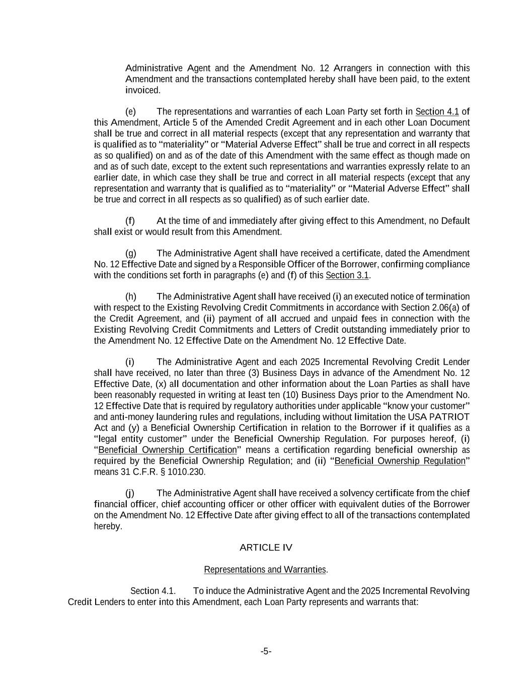 -5- Administrative Agent and the Amendment No. 12 Arrangers in connection with this Amendment and the transactions contemplated hereby shall have been paid, to the extent invoiced. (e) The representations and warranties of each Loan Party set forth in Section 4.1 of this Amendment, Article 5 of the Amended Credit Agreement and in each other Loan Document shall be true and correct in all material respects (except that any representation and warranty that is qualified as to “materiality” or “Material Adverse Effect” shall be true and correct in all respects as so qualified) on and as of the date of this Amendment with the same effect as though made on and as of such date, except to the extent such representations and warranties expressly relate to an earlier date, in which case they shall be true and correct in all material respects (except that any representation and warranty that is qualified as to “materiality” or “Material Adverse Effect” shall be true and correct in all respects as so qualified) as of such earlier date. (f) At the time of and immediately after giving effect to this Amendment, no Default shall exist or would result from this Amendment. (g) The Administrative Agent shall have received a certificate, dated the Amendment No. 12 Effective Date and signed by a Responsible Officer of the Borrower, confirming compliance with the conditions set forth in paragraphs (e) and (f) of this Section 3.1. (h) The Administrative Agent shall have received (i) an executed notice of termination with respect to the Existing Revolving Credit Commitments in accordance with Section 2.06(a) of the Credit Agreement, and (ii) payment of all accrued and unpaid fees in connection with the Existing Revolving Credit Commitments and Letters of Credit outstanding immediately prior to the Amendment No. 12 Effective Date on the Amendment No. 12 Effective Date. (i) The Administrative Agent and each 2025 Incremental Revolving Credit Lender shall have received, no later than three (3) Business Days in advance of the Amendment No. 12 Effective Date, (x) all documentation and other information about the Loan Parties as shall have been reasonably requested in writing at least ten (10) Business Days prior to the Amendment No. 12 Effective Date that is required by regulatory authorities under applicable “know your customer” and anti-money laundering rules and regulations, including without limitation the USA PATRIOT Act and (y) a Beneficial Ownership Certification in relation to the Borrower if it qualifies as a “legal entity customer” under the Beneficial Ownership Regulation. For purposes hereof, (i) “Beneficial Ownership Certification” means a certification regarding beneficial ownership as required by the Beneficial Ownership Regulation; and (ii) “Beneficial Ownership Regulation” means 31 C.F.R. § 1010.230. (j) The Administrative Agent shall have received a solvency certificate from the chief financial officer, chief accounting officer or other officer with equivalent duties of the Borrower on the Amendment No. 12 Effective Date after giving effect to all of the transactions contemplated hereby. ARTICLE IV Representations and Warranties. Section 4.1. To induce the Administrative Agent and the 2025 Incremental Revolving Credit Lenders to enter into this Amendment, each Loan Party represents and warrants that: