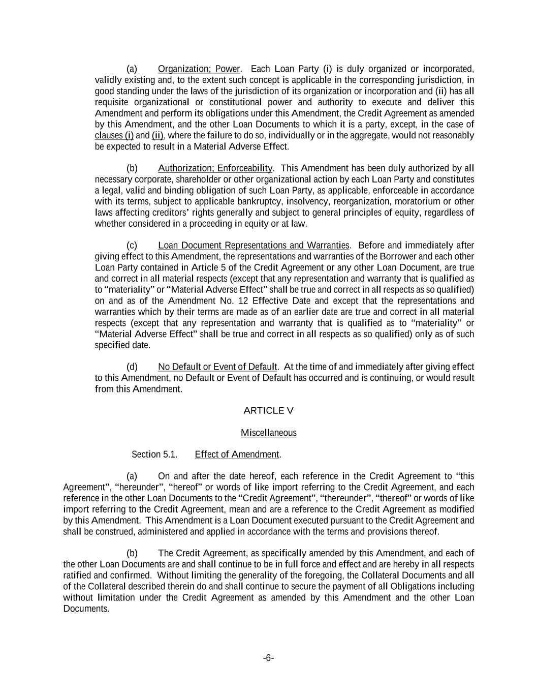 -6- (a) Organization; Power. Each Loan Party (i) is duly organized or incorporated, validly existing and, to the extent such concept is applicable in the corresponding jurisdiction, in good standing under the laws of the jurisdiction of its organization or incorporation and (ii) has all requisite organizational or constitutional power and authority to execute and deliver this Amendment and perform its obligations under this Amendment, the Credit Agreement as amended by this Amendment, and the other Loan Documents to which it is a party, except, in the case of clauses (i) and (ii), where the failure to do so, individually or in the aggregate, would not reasonably be expected to result in a Material Adverse Effect. (b) Authorization; Enforceability. This Amendment has been duly authorized by all necessary corporate, shareholder or other organizational action by each Loan Party and constitutes a legal, valid and binding obligation of such Loan Party, as applicable, enforceable in accordance with its terms, subject to applicable bankruptcy, insolvency, reorganization, moratorium or other laws affecting creditors’ rights generally and subject to general principles of equity, regardless of whether considered in a proceeding in equity or at law. (c) Loan Document Representations and Warranties. Before and immediately after giving effect to this Amendment, the representations and warranties of the Borrower and each other Loan Party contained in Article 5 of the Credit Agreement or any other Loan Document, are true and correct in all material respects (except that any representation and warranty that is qualified as to “materiality” or “Material Adverse Effect” shall be true and correct in all respects as so qualified) on and as of the Amendment No. 12 Effective Date and except that the representations and warranties which by their terms are made as of an earlier date are true and correct in all material respects (except that any representation and warranty that is qualified as to “materiality” or “Material Adverse Effect” shall be true and correct in all respects as so qualified) only as of such specified date. (d) No Default or Event of Default. At the time of and immediately after giving effect to this Amendment, no Default or Event of Default has occurred and is continuing, or would result from this Amendment. ARTICLE V Miscellaneous Section 5.1. Effect of Amendment. (a) On and after the date hereof, each reference in the Credit Agreement to “this Agreement”, “hereunder”, “hereof” or words of like import referring to the Credit Agreement, and each reference in the other Loan Documents to the “Credit Agreement”, “thereunder”, “thereof” or words of like import referring to the Credit Agreement, mean and are a reference to the Credit Agreement as modified by this Amendment. This Amendment is a Loan Document executed pursuant to the Credit Agreement and shall be construed, administered and applied in accordance with the terms and provisions thereof. (b) The Credit Agreement, as specifically amended by this Amendment, and each of the other Loan Documents are and shall continue to be in full force and effect and are hereby in all respects ratified and confirmed. Without limiting the generality of the foregoing, the Collateral Documents and all of the Collateral described therein do and shall continue to secure the payment of all Obligations including without limitation under the Credit Agreement as amended by this Amendment and the other Loan Documents.