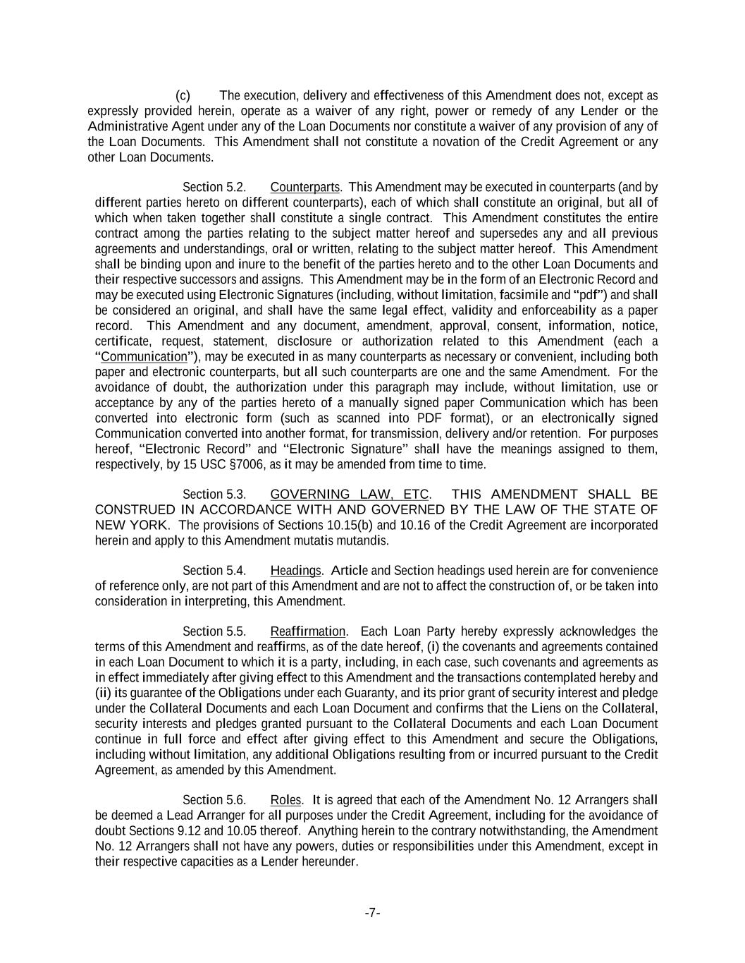 -7- (c) The execution, delivery and effectiveness of this Amendment does not, except as expressly provided herein, operate as a waiver of any right, power or remedy of any Lender or the Administrative Agent under any of the Loan Documents nor constitute a waiver of any provision of any of the Loan Documents. This Amendment shall not constitute a novation of the Credit Agreement or any other Loan Documents. Section 5.2. Counterparts. This Amendment may be executed in counterparts (and by different parties hereto on different counterparts), each of which shall constitute an original, but all of which when taken together shall constitute a single contract. This Amendment constitutes the entire contract among the parties relating to the subject matter hereof and supersedes any and all previous agreements and understandings, oral or written, relating to the subject matter hereof. This Amendment shall be binding upon and inure to the benefit of the parties hereto and to the other Loan Documents and their respective successors and assigns. This Amendment may be in the form of an Electronic Record and may be executed using Electronic Signatures (including, without limitation, facsimile and “pdf”) and shall be considered an original, and shall have the same legal effect, validity and enforceability as a paper record. This Amendment and any document, amendment, approval, consent, information, notice, certificate, request, statement, disclosure or authorization related to this Amendment (each a “Communication”), may be executed in as many counterparts as necessary or convenient, including both paper and electronic counterparts, but all such counterparts are one and the same Amendment. For the avoidance of doubt, the authorization under this paragraph may include, without limitation, use or acceptance by any of the parties hereto of a manually signed paper Communication which has been converted into electronic form (such as scanned into PDF format), or an electronically signed Communication converted into another format, for transmission, delivery and/or retention. For purposes hereof, “Electronic Record” and “Electronic Signature” shall have the meanings assigned to them, respectively, by 15 USC §7006, as it may be amended from time to time. Section 5.3. GOVERNING LAW, ETC. THIS AMENDMENT SHALL BE CONSTRUED IN ACCORDANCE WITH AND GOVERNED BY THE LAW OF THE STATE OF NEW YORK. The provisions of Sections 10.15(b) and 10.16 of the Credit Agreement are incorporated herein and apply to this Amendment mutatis mutandis. Section 5.4. Headings. Article and Section headings used herein are for convenience of reference only, are not part of this Amendment and are not to affect the construction of, or be taken into consideration in interpreting, this Amendment. Section 5.5. Reaffirmation. Each Loan Party hereby expressly acknowledges the terms of this Amendment and reaffirms, as of the date hereof, (i) the covenants and agreements contained in each Loan Document to which it is a party, including, in each case, such covenants and agreements as in effect immediately after giving effect to this Amendment and the transactions contemplated hereby and (ii) its guarantee of the Obligations under each Guaranty, and its prior grant of security interest and pledge under the Collateral Documents and each Loan Document and confirms that the Liens on the Collateral, security interests and pledges granted pursuant to the Collateral Documents and each Loan Document continue in full force and effect after giving effect to this Amendment and secure the Obligations, including without limitation, any additional Obligations resulting from or incurred pursuant to the Credit Agreement, as amended by this Amendment. Section 5.6. Roles. It is agreed that each of the Amendment No. 12 Arrangers shall be deemed a Lead Arranger for all purposes under the Credit Agreement, including for the avoidance of doubt Sections 9.12 and 10.05 thereof. Anything herein to the contrary notwithstanding, the Amendment No. 12 Arrangers shall not have any powers, duties or responsibilities under this Amendment, except in their respective capacities as a Lender hereunder.
