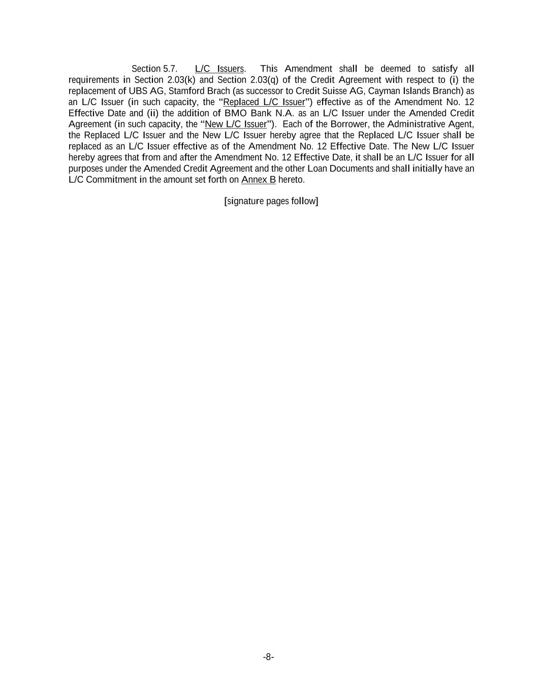 -8- Section 5.7. L/C Issuers. This Amendment shall be deemed to satisfy all requirements in Section 2.03(k) and Section 2.03(q) of the Credit Agreement with respect to (i) the replacement of UBS AG, Stamford Brach (as successor to Credit Suisse AG, Cayman Islands Branch) as an L/C Issuer (in such capacity, the “Replaced L/C Issuer”) effective as of the Amendment No. 12 Effective Date and (ii) the addition of BMO Bank N.A. as an L/C Issuer under the Amended Credit Agreement (in such capacity, the “New L/C Issuer”). Each of the Borrower, the Administrative Agent, the Replaced L/C Issuer and the New L/C Issuer hereby agree that the Replaced L/C Issuer shall be replaced as an L/C Issuer effective as of the Amendment No. 12 Effective Date. The New L/C Issuer hereby agrees that from and after the Amendment No. 12 Effective Date, it shall be an L/C Issuer for all purposes under the Amended Credit Agreement and the other Loan Documents and shall initially have an L/C Commitment in the amount set forth on Annex B hereto. [signature pages follow]