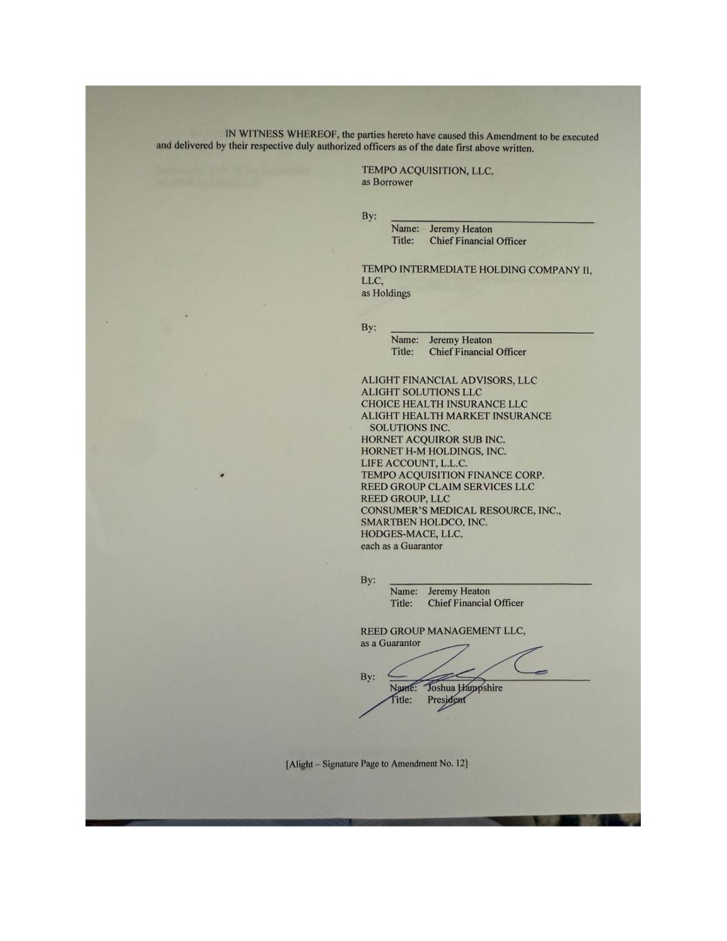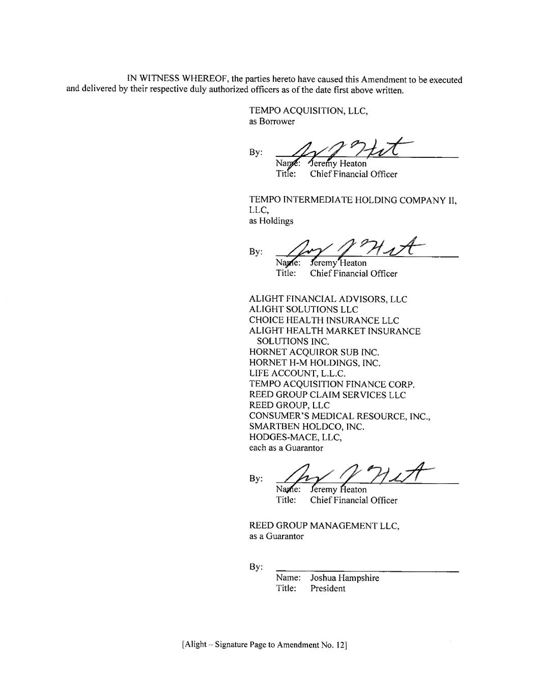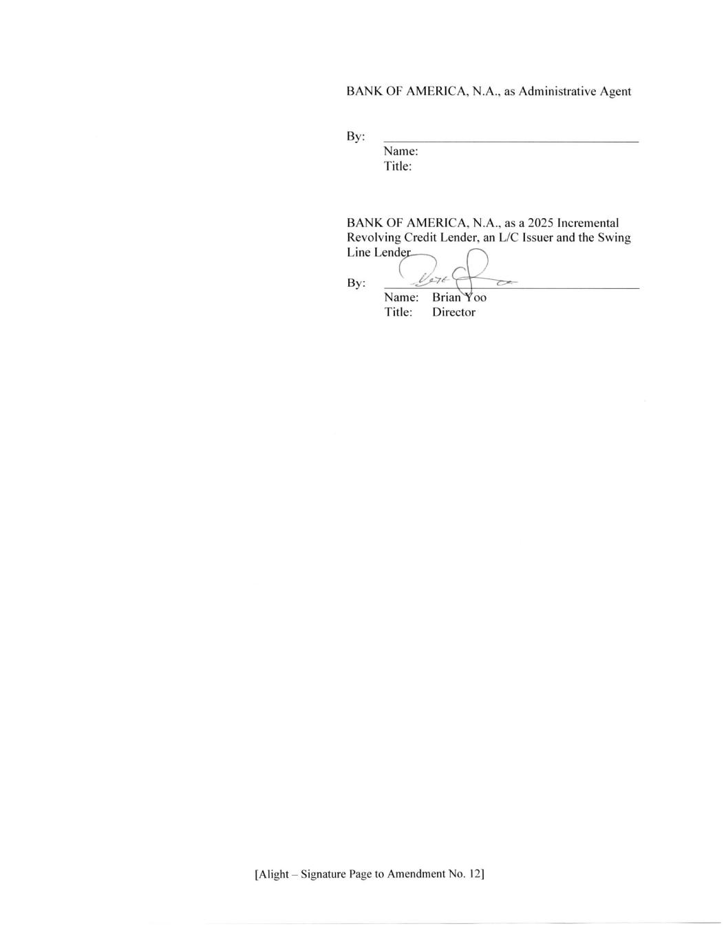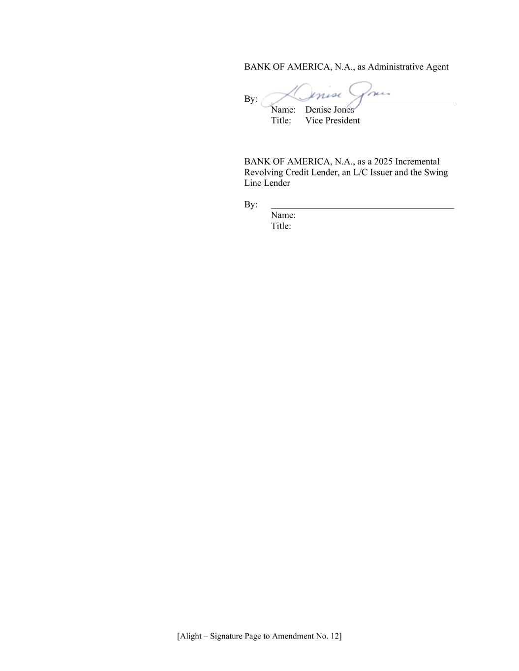 [Alight – Signature Page to Amendment No. 12] BANK OF AMERICA, N.A., as Administrative Agent By: Name: Denise Jones Title: Vice President BANK OF AMERICA, N.A., as a 2025 Incremental Revolving Credit Lender, an L/C Issuer and the Swing Line Lender By: Name: Title: