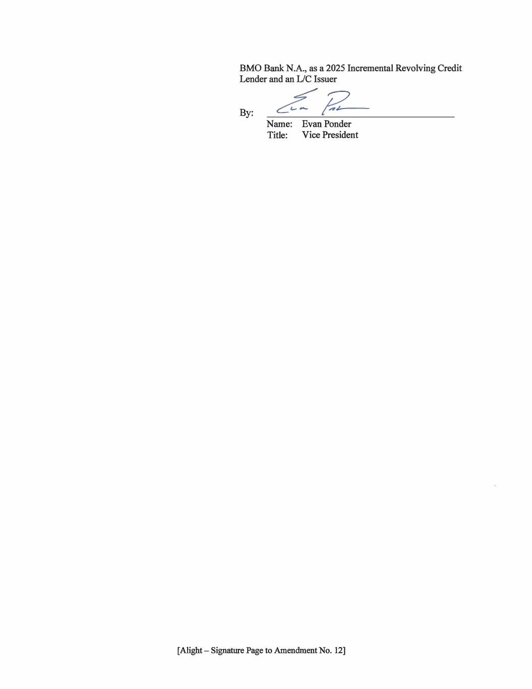 BMO Bank N.A., as a 2025 Incremental Revolving Credit Lender and an L/C Issuer By: Name: Evan Ponder Title: Vice President [Alight- Signature Page to Amendment No. 12]