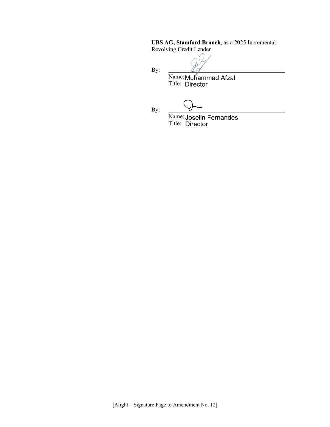 [Alight – Signature Page to Amendment No. 12] UBS AG, Stamford Branch, as a 2025 Incremental Revolving Credit Lender By: Name: Title: By: Name: Title: Joselin Fernandes Director Muhammad Afzal Director