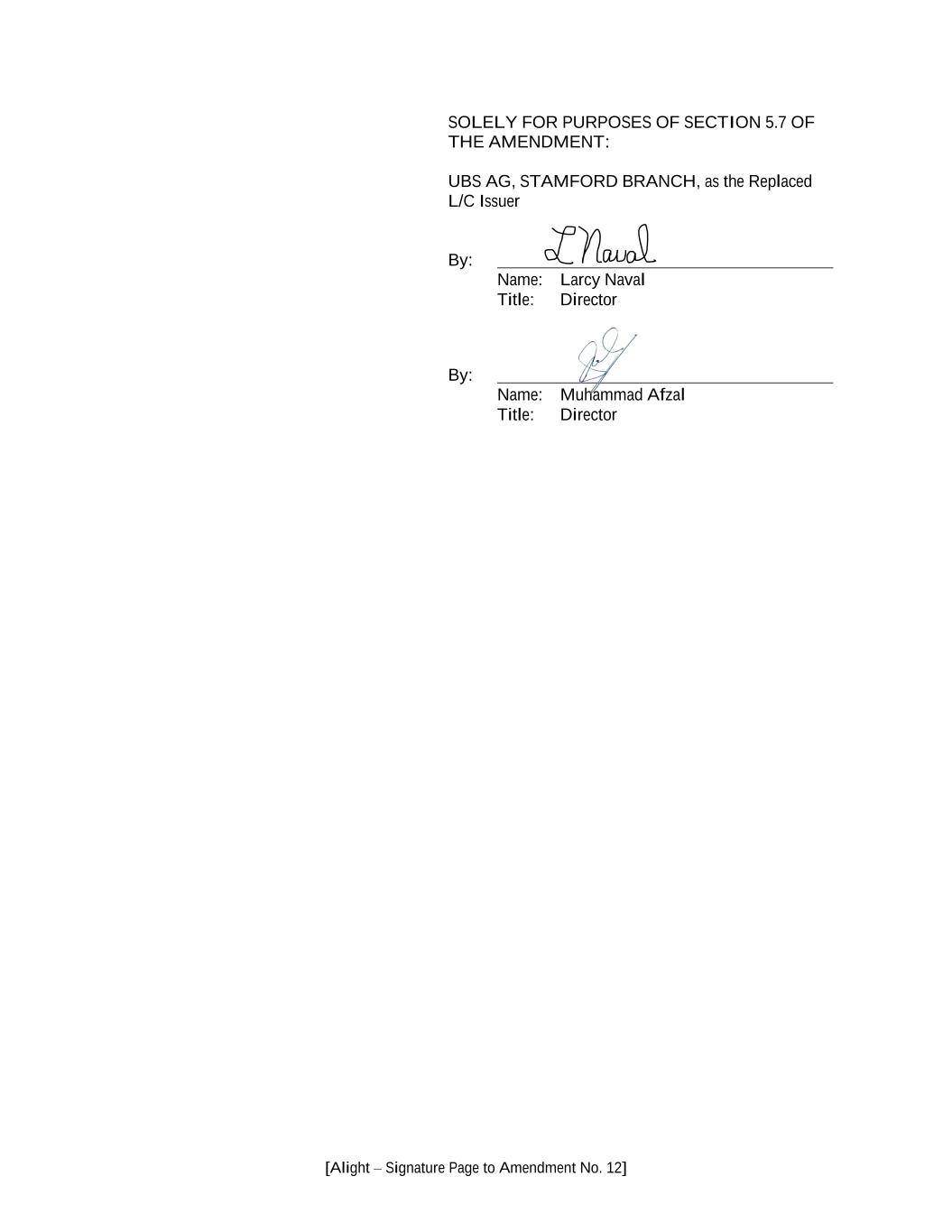 [Alight – Signature Page to Amendment No. 12] SOLELY FOR PURPOSES OF SECTION 5.7 OF THE AMENDMENT: UBS AG, STAMFORD BRANCH, as the Replaced L/C Issuer By: Name: Larcy Naval Title: Director By: Name: Muhammad Afzal Title: Director