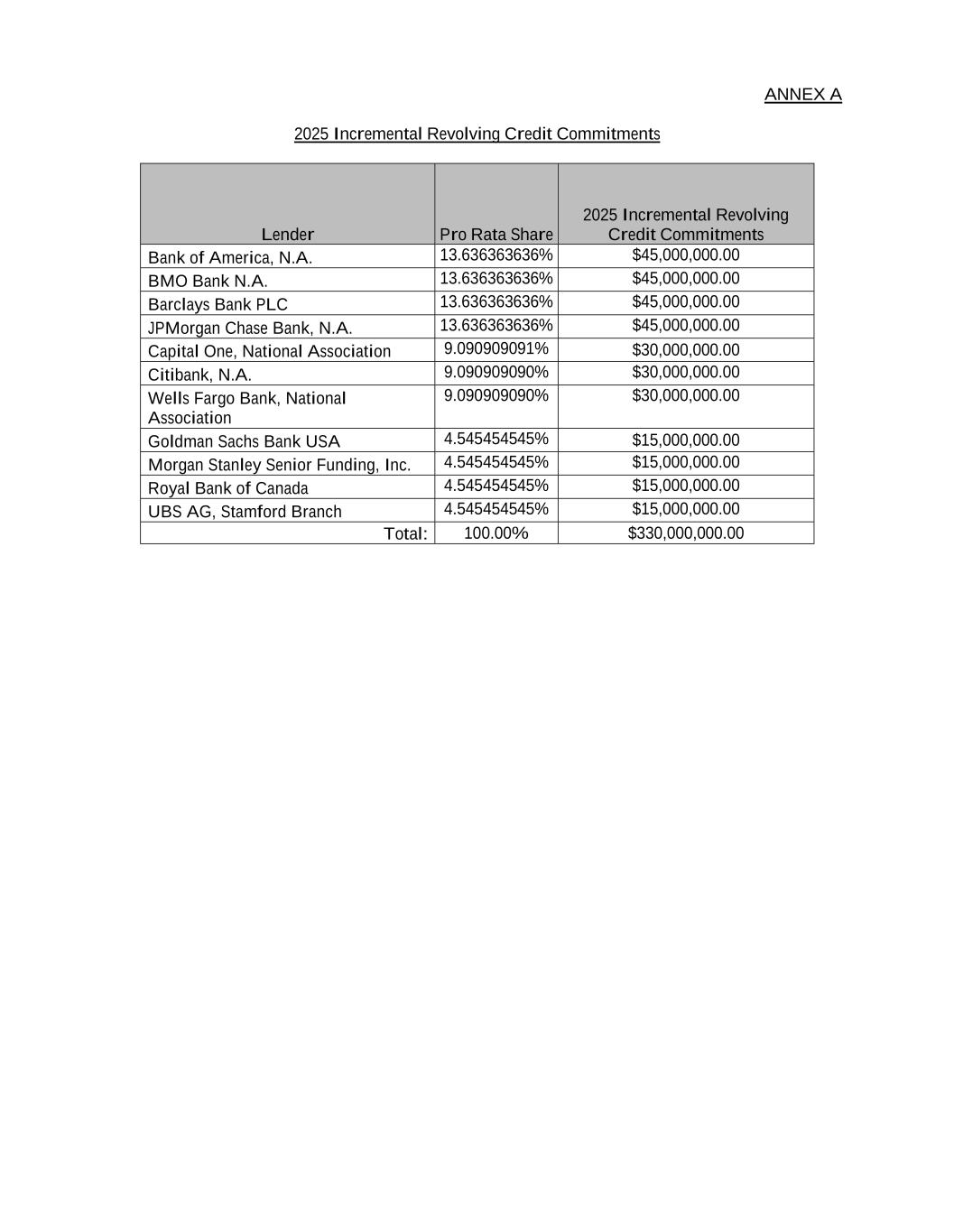 ANNEX A 2025 Incremental Revolving Credit Commitments Lender Pro Rata Share 2025 Incremental Revolving Credit Commitments Bank of America, N.A. 13.636363636% $45,000,000.00 BMO Bank N.A. 13.636363636% $45,000,000.00 Barclays Bank PLC 13.636363636% $45,000,000.00 JPMorgan Chase Bank, N.A. 13.636363636% $45,000,000.00 Capital One, National Association 9.090909091% $30,000,000.00 Citibank, N.A. 9.090909090% $30,000,000.00 Wells Fargo Bank, National Association 9.090909090% $30,000,000.00 Goldman Sachs Bank USA 4.545454545% $15,000,000.00 Morgan Stanley Senior Funding, Inc. 4.545454545% $15,000,000.00 Royal Bank of Canada 4.545454545% $15,000,000.00 UBS AG, Stamford Branch 4.545454545% $15,000,000.00 Total: 100.00% $330,000,000.00
