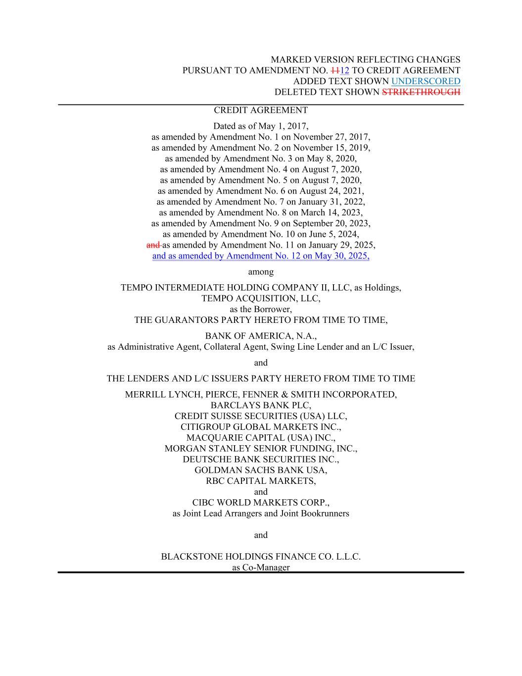 MARKED VERSION REFLECTING CHANGESPURSUANT TO AMENDMENT NO. 1112 TO CREDIT AGREEMENTADDED TEXT SHOWN UNDERSCOREDDELETED TEXT SHOWN STRIKETHROUGHCREDIT AGREEMENTDated as of May 1, 2017,as amended by Amendment No. 1 on November 27, 2017,as amended by Amendment No. 2 on November 15, 2019,as amended by Amendment No. 3 on May 8, 2020,as amended by Amendment No. 4 on August 7, 2020,as amended by Amendment No. 5 on August 7, 2020,as amended by Amendment No. 6 on August 24, 2021,as amended by Amendment No. 7 on January 31, 2022,as amended by Amendment No. 8 on March 14, 2023,as amended by Amendment No. 9 on September 20, 2023,as amended by Amendment No. 10 on June 5, 2024,and as amended by Amendment No. 11 on January 29, 2025,and as amended by Amendment No. 12 on May 30, 2025,amongTEMPO INTERMEDIATE HOLDING COMPANY II, LLC, as Holdings,TEMPO ACQUISITION, LLC,as the Borrower,THE GUARANTORS PARTY HERETO FROM TIME TO TIME,BANK OF AMERICA, N.A.,as Administrative Agent, Collateral Agent, Swing Line Lender and an L/C Issuer,andTHE LENDERS AND L/C ISSUERS PARTY HERETO FROM TIME TO TIMEMERRILL LYNCH, PIERCE, FENNER & SMITH INCORPORATED,BARCLAYS BANK PLC,CREDIT SUISSE SECURITIES (USA) LLC,CITIGROUP GLOBAL MARKETS INC.,MACQUARIE CAPITAL (USA) INC.,MORGAN STANLEY SENIOR FUNDING, INC.,DEUTSCHE BANK SECURITIES INC.,GOLDMAN SACHS BANK USA,RBC CAPITAL MARKETS,andCIBC WORLD MARKETS CORP.,as Joint Lead Arrangers and Joint BookrunnersandBLACKSTONE HOLDINGS FINANCE CO. L.L.C.as Co-Manager
