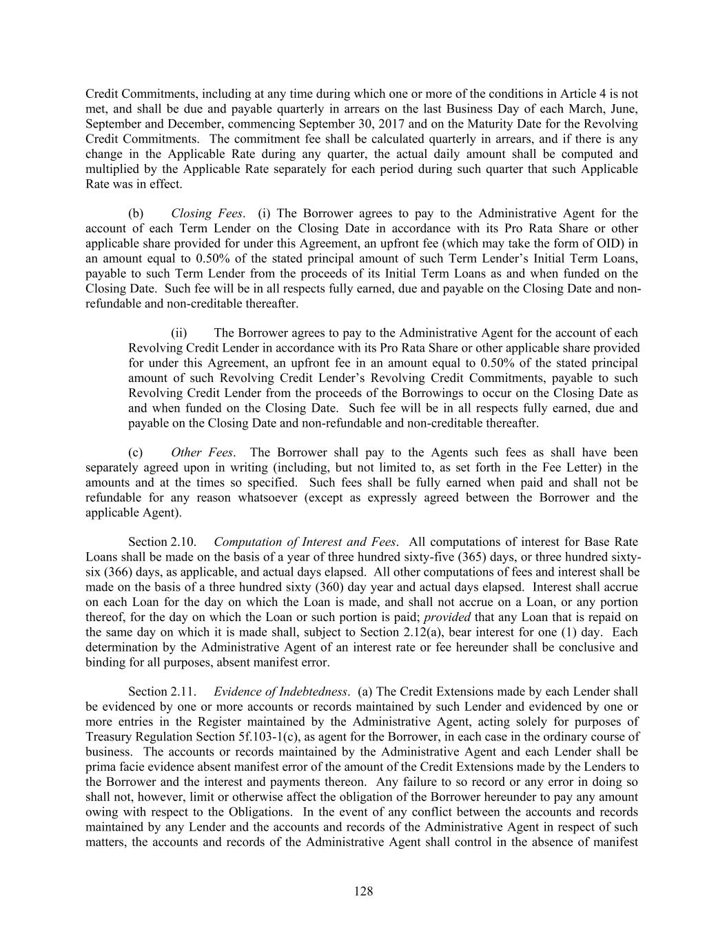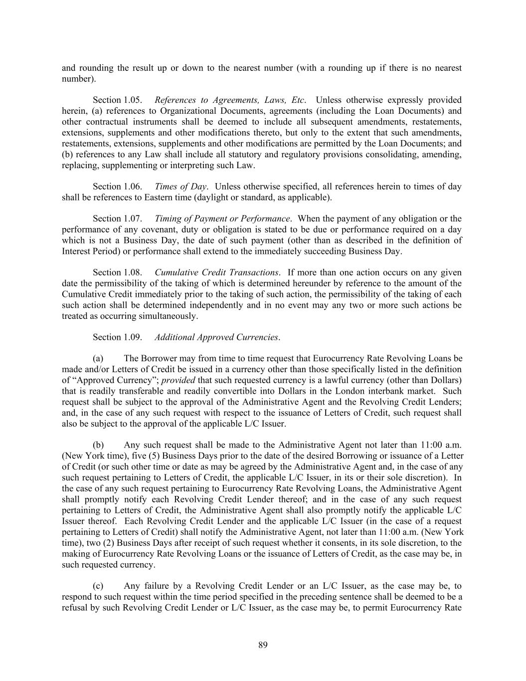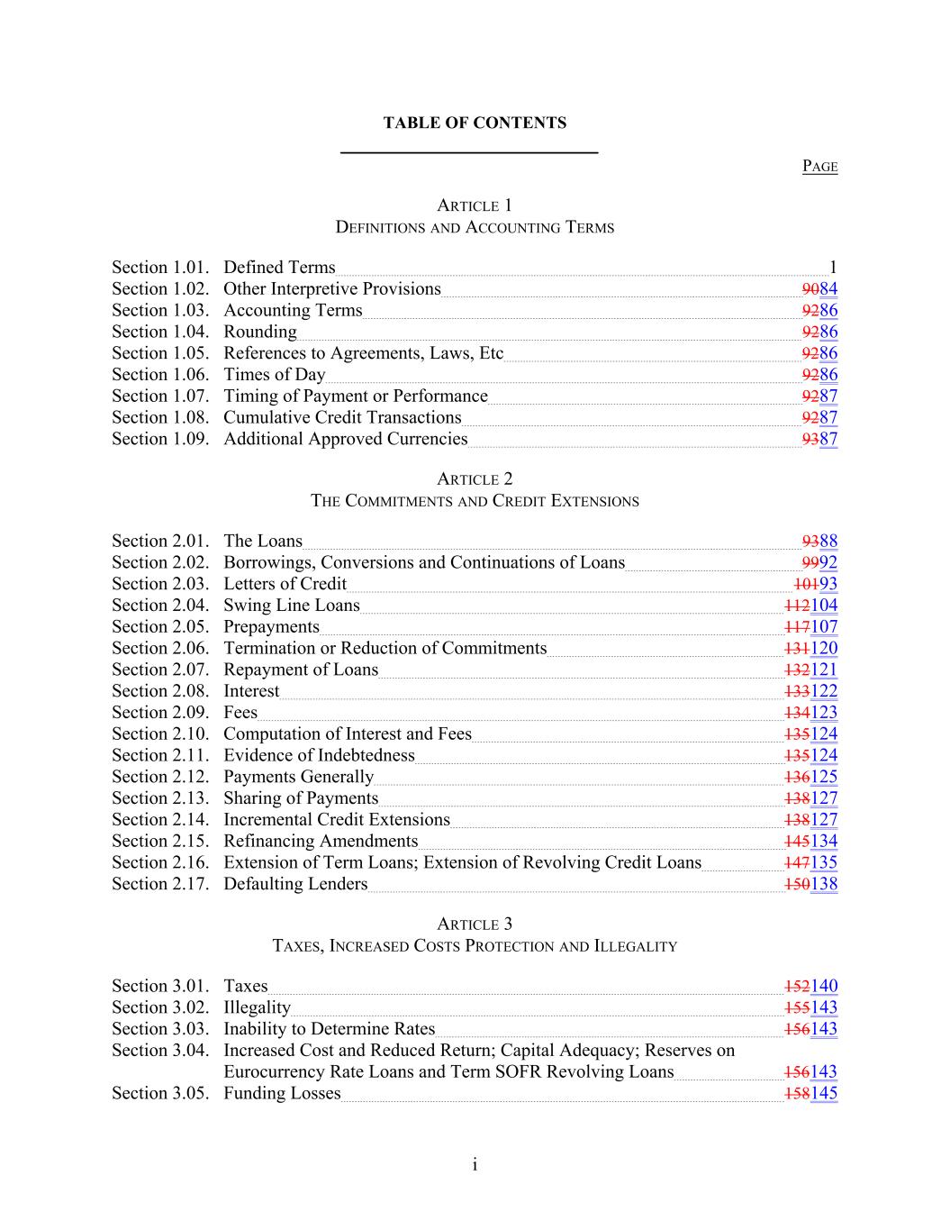 TABLE OF CONTENTS PAGEARTICLE 1DEFINITIONS AND ACCOUNTING TERMSSection 1.01. Defined Terms 1Section 1.02. Other Interpretive Provisions 9084Section 1.03. Accounting Terms 9286Section 1.04. Rounding 9286Section 1.05. References to Agreements, Laws, Etc 9286Section 1.06. Times of Day 9286Section 1.07. Timing of Payment or Performance 9287Section 1.08. Cumulative Credit Transactions 9287Section 1.09. Additional Approved Currencies 9387ARTICLE 2THE COMMITMENTS AND CREDIT EXTENSIONSSection 2.01. The Loans 9388Section 2.02. Borrowings, Conversions and Continuations of Loans 9992Section 2.03. Letters of Credit 10193Section 2.04. Swing Line Loans 112104Section 2.05. Prepayments 117107Section 2.06. Termination or Reduction of Commitments 131120Section 2.07. Repayment of Loans 132121Section 2.08. Interest 133122Section 2.09. Fees 134123Section 2.10. Computation of Interest and Fees 135124Section 2.11. Evidence of Indebtedness 135124Section 2.12. Payments Generally 136125Section 2.13. Sharing of Payments 138127Section 2.14. Incremental Credit Extensions 138127Section 2.15. Refinancing Amendments 145134Section 2.16. Extension of Term Loans; Extension of Revolving Credit Loans 147135Section 2.17. Defaulting Lenders 150138ARTICLE 3TAXES, INCREASED COSTS PROTECTION AND ILLEGALITYSection 3.01. Taxes 152140Section 3.02. Illegality 155143Section 3.03. Inability to Determine Rates 156143Section 3.04. Increased Cost and Reduced Return; Capital Adequacy; Reserves onEurocurrency Rate Loans and Term SOFR Revolving Loans 156143Section 3.05. Funding Losses 158145i