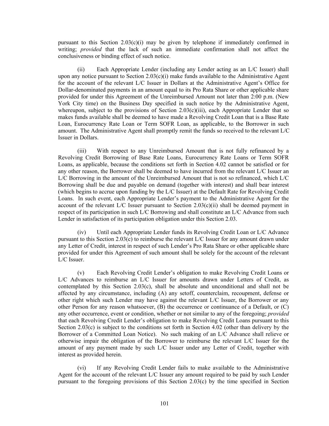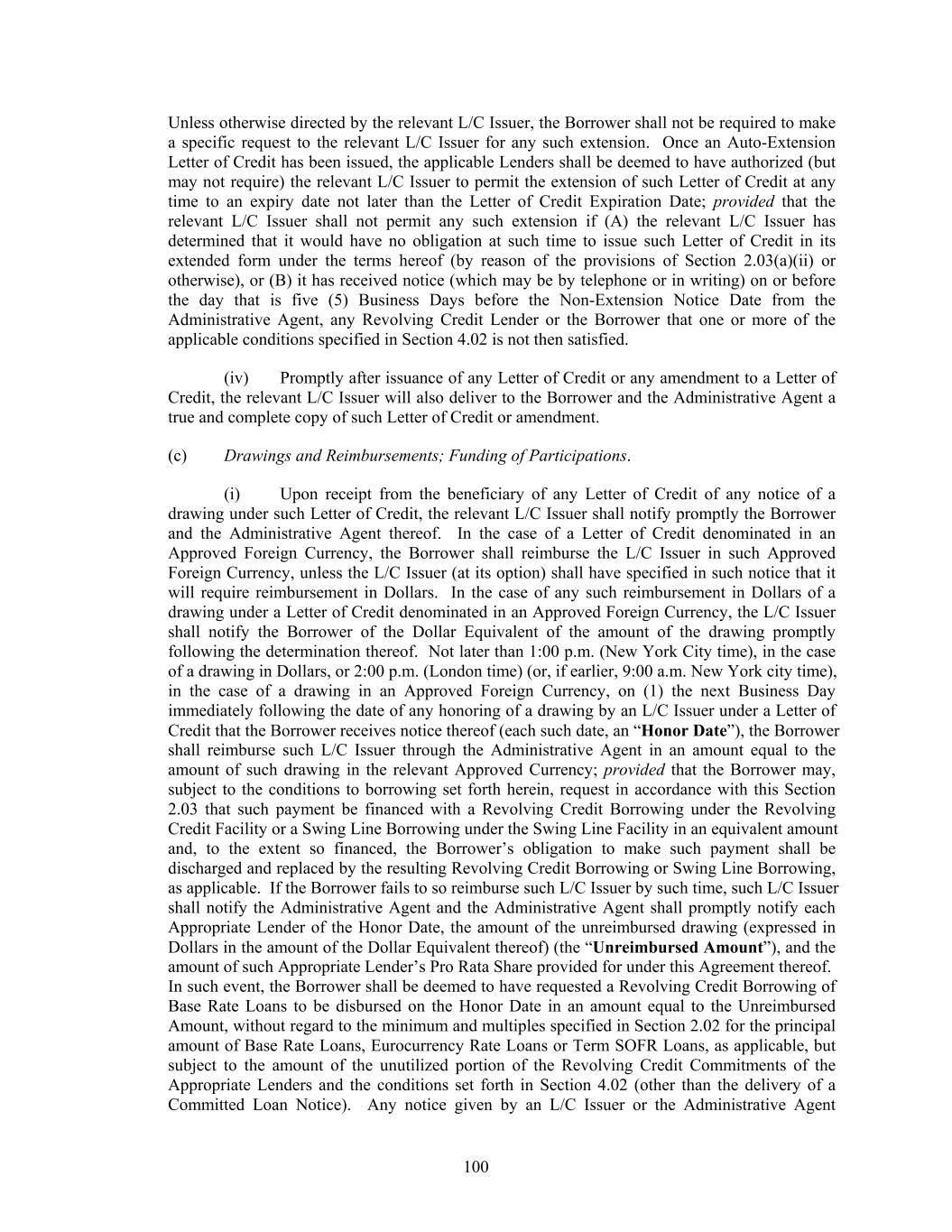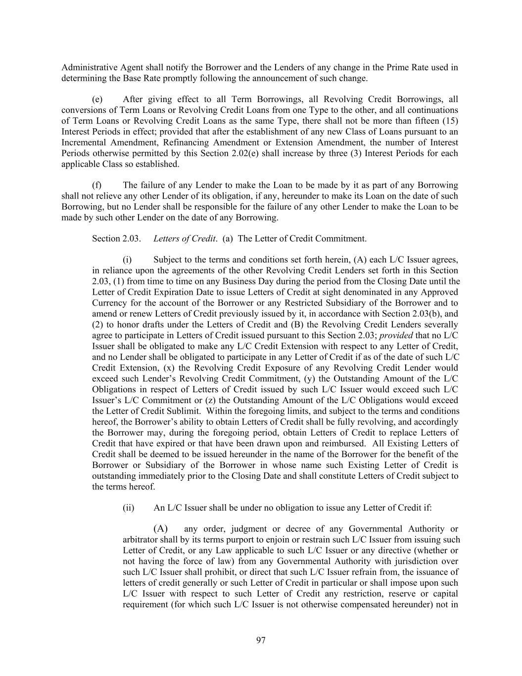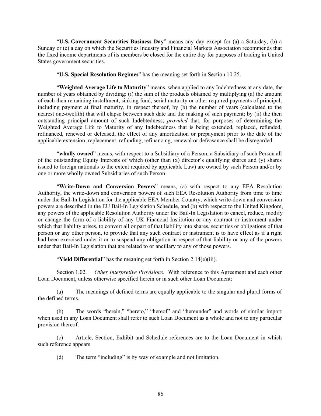 TABLE OF CONTENTS PAGEARTICLE 1DEFINITIONS AND ACCOUNTING TERMSSection 1.01. Defined Terms 1Section 1.02. Other Interpretive Provisions 9084Section 1.03. Accounting Terms 9286Section 1.04. Rounding 9286Section 1.05. References to Agreements, Laws, Etc 9286Section 1.06. Times of Day 9286Section 1.07. Timing of Payment or Performance 9287Section 1.08. Cumulative Credit Transactions 9287Section 1.09. Additional Approved Currencies 9387ARTICLE 2THE COMMITMENTS AND CREDIT EXTENSIONSSection 2.01. The Loans 9388Section 2.02. Borrowings, Conversions and Continuations of Loans 9992Section 2.03. Letters of Credit 10193Section 2.04. Swing Line Loans 112104Section 2.05. Prepayments 117107Section 2.06. Termination or Reduction of Commitments 131120Section 2.07. Repayment of Loans 132121Section 2.08. Interest 133122Section 2.09. Fees 134123Section 2.10. Computation of Interest and Fees 135124Section 2.11. Evidence of Indebtedness 135124Section 2.12. Payments Generally 136125Section 2.13. Sharing of Payments 138127Section 2.14. Incremental Credit Extensions 138127Section 2.15. Refinancing Amendments 145134Section 2.16. Extension of Term Loans; Extension of Revolving Credit Loans 147135Section 2.17. Defaulting Lenders 150138ARTICLE 3TAXES, INCREASED COSTS PROTECTION AND ILLEGALITYSection 3.01. Taxes 152140Section 3.02. Illegality 155143Section 3.03. Inability to Determine Rates 156143Section 3.04. Increased Cost and Reduced Return; Capital Adequacy; Reserves onEurocurrency Rate Loans and Term SOFR Revolving Loans 156143Section 3.05. Funding Losses 158145i