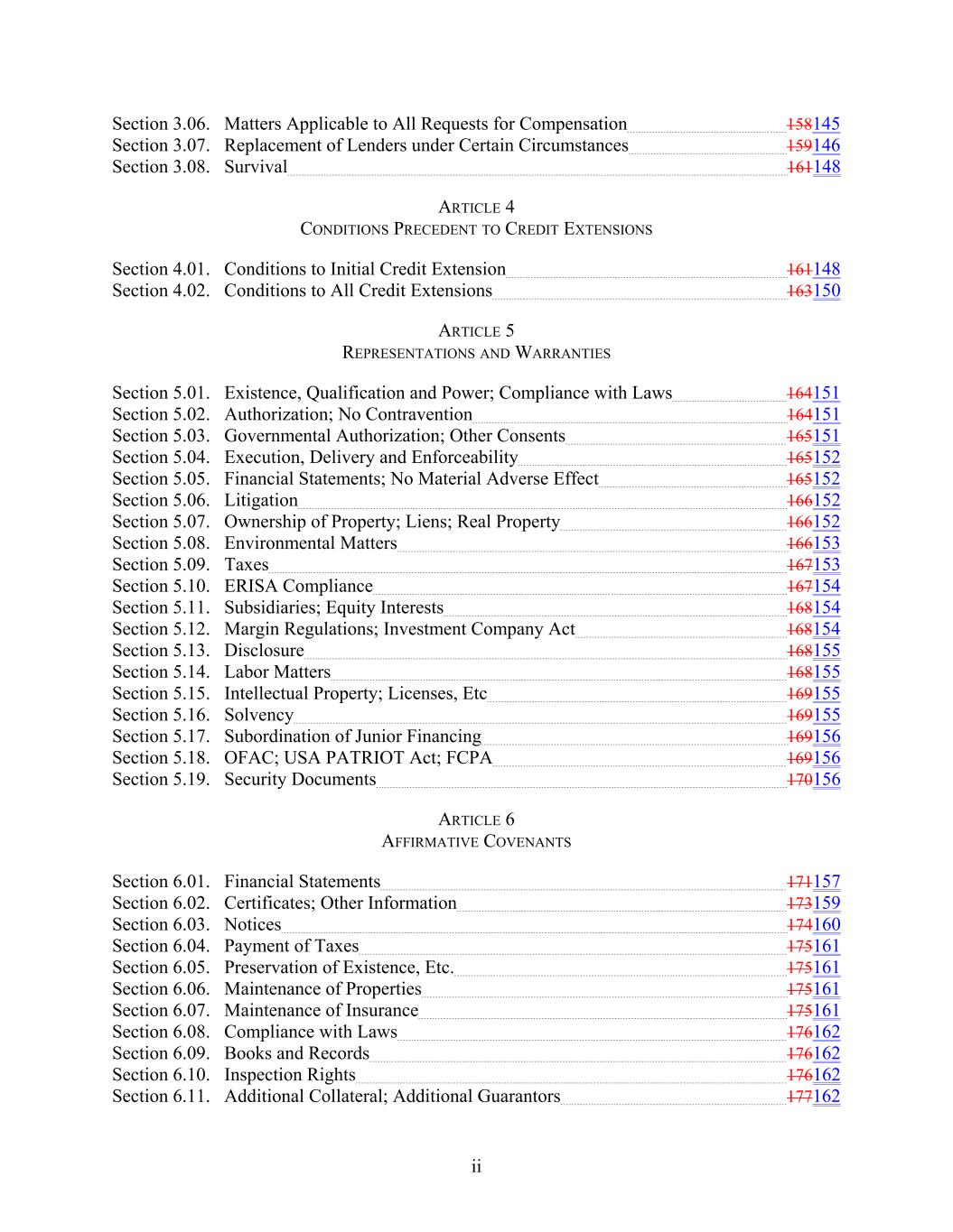 Section 3.06. Matters Applicable to All Requests for Compensation 158145Section 3.07. Replacement of Lenders under Certain Circumstances 159146Section 3.08. Survival 161148ARTICLE 4CONDITIONS PRECEDENT TO CREDIT EXTENSIONSSection 4.01. Conditions to Initial Credit Extension 161148Section 4.02. Conditions to All Credit Extensions 163150ARTICLE 5REPRESENTATIONS AND WARRANTIESSection 5.01. Existence, Qualification and Power; Compliance with Laws 164151Section 5.02. Authorization; No Contravention 164151Section 5.03. Governmental Authorization; Other Consents 165151Section 5.04. Execution, Delivery and Enforceability 165152Section 5.05. Financial Statements; No Material Adverse Effect 165152Section 5.06. Litigation 166152Section 5.07. Ownership of Property; Liens; Real Property 166152Section 5.08. Environmental Matters 166153Section 5.09. Taxes 167153Section 5.10. ERISA Compliance 167154Section 5.11. Subsidiaries; Equity Interests 168154Section 5.12. Margin Regulations; Investment Company Act 168154Section 5.13. Disclosure 168155Section 5.14. Labor Matters 168155Section 5.15. Intellectual Property; Licenses, Etc 169155Section 5.16. Solvency 169155Section 5.17. Subordination of Junior Financing 169156Section 5.18. OFAC; USA PATRIOT Act; FCPA 169156Section 5.19. Security Documents 170156ARTICLE 6AFFIRMATIVE COVENANTSSection 6.01. Financial Statements 171157Section 6.02. Certificates; Other Information 173159Section 6.03. Notices 174160Section 6.04. Payment of Taxes 175161Section 6.05. Preservation of Existence, Etc. 175161Section 6.06. Maintenance of Properties 175161Section 6.07. Maintenance of Insurance 175161Section 6.08. Compliance with Laws 176162Section 6.09. Books and Records 176162Section 6.10. Inspection Rights 176162Section 6.11. Additional Collateral; Additional Guarantors 177162ii