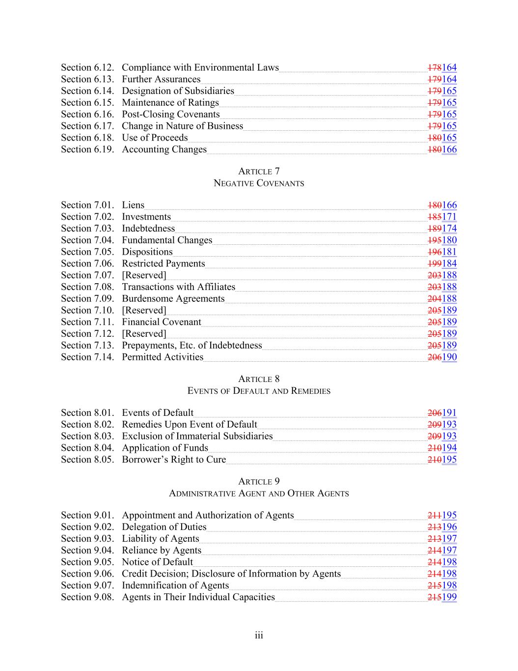 Section 6.12. Compliance with Environmental Laws 178164Section 6.13. Further Assurances 179164Section 6.14. Designation of Subsidiaries 179165Section 6.15. Maintenance of Ratings 179165Section 6.16. Post-Closing Covenants 179165Section 6.17. Change in Nature of Business 179165Section 6.18. Use of Proceeds 180165Section 6.19. Accounting Changes 180166ARTICLE 7NEGATIVE COVENANTSSection 7.01. Liens 180166Section 7.02. Investments 185171Section 7.03. Indebtedness 189174Section 7.04. Fundamental Changes 195180Section 7.05. Dispositions 196181Section 7.06. Restricted Payments 199184Section 7.07. [Reserved] 203188Section 7.08. Transactions with Affiliates 203188Section 7.09. Burdensome Agreements 204188Section 7.10. [Reserved] 205189Section 7.11. Financial Covenant 205189Section 7.12. [Reserved] 205189Section 7.13. Prepayments, Etc. of Indebtedness 205189Section 7.14. Permitted Activities 206190ARTICLE 8EVENTS OF DEFAULT AND REMEDIESSection 8.01. Events of Default 206191Section 8.02. Remedies Upon Event of Default 209193Section 8.03. Exclusion of Immaterial Subsidiaries 209193Section 8.04. Application of Funds 210194Section 8.05. Borrower’s Right to Cure 210195ARTICLE 9ADMINISTRATIVE AGENT AND OTHER AGENTSSection 9.01. Appointment and Authorization of Agents 211195Section 9.02. Delegation of Duties 213196Section 9.03. Liability of Agents 213197Section 9.04. Reliance by Agents 214197Section 9.05. Notice of Default 214198Section 9.06. Credit Decision; Disclosure of Information by Agents 214198Section 9.07. Indemnification of Agents 215198Section 9.08. Agents in Their Individual Capacities 215199iii