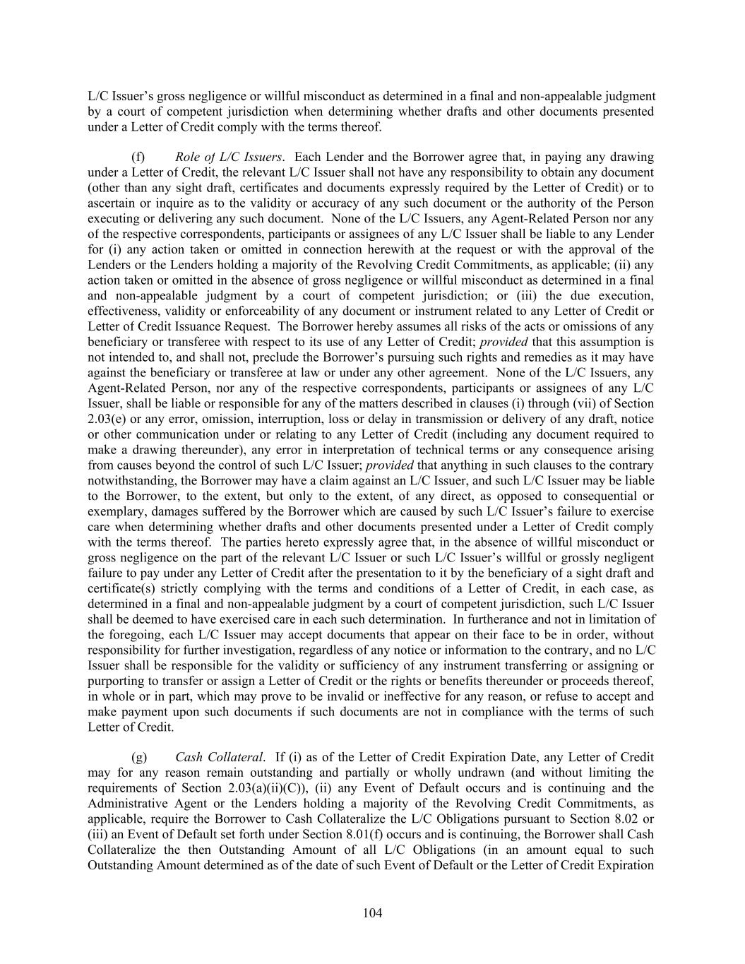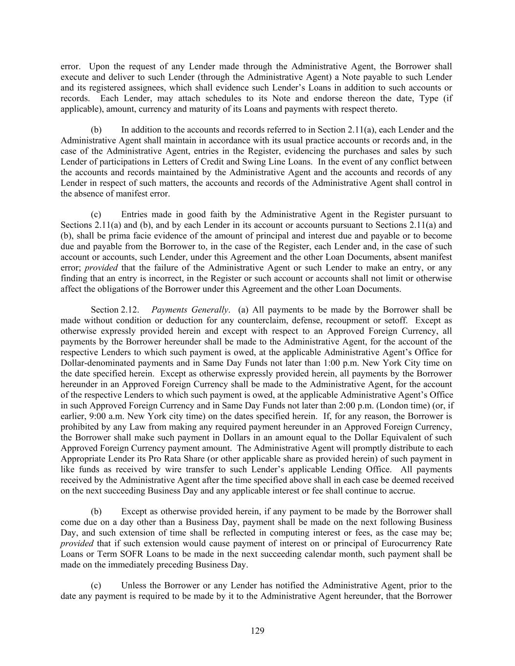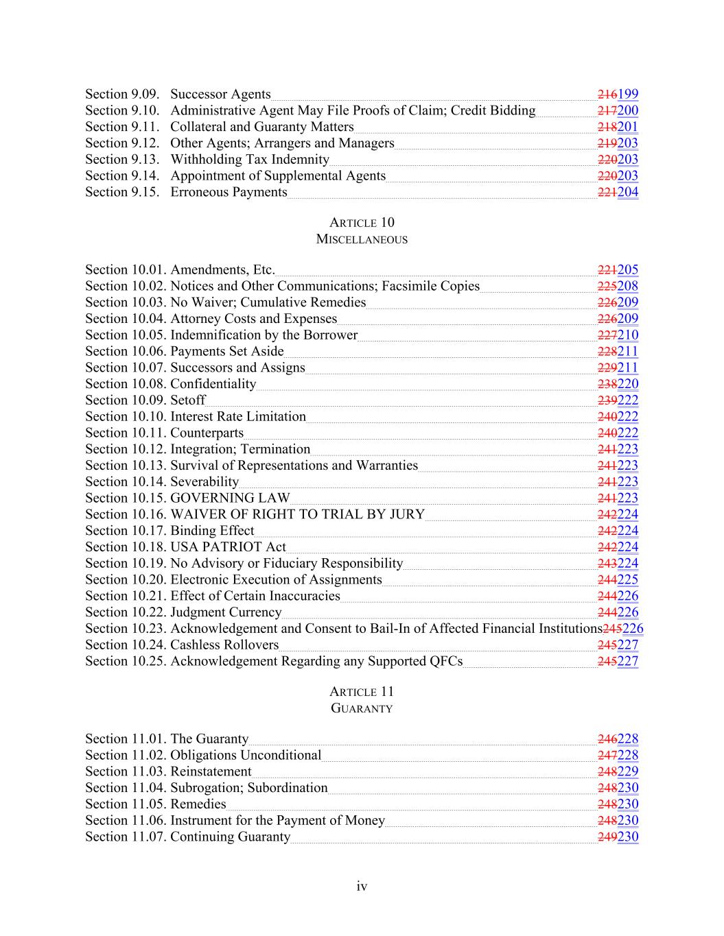 Section 9.09. Successor Agents 216199Section 9.10. Administrative Agent May File Proofs of Claim; Credit Bidding 217200Section 9.11. Collateral and Guaranty Matters 218201Section 9.12. Other Agents; Arrangers and Managers 219203Section 9.13. Withholding Tax Indemnity 220203Section 9.14. Appointment of Supplemental Agents 220203Section 9.15. Erroneous Payments 221204ARTICLE 10MISCELLANEOUSSection 10.01. Amendments, Etc. 221205Section 10.02. Notices and Other Communications; Facsimile Copies 225208Section 10.03. No Waiver; Cumulative Remedies 226209Section 10.04. Attorney Costs and Expenses 226209Section 10.05. Indemnification by the Borrower 227210Section 10.06. Payments Set Aside 228211Section 10.07. Successors and Assigns 229211Section 10.08. Confidentiality 238220Section 10.09. Setoff 239222Section 10.10. Interest Rate Limitation 240222Section 10.11. Counterparts 240222Section 10.12. Integration; Termination 241223Section 10.13. Survival of Representations and Warranties 241223Section 10.14. Severability 241223Section 10.15. GOVERNING LAW 241223Section 10.16. WAIVER OF RIGHT TO TRIAL BY JURY 242224Section 10.17. Binding Effect 242224Section 10.18. USA PATRIOT Act 242224Section 10.19. No Advisory or Fiduciary Responsibility 243224Section 10.20. Electronic Execution of Assignments 244225Section 10.21. Effect of Certain Inaccuracies 244226Section 10.22. Judgment Currency 244226Section 10.23. Acknowledgement and Consent to Bail-In of Affected Financial Institutions245226Section 10.24. Cashless Rollovers 245227Section 10.25. Acknowledgement Regarding any Supported QFCs 245227ARTICLE 11GUARANTYSection 11.01. The Guaranty 246228Section 11.02. Obligations Unconditional 247228Section 11.03. Reinstatement 248229Section 11.04. Subrogation; Subordination 248230Section 11.05. Remedies 248230Section 11.06. Instrument for the Payment of Money 248230Section 11.07. Continuing Guaranty 249230iv