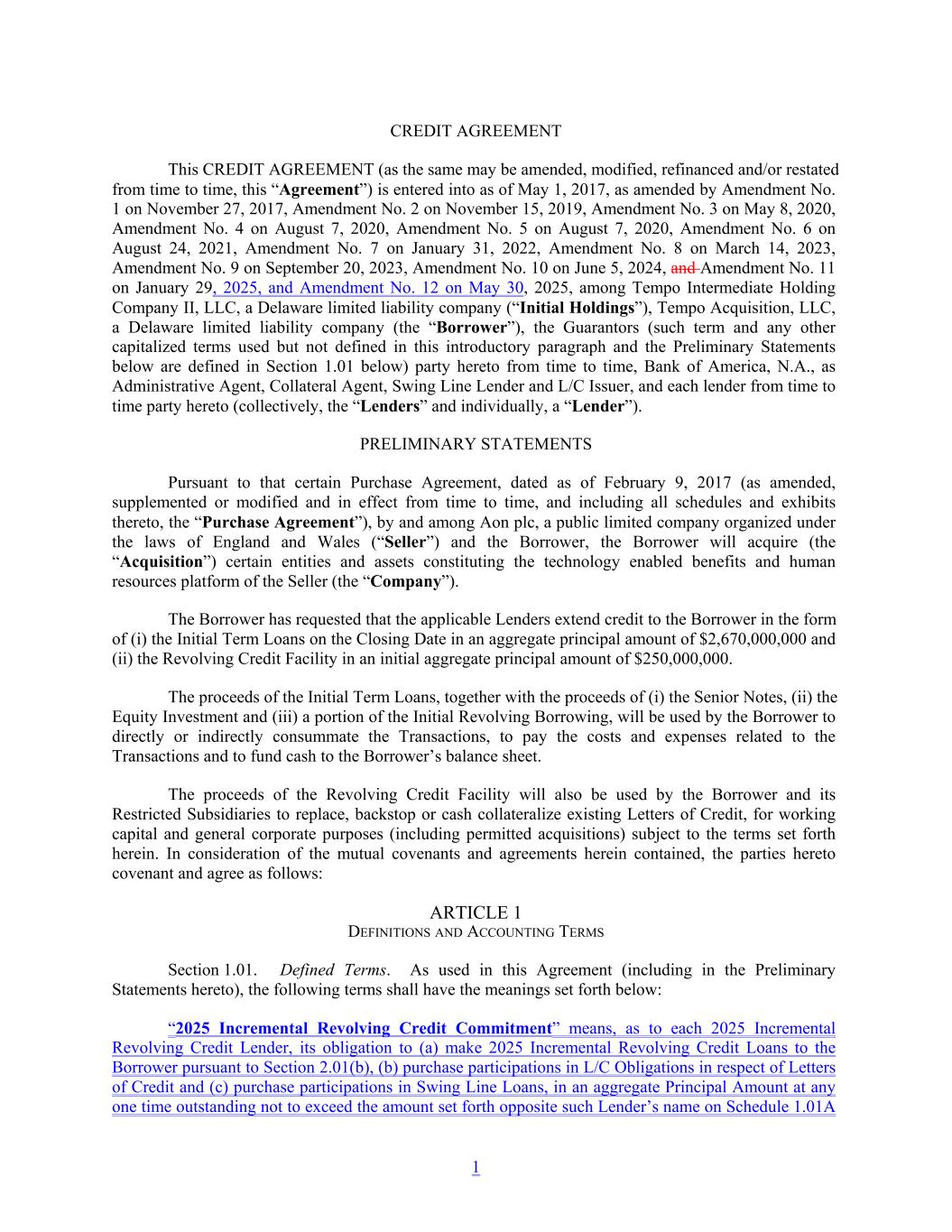 CREDIT AGREEMENTThis CREDIT AGREEMENT (as the same may be amended, modified, refinanced and/or restatedfrom time to time, this “Agreement”) is entered into as of May 1, 2017, as amended by Amendment No.1 on November 27, 2017, Amendment No. 2 on November 15, 2019, Amendment No. 3 on May 8, 2020,Amendment No. 4 on August 7, 2020, Amendment No. 5 on August 7, 2020, Amendment No. 6 onAugust 24, 2021, Amendment No. 7 on January 31, 2022, Amendment No. 8 on March 14, 2023,Amendment No. 9 on September 20, 2023, Amendment No. 10 on June 5, 2024, and Amendment No. 11on January 29, 2025, and Amendment No. 12 on May 30, 2025, among Tempo Intermediate HoldingCompany II, LLC, a Delaware limited liability company (“Initial Holdings”), Tempo Acquisition, LLC,a Delaware limited liability company (the “Borrower”), the Guarantors (such term and any othercapitalized terms used but not defined in this introductory paragraph and the Preliminary Statementsbelow are defined in Section 1.01 below) party hereto from time to time, Bank of America, N.A., asAdministrative Agent, Collateral Agent, Swing Line Lender and L/C Issuer, and each lender from time totime party hereto (collectively, the “Lenders” and individually, a “Lender”).PRELIMINARY STATEMENTSPursuant to that certain Purchase Agreement, dated as of February 9, 2017 (as amended,supplemented or modified and in effect from time to time, and including all schedules and exhibitsthereto, the “Purchase Agreement”), by and among Aon plc, a public limited company organized underthe laws of England and Wales (“Seller”) and the Borrower, the Borrower will acquire (the“Acquisition”) certain entities and assets constituting the technology enabled benefits and humanresources platform of the Seller (the “Company”).The Borrower has requested that the applicable Lenders extend credit to the Borrower in the formof (i) the Initial Term Loans on the Closing Date in an aggregate principal amount of $2,670,000,000 and(ii) the Revolving Credit Facility in an initial aggregate principal amount of $250,000,000.The proceeds of the Initial Term Loans, together with the proceeds of (i) the Senior Notes, (ii) theEquity Investment and (iii) a portion of the Initial Revolving Borrowing, will be used by the Borrower todirectly or indirectly consummate the Transactions, to pay the costs and expenses related to theTransactions and to fund cash to the Borrower’s balance sheet.The proceeds of the Revolving Credit Facility will also be used by the Borrower and itsRestricted Subsidiaries to replace, backstop or cash collateralize existing Letters of Credit, for workingcapital and general corporate purposes (including permitted acquisitions) subject to the terms set forthherein. In consideration of the mutual covenants and agreements herein contained, the parties heretocovenant and agree as follows: ARTICLE 1DEFINITIONS AND ACCOUNTING TERMSSection 1.01. Defined Terms. As used in this Agreement (including in the PreliminaryStatements hereto), the following terms shall have the meanings set forth below:“2025 Incremental Revolving Credit Commitment” means, as to each 2025 IncrementalRevolving Credit Lender, its obligation to (a) make 2025 Incremental Revolving Credit Loans to theBorrower pursuant to Section 2.01(b), (b) purchase participations in L/C Obligations in respect of Lettersof Credit and (c) purchase participations in Swing Line Loans, in an aggregate Principal Amount at anyone time outstanding not to exceed the amount set forth opposite such Lender’s name on Schedule 1.01A1