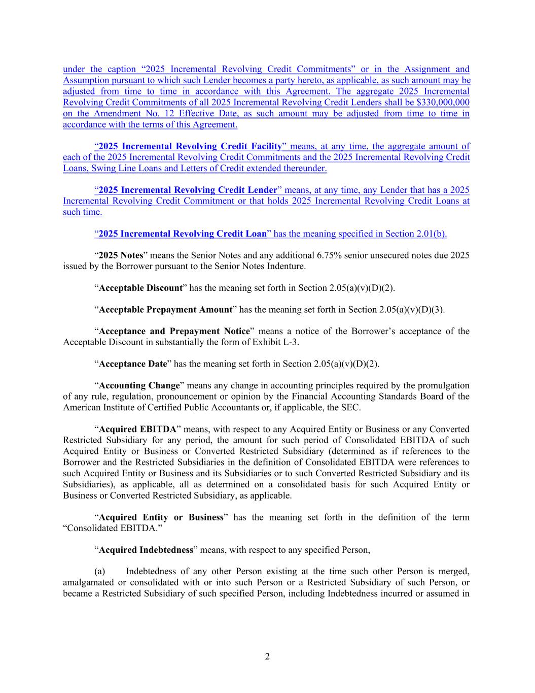 under the caption “2025 Incremental Revolving Credit Commitments” or in the Assignment andAssumption pursuant to which such Lender becomes a party hereto, as applicable, as such amount may beadjusted from time to time in accordance with this Agreement. The aggregate 2025 IncrementalRevolving Credit Commitments of all 2025 Incremental Revolving Credit Lenders shall be $330,000,000on the Amendment No. 12 Effective Date, as such amount may be adjusted from time to time inaccordance with the terms of this Agreement.“2025 Incremental Revolving Credit Facility” means, at any time, the aggregate amount ofeach of the 2025 Incremental Revolving Credit Commitments and the 2025 Incremental Revolving CreditLoans, Swing Line Loans and Letters of Credit extended thereunder.“2025 Incremental Revolving Credit Lender” means, at any time, any Lender that has a 2025Incremental Revolving Credit Commitment or that holds 2025 Incremental Revolving Credit Loans atsuch time.“2025 Incremental Revolving Credit Loan” has the meaning specified in Section 2.01(b).“2025 Notes” means the Senior Notes and any additional 6.75% senior unsecured notes due 2025issued by the Borrower pursuant to the Senior Notes Indenture.“Acceptable Discount” has the meaning set forth in Section 2.05(a)(v)(D)(2).“Acceptable Prepayment Amount” has the meaning set forth in Section 2.05(a)(v)(D)(3).“Acceptance and Prepayment Notice” means a notice of the Borrower’s acceptance of theAcceptable Discount in substantially the form of Exhibit L-3.“Acceptance Date” has the meaning set forth in Section 2.05(a)(v)(D)(2).“Accounting Change” means any change in accounting principles required by the promulgationof any rule, regulation, pronouncement or opinion by the Financial Accounting Standards Board of theAmerican Institute of Certified Public Accountants or, if applicable, the SEC.“Acquired EBITDA” means, with respect to any Acquired Entity or Business or any ConvertedRestricted Subsidiary for any period, the amount for such period of Consolidated EBITDA of suchAcquired Entity or Business or Converted Restricted Subsidiary (determined as if references to theBorrower and the Restricted Subsidiaries in the definition of Consolidated EBITDA were references tosuch Acquired Entity or Business and its Subsidiaries or to such Converted Restricted Subsidiary and itsSubsidiaries), as applicable, all as determined on a consolidated basis for such Acquired Entity orBusiness or Converted Restricted Subsidiary, as applicable.“Acquired Entity or Business” has the meaning set forth in the definition of the term“Consolidated EBITDA.”“Acquired Indebtedness” means, with respect to any specified Person,(a) Indebtedness of any other Person existing at the time such other Person is merged,amalgamated or consolidated with or into such Person or a Restricted Subsidiary of such Person, orbecame a Restricted Subsidiary of such specified Person, including Indebtedness incurred or assumed in2