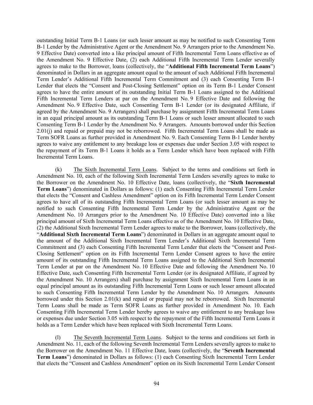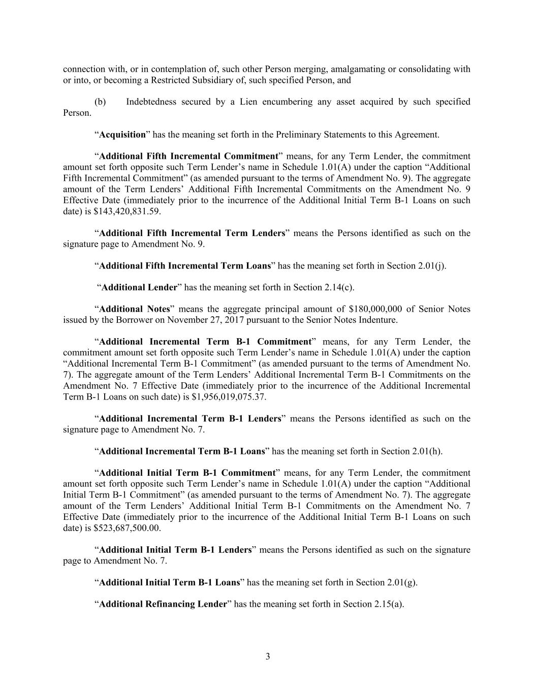 connection with, or in contemplation of, such other Person merging, amalgamating or consolidating withor into, or becoming a Restricted Subsidiary of, such specified Person, and(b) Indebtedness secured by a Lien encumbering any asset acquired by such specifiedPerson. “Acquisition” has the meaning set forth in the Preliminary Statements to this Agreement.“Additional Fifth Incremental Commitment” means, for any Term Lender, the commitmentamount set forth opposite such Term Lender’s name in Schedule 1.01(A) under the caption “AdditionalFifth Incremental Commitment” (as amended pursuant to the terms of Amendment No. 9). The aggregateamount of the Term Lenders’ Additional Fifth Incremental Commitments on the Amendment No. 9Effective Date (immediately prior to the incurrence of the Additional Initial Term B-1 Loans on suchdate) is $143,420,831.59.“Additional Fifth Incremental Term Lenders” means the Persons identified as such on thesignature page to Amendment No. 9.“Additional Fifth Incremental Term Loans” has the meaning set forth in Section 2.01(j). “Additional Lender” has the meaning set forth in Section 2.14(c).“Additional Notes” means the aggregate principal amount of $180,000,000 of Senior Notesissued by the Borrower on November 27, 2017 pursuant to the Senior Notes Indenture.“Additional Incremental Term B-1 Commitment” means, for any Term Lender, thecommitment amount set forth opposite such Term Lender’s name in Schedule 1.01(A) under the caption“Additional Incremental Term B-1 Commitment” (as amended pursuant to the terms of Amendment No.7). The aggregate amount of the Term Lenders’ Additional Incremental Term B-1 Commitments on theAmendment No. 7 Effective Date (immediately prior to the incurrence of the Additional IncrementalTerm B-1 Loans on such date) is $1,956,019,075.37.“Additional Incremental Term B-1 Lenders” means the Persons identified as such on thesignature page to Amendment No. 7.“Additional Incremental Term B-1 Loans” has the meaning set forth in Section 2.01(h).“Additional Initial Term B-1 Commitment” means, for any Term Lender, the commitmentamount set forth opposite such Term Lender’s name in Schedule 1.01(A) under the caption “AdditionalInitial Term B-1 Commitment” (as amended pursuant to the terms of Amendment No. 7). The aggregateamount of the Term Lenders’ Additional Initial Term B-1 Commitments on the Amendment No. 7Effective Date (immediately prior to the incurrence of the Additional Initial Term B-1 Loans on suchdate) is $523,687,500.00.“Additional Initial Term B-1 Lenders” means the Persons identified as such on the signaturepage to Amendment No. 7.“Additional Initial Term B-1 Loans” has the meaning set forth in Section 2.01(g).“Additional Refinancing Lender” has the meaning set forth in Section 2.15(a).3
