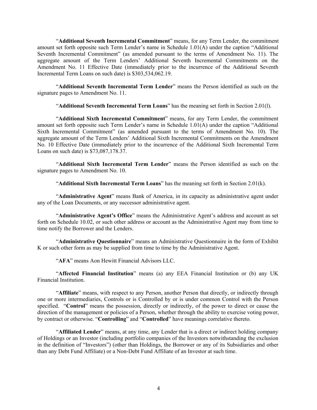 “Additional Seventh Incremental Commitment” means, for any Term Lender, the commitmentamount set forth opposite such Term Lender’s name in Schedule 1.01(A) under the caption “AdditionalSeventh Incremental Commitment” (as amended pursuant to the terms of Amendment No. 11). Theaggregate amount of the Term Lenders’ Additional Seventh Incremental Commitments on theAmendment No. 11 Effective Date (immediately prior to the incurrence of the Additional SeventhIncremental Term Loans on such date) is $303,534,062.19.“Additional Seventh Incremental Term Lender” means the Person identified as such on thesignature pages to Amendment No. 11.“Additional Seventh Incremental Term Loans” has the meaning set forth in Section 2.01(l).“Additional Sixth Incremental Commitment” means, for any Term Lender, the commitmentamount set forth opposite such Term Lender’s name in Schedule 1.01(A) under the caption “AdditionalSixth Incremental Commitment” (as amended pursuant to the terms of Amendment No. 10). Theaggregate amount of the Term Lenders’ Additional Sixth Incremental Commitments on the AmendmentNo. 10 Effective Date (immediately prior to the incurrence of the Additional Sixth Incremental TermLoans on such date) is $73,087,178.37.“Additional Sixth Incremental Term Lender” means the Person identified as such on thesignature pages to Amendment No. 10.“Additional Sixth Incremental Term Loans” has the meaning set forth in Section 2.01(k).“Administrative Agent” means Bank of America, in its capacity as administrative agent underany of the Loan Documents, or any successor administrative agent.“Administrative Agent’s Office” means the Administrative Agent’s address and account as setforth on Schedule 10.02, or such other address or account as the Administrative Agent may from time totime notify the Borrower and the Lenders.“Administrative Questionnaire” means an Administrative Questionnaire in the form of ExhibitK or such other form as may be supplied from time to time by the Administrative Agent.“AFA” means Aon Hewitt Financial Advisors LLC.“Affected Financial Institution” means (a) any EEA Financial Institution or (b) any UKFinancial Institution.“Affiliate” means, with respect to any Person, another Person that directly, or indirectly throughone or more intermediaries, Controls or is Controlled by or is under common Control with the Personspecified. “Control” means the possession, directly or indirectly, of the power to direct or cause thedirection of the management or policies of a Person, whether through the ability to exercise voting power,by contract or otherwise. “Controlling” and “Controlled” have meanings correlative thereto.“Affiliated Lender” means, at any time, any Lender that is a direct or indirect holding companyof Holdings or an Investor (including portfolio companies of the Investors notwithstanding the exclusionin the definition of “Investors”) (other than Holdings, the Borrower or any of its Subsidiaries and otherthan any Debt Fund Affiliate) or a Non-Debt Fund Affiliate of an Investor at such time.4