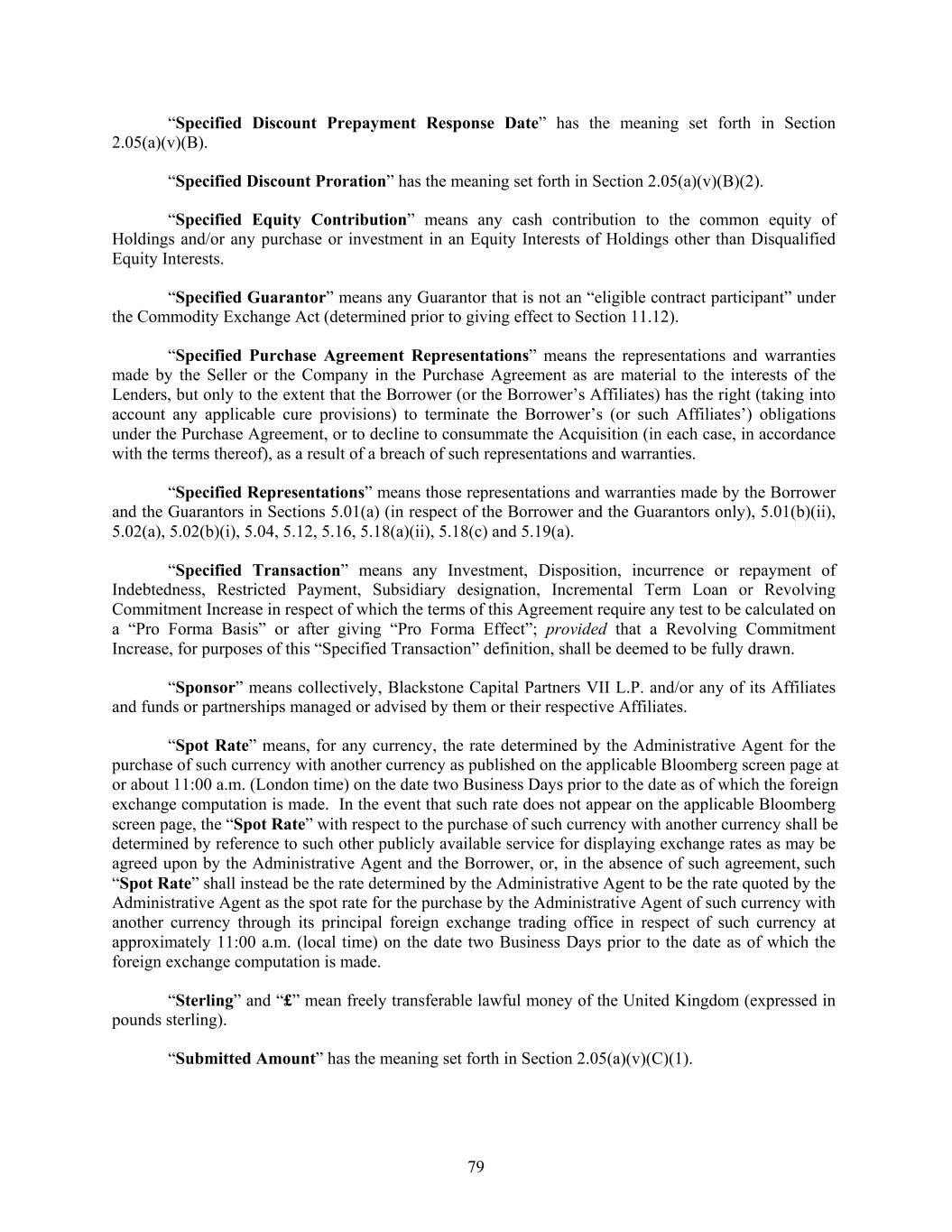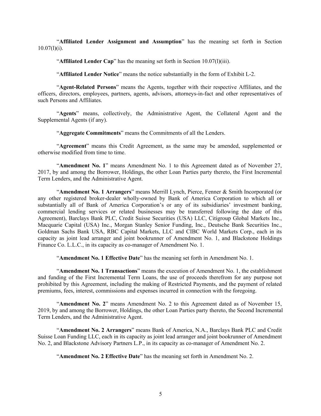 “Affiliated Lender Assignment and Assumption” has the meaning set forth in Section10.07(l)(i).“Affiliated Lender Cap” has the meaning set forth in Section 10.07(l)(iii).“Affiliated Lender Notice” means the notice substantially in the form of Exhibit L-2.“Agent-Related Persons” means the Agents, together with their respective Affiliates, and theofficers, directors, employees, partners, agents, advisors, attorneys-in-fact and other representatives ofsuch Persons and Affiliates.“Agents” means, collectively, the Administrative Agent, the Collateral Agent and theSupplemental Agents (if any).“Aggregate Commitments” means the Commitments of all the Lenders.“Agreement” means this Credit Agreement, as the same may be amended, supplemented orotherwise modified from time to time.“Amendment No. 1” means Amendment No. 1 to this Agreement dated as of November 27,2017, by and among the Borrower, Holdings, the other Loan Parties party thereto, the First IncrementalTerm Lenders, and the Administrative Agent.“Amendment No. 1 Arrangers” means Merrill Lynch, Pierce, Fenner & Smith Incorporated (orany other registered broker-dealer wholly-owned by Bank of America Corporation to which all orsubstantially all of Bank of America Corporation’s or any of its subsidiaries’ investment banking,commercial lending services or related businesses may be transferred following the date of thisAgreement), Barclays Bank PLC, Credit Suisse Securities (USA) LLC, Citigroup Global Markets Inc.,Macquarie Capital (USA) Inc., Morgan Stanley Senior Funding, Inc., Deutsche Bank Securities Inc.,Goldman Sachs Bank USA, RBC Capital Markets, LLC and CIBC World Markets Corp., each in itscapacity as joint lead arranger and joint bookrunner of Amendment No. 1, and Blackstone HoldingsFinance Co. L.L.C., in its capacity as co-manager of Amendment No. 1.“Amendment No. 1 Effective Date” has the meaning set forth in Amendment No. 1.“Amendment No. 1 Transactions” means the execution of Amendment No. 1, the establishmentand funding of the First Incremental Term Loans, the use of proceeds therefrom for any purpose notprohibited by this Agreement, including the making of Restricted Payments, and the payment of relatedpremiums, fees, interest, commissions and expenses incurred in connection with the foregoing.“Amendment No. 2” means Amendment No. 2 to this Agreement dated as of November 15,2019, by and among the Borrower, Holdings, the other Loan Parties party thereto, the Second IncrementalTerm Lenders, and the Administrative Agent.“Amendment No. 2 Arrangers” means Bank of America, N.A., Barclays Bank PLC and CreditSuisse Loan Funding LLC, each in its capacity as joint lead arranger and joint bookrunner of AmendmentNo. 2, and Blackstone Advisory Partners L.P., in its capacity as co-manager of Amendment No. 2.“Amendment No. 2 Effective Date” has the meaning set forth in Amendment No. 2.5