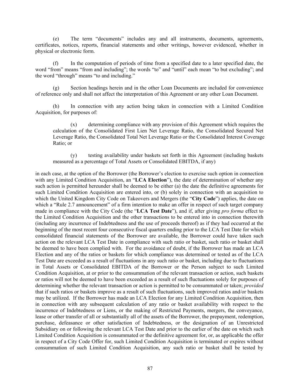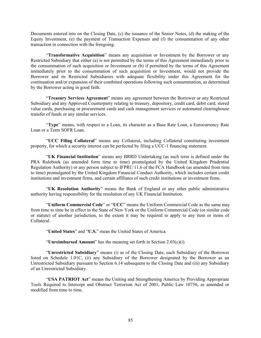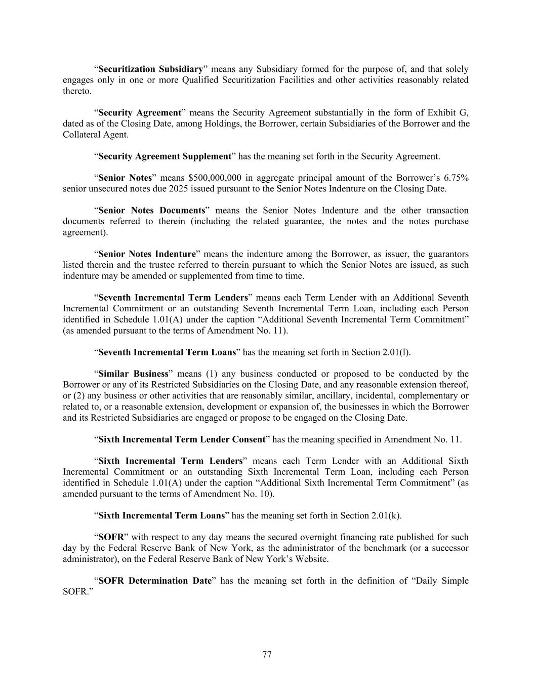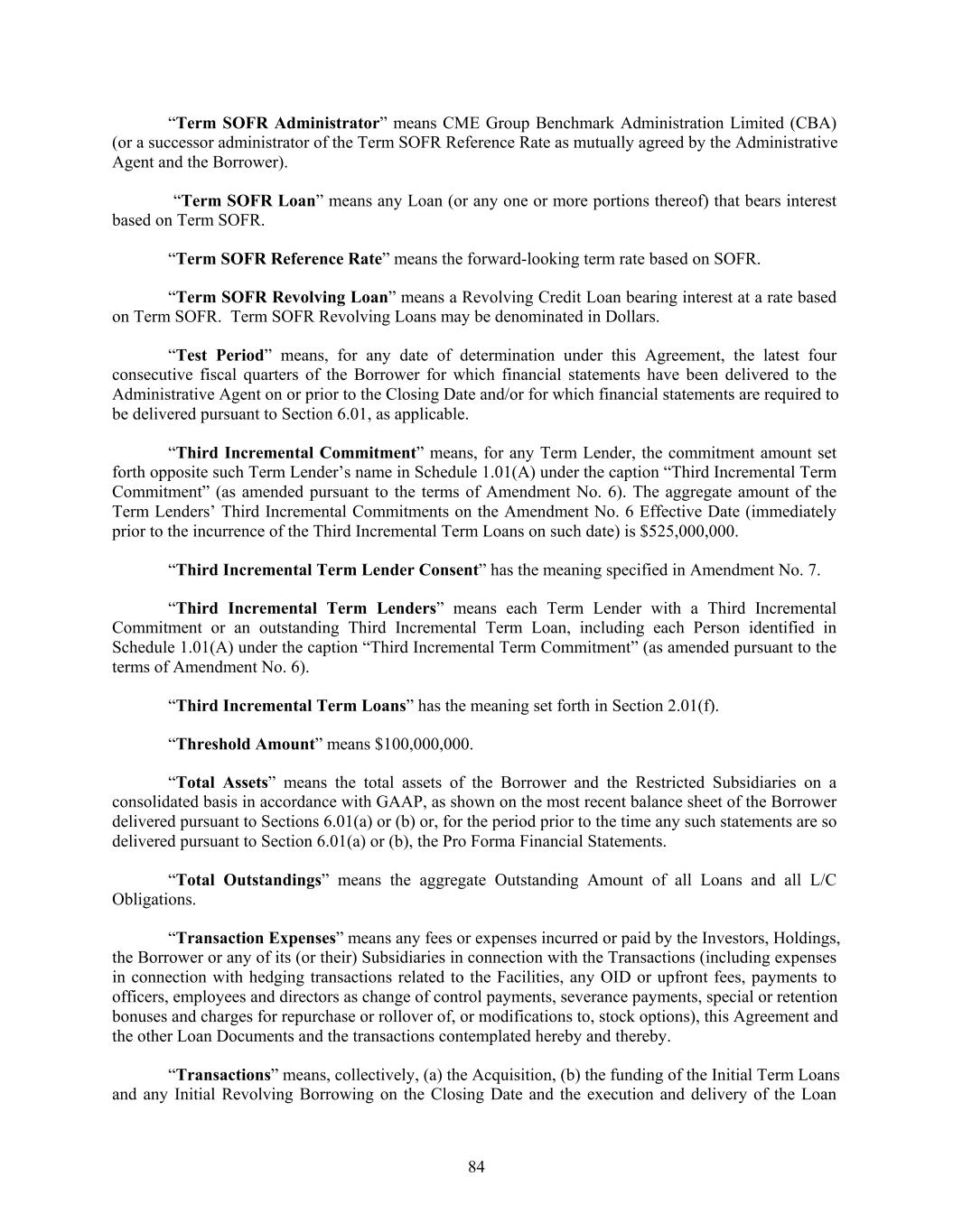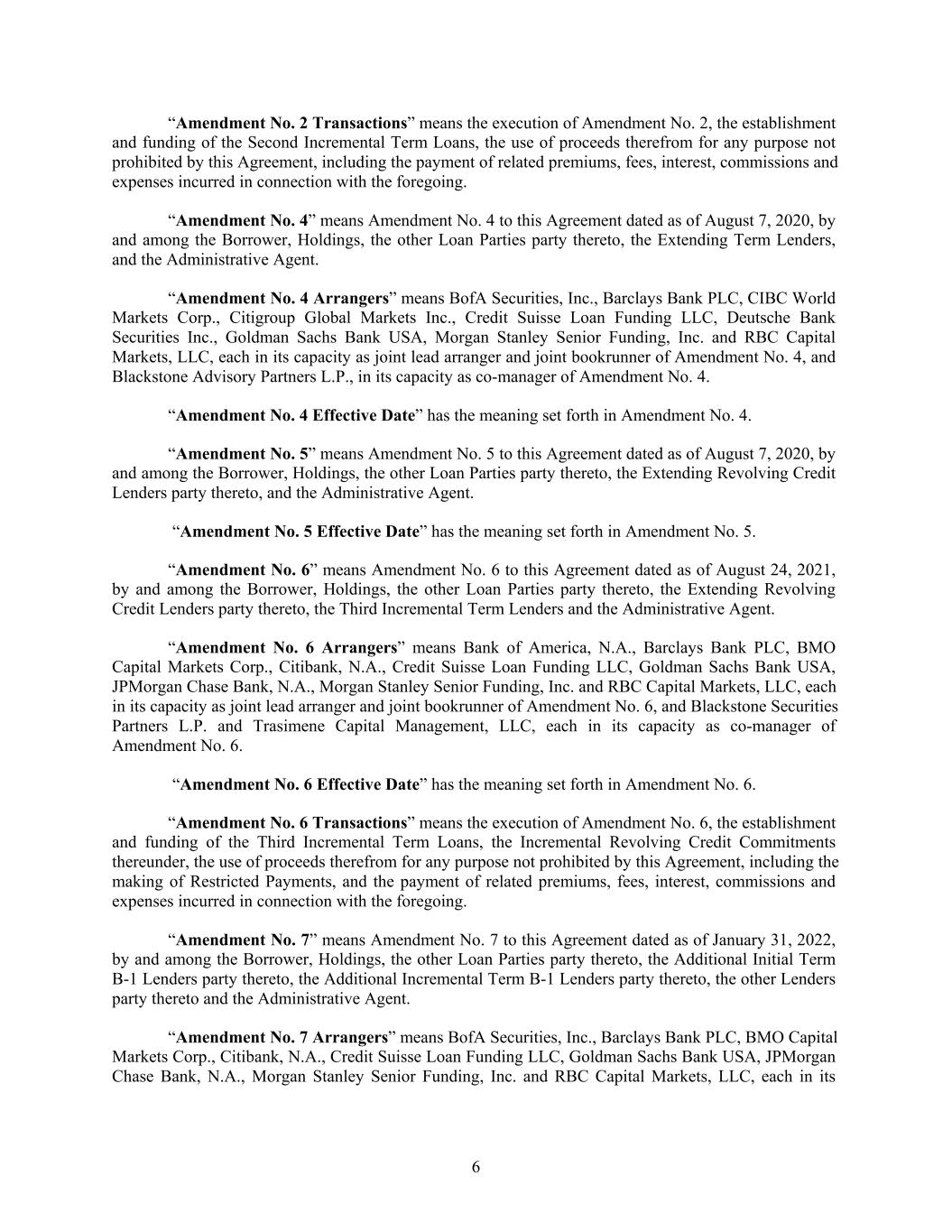 “Amendment No. 2 Transactions” means the execution of Amendment No. 2, the establishmentand funding of the Second Incremental Term Loans, the use of proceeds therefrom for any purpose notprohibited by this Agreement, including the payment of related premiums, fees, interest, commissions andexpenses incurred in connection with the foregoing.“Amendment No. 4” means Amendment No. 4 to this Agreement dated as of August 7, 2020, byand among the Borrower, Holdings, the other Loan Parties party thereto, the Extending Term Lenders,and the Administrative Agent.“Amendment No. 4 Arrangers” means BofA Securities, Inc., Barclays Bank PLC, CIBC WorldMarkets Corp., Citigroup Global Markets Inc., Credit Suisse Loan Funding LLC, Deutsche BankSecurities Inc., Goldman Sachs Bank USA, Morgan Stanley Senior Funding, Inc. and RBC CapitalMarkets, LLC, each in its capacity as joint lead arranger and joint bookrunner of Amendment No. 4, andBlackstone Advisory Partners L.P., in its capacity as co-manager of Amendment No. 4.“Amendment No. 4 Effective Date” has the meaning set forth in Amendment No. 4.“Amendment No. 5” means Amendment No. 5 to this Agreement dated as of August 7, 2020, byand among the Borrower, Holdings, the other Loan Parties party thereto, the Extending Revolving CreditLenders party thereto, and the Administrative Agent. “Amendment No. 5 Effective Date” has the meaning set forth in Amendment No. 5.“Amendment No. 6” means Amendment No. 6 to this Agreement dated as of August 24, 2021,by and among the Borrower, Holdings, the other Loan Parties party thereto, the Extending RevolvingCredit Lenders party thereto, the Third Incremental Term Lenders and the Administrative Agent.“Amendment No. 6 Arrangers” means Bank of America, N.A., Barclays Bank PLC, BMOCapital Markets Corp., Citibank, N.A., Credit Suisse Loan Funding LLC, Goldman Sachs Bank USA,JPMorgan Chase Bank, N.A., Morgan Stanley Senior Funding, Inc. and RBC Capital Markets, LLC, eachin its capacity as joint lead arranger and joint bookrunner of Amendment No. 6, and Blackstone SecuritiesPartners L.P. and Trasimene Capital Management, LLC, each in its capacity as co-manager ofAmendment No. 6. “Amendment No. 6 Effective Date” has the meaning set forth in Amendment No. 6.“Amendment No. 6 Transactions” means the execution of Amendment No. 6, the establishmentand funding of the Third Incremental Term Loans, the Incremental Revolving Credit Commitmentsthereunder, the use of proceeds therefrom for any purpose not prohibited by this Agreement, including themaking of Restricted Payments, and the payment of related premiums, fees, interest, commissions andexpenses incurred in connection with the foregoing.“Amendment No. 7” means Amendment No. 7 to this Agreement dated as of January 31, 2022,by and among the Borrower, Holdings, the other Loan Parties party thereto, the Additional Initial TermB-1 Lenders party thereto, the Additional Incremental Term B-1 Lenders party thereto, the other Lendersparty thereto and the Administrative Agent.“Amendment No. 7 Arrangers” means BofA Securities, Inc., Barclays Bank PLC, BMO CapitalMarkets Corp., Citibank, N.A., Credit Suisse Loan Funding LLC, Goldman Sachs Bank USA, JPMorganChase Bank, N.A., Morgan Stanley Senior Funding, Inc. and RBC Capital Markets, LLC, each in its6