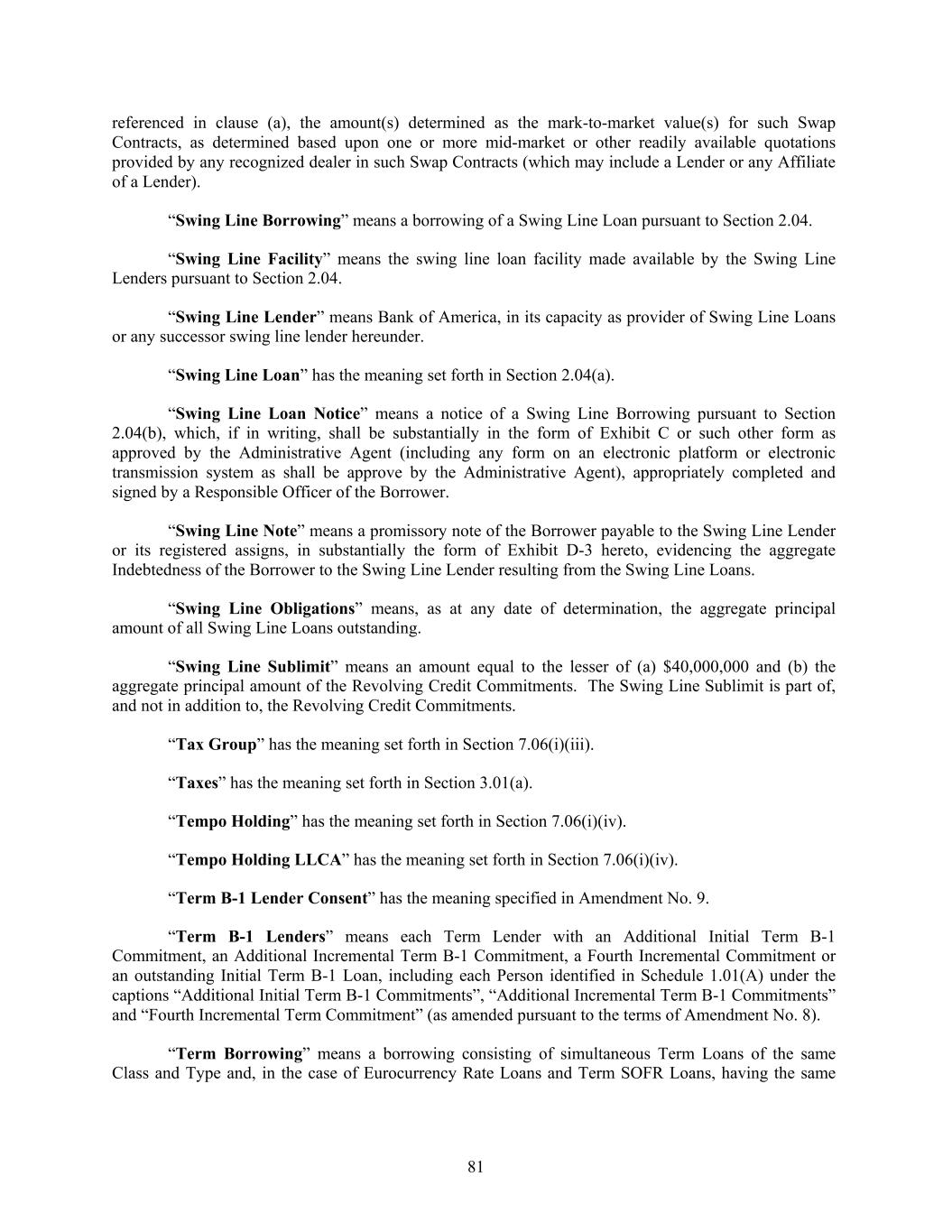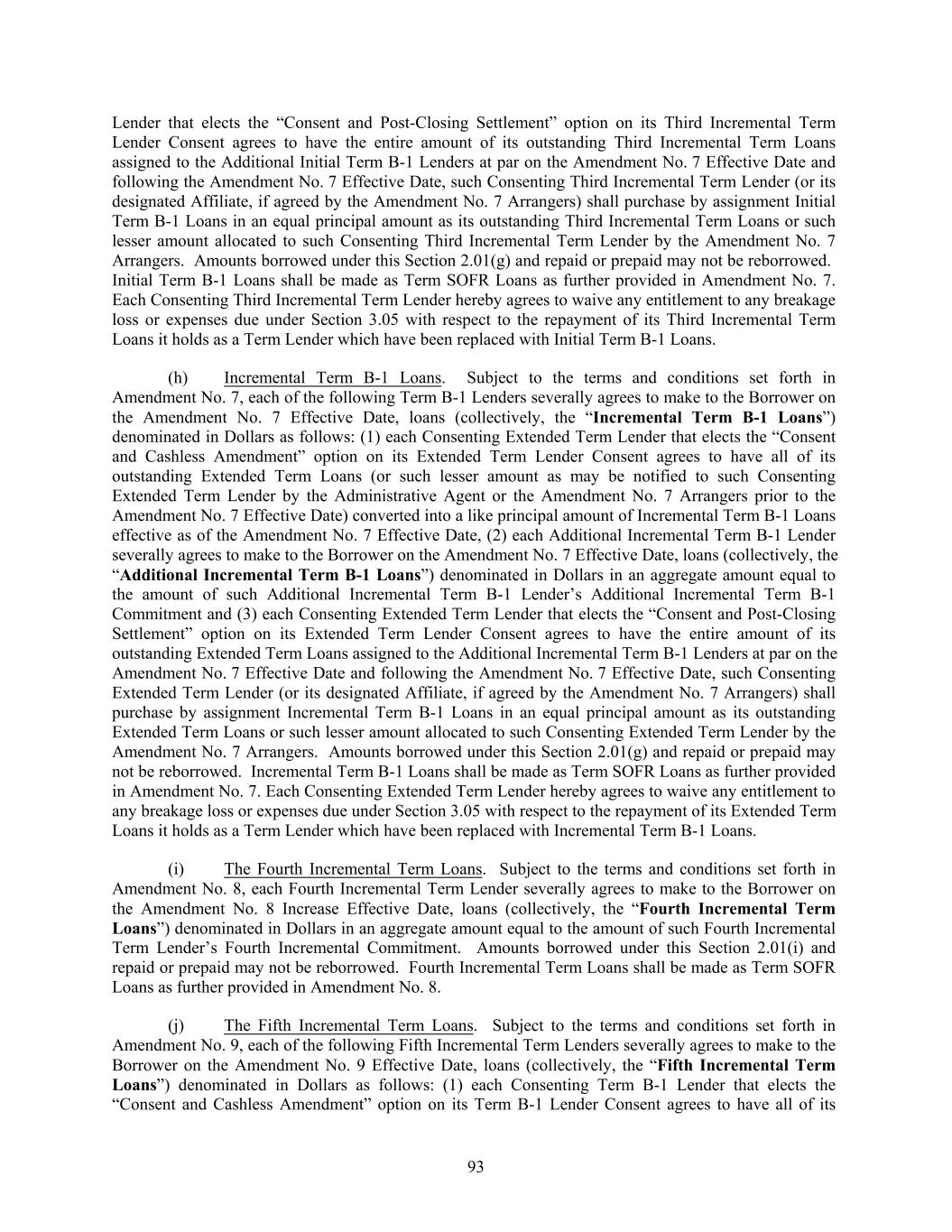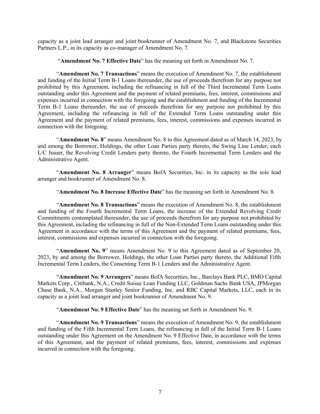 capacity as a joint lead arranger and joint bookrunner of Amendment No. 7, and Blackstone SecuritiesPartners L.P., in its capacity as co-manager of Amendment No. 7. “Amendment No. 7 Effective Date” has the meaning set forth in Amendment No. 7.“Amendment No. 7 Transactions” means the execution of Amendment No. 7, the establishmentand funding of the Initial Term B-1 Loans thereunder, the use of proceeds therefrom for any purpose notprohibited by this Agreement, including the refinancing in full of the Third Incremental Term Loansoutstanding under this Agreement and the payment of related premiums, fees, interest, commissions andexpenses incurred in connection with the foregoing and the establishment and funding of the IncrementalTerm B-1 Loans thereunder, the use of proceeds therefrom for any purpose not prohibited by thisAgreement, including the refinancing in full of the Extended Term Loans outstanding under thisAgreement and the payment of related premiums, fees, interest, commissions and expenses incurred inconnection with the foregoing.“Amendment No. 8” means Amendment No. 8 to this Agreement dated as of March 14, 2023, byand among the Borrower, Holdings, the other Loan Parties party thereto, the Swing Line Lender, eachL/C Issuer, the Revolving Credit Lenders party thereto, the Fourth Incremental Term Lenders and theAdministrative Agent.“Amendment No. 8 Arranger” means BofA Securities, Inc. in its capacity as the sole leadarranger and bookrunner of Amendment No. 8.“Amendment No. 8 Increase Effective Date” has the meaning set forth in Amendment No. 8.“Amendment No. 8 Transactions” means the execution of Amendment No. 8, the establishmentand funding of the Fourth Incremental Term Loans, the increase of the Extended Revolving CreditCommitments contemplated thereunder, the use of proceeds therefrom for any purpose not prohibited bythis Agreement, including the refinancing in full of the Non-Extended Term Loans outstanding under thisAgreement in accordance with the terms of this Agreement and the payment of related premiums, fees,interest, commissions and expenses incurred in connection with the foregoing.“Amendment No. 9” means Amendment No. 9 to this Agreement dated as of September 20,2023, by and among the Borrower, Holdings, the other Loan Parties party thereto, the Additional FifthIncremental Term Lenders, the Consenting Term B-1 Lenders and the Administrative Agent.“Amendment No. 9 Arrangers” means BofA Securities, Inc., Barclays Bank PLC, BMO CapitalMarkets Corp., Citibank, N.A., Credit Suisse Loan Funding LLC, Goldman Sachs Bank USA, JPMorganChase Bank, N.A., Morgan Stanley Senior Funding, Inc. and RBC Capital Markets, LLC, each in itscapacity as a joint lead arranger and joint bookrunner of Amendment No. 9.“Amendment No. 9 Effective Date” has the meaning set forth in Amendment No. 9.“Amendment No. 9 Transactions” means the execution of Amendment No. 9, the establishmentand funding of the Fifth Incremental Term Loans, the refinancing in full of the Initial Term B-1 Loansoutstanding under this Agreement on the Amendment No. 9 Effective Date, in accordance with the termsof this Agreement, and the payment of related premiums, fees, interest, commissions and expensesincurred in connection with the foregoing. 7