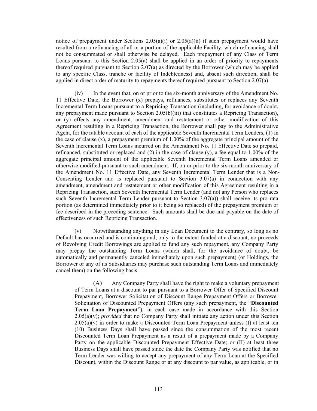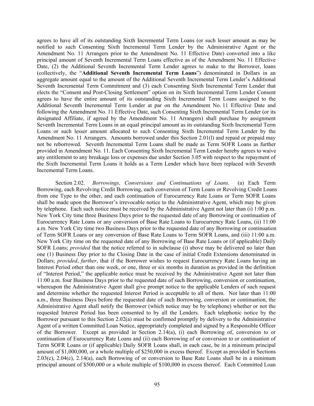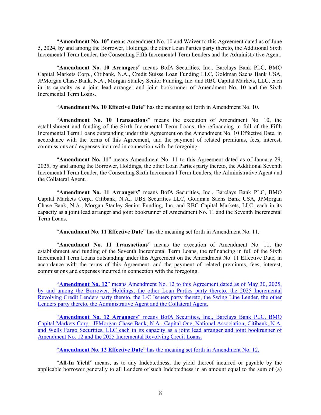 “Amendment No. 10” means Amendment No. 10 and Waiver to this Agreement dated as of June5, 2024, by and among the Borrower, Holdings, the other Loan Parties party thereto, the Additional SixthIncremental Term Lender, the Consenting Fifth Incremental Term Lenders and the Administrative Agent.“Amendment No. 10 Arrangers” means BofA Securities, Inc., Barclays Bank PLC, BMOCapital Markets Corp., Citibank, N.A., Credit Suisse Loan Funding LLC, Goldman Sachs Bank USA,JPMorgan Chase Bank, N.A., Morgan Stanley Senior Funding, Inc. and RBC Capital Markets, LLC, eachin its capacity as a joint lead arranger and joint bookrunner of Amendment No. 10 and the SixthIncremental Term Loans.“Amendment No. 10 Effective Date” has the meaning set forth in Amendment No. 10.“Amendment No. 10 Transactions” means the execution of Amendment No. 10, theestablishment and funding of the Sixth Incremental Term Loans, the refinancing in full of the FifthIncremental Term Loans outstanding under this Agreement on the Amendment No. 10 Effective Date, inaccordance with the terms of this Agreement, and the payment of related premiums, fees, interest,commissions and expenses incurred in connection with the foregoing.“Amendment No. 11” means Amendment No. 11 to this Agreement dated as of January 29,2025, by and among the Borrower, Holdings, the other Loan Parties party thereto, the Additional SeventhIncremental Term Lender, the Consenting Sixth Incremental Term Lenders, the Administrative Agent andthe Collateral Agent.“Amendment No. 11 Arrangers” means BofA Securities, Inc., Barclays Bank PLC, BMOCapital Markets Corp., Citibank, N.A., UBS Securities LLC, Goldman Sachs Bank USA, JPMorganChase Bank, N.A., Morgan Stanley Senior Funding, Inc. and RBC Capital Markets, LLC, each in itscapacity as a joint lead arranger and joint bookrunner of Amendment No. 11 and the Seventh IncrementalTerm Loans.“Amendment No. 11 Effective Date” has the meaning set forth in Amendment No. 11.“Amendment No. 11 Transactions” means the execution of Amendment No. 11, theestablishment and funding of the Seventh Incremental Term Loans, the refinancing in full of the SixthIncremental Term Loans outstanding under this Agreement on the Amendment No. 11 Effective Date, inaccordance with the terms of this Agreement, and the payment of related premiums, fees, interest,commissions and expenses incurred in connection with the foregoing.“Amendment No. 12” means Amendment No. 12 to this Agreement dated as of May 30, 2025,by and among the Borrower, Holdings, the other Loan Parties party thereto, the 2025 IncrementalRevolving Credit Lenders party thereto, the L/C Issuers party thereto, the Swing Line Lender, the otherLenders party thereto, the Administrative Agent and the Collateral Agent.“Amendment No. 12 Arrangers” means BofA Securities, Inc., Barclays Bank PLC, BMOCapital Markets Corp., JPMorgan Chase Bank, N.A., Capital One, National Association, Citibank, N.A.and Wells Fargo Securities, LLC each in its capacity as a joint lead arranger and joint bookrunner ofAmendment No. 12 and the 2025 Incremental Revolving Credit Loans.“Amendment No. 12 Effective Date” has the meaning set forth in Amendment No. 12.“All-In Yield” means, as to any Indebtedness, the yield thereof incurred or payable by theapplicable borrower generally to all Lenders of such Indebtedness in an amount equal to the sum of (a)8