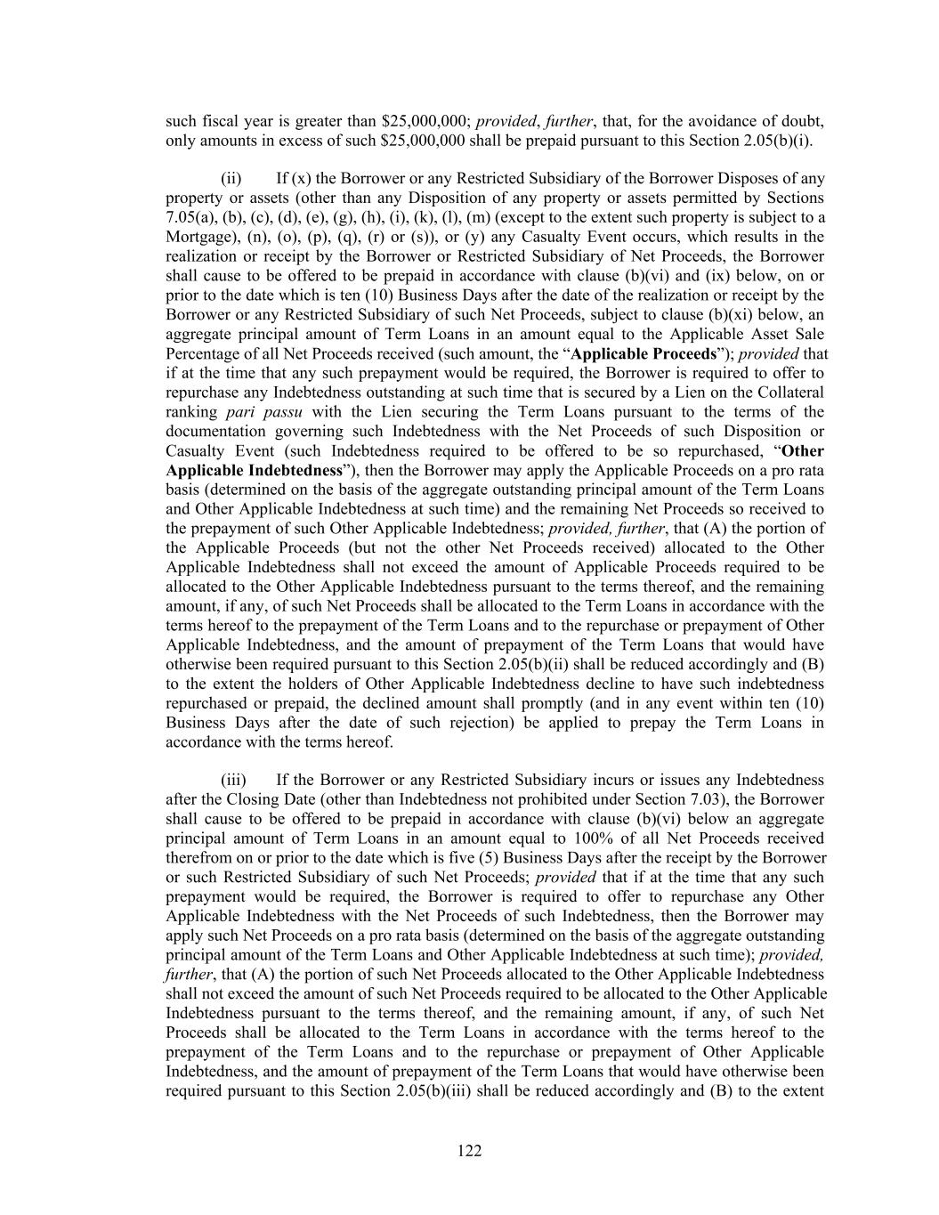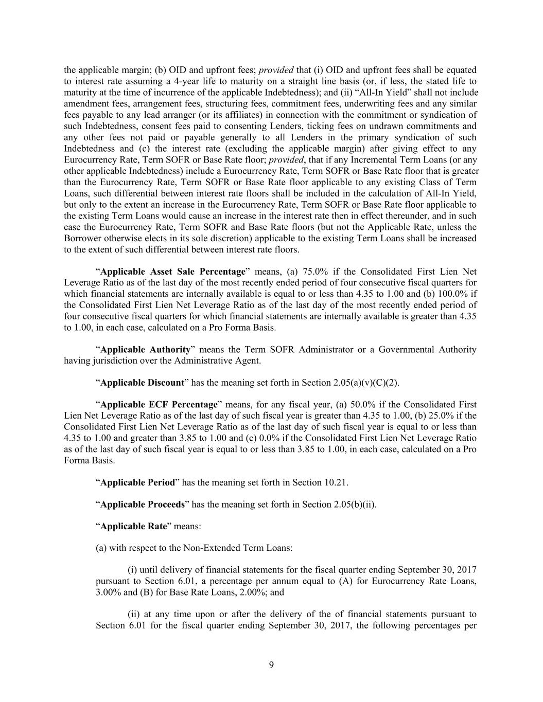 the applicable margin; (b) OID and upfront fees; provided that (i) OID and upfront fees shall be equatedto interest rate assuming a 4-year life to maturity on a straight line basis (or, if less, the stated life tomaturity at the time of incurrence of the applicable Indebtedness); and (ii) “All-In Yield” shall not includeamendment fees, arrangement fees, structuring fees, commitment fees, underwriting fees and any similarfees payable to any lead arranger (or its affiliates) in connection with the commitment or syndication ofsuch Indebtedness, consent fees paid to consenting Lenders, ticking fees on undrawn commitments andany other fees not paid or payable generally to all Lenders in the primary syndication of suchIndebtedness and (c) the interest rate (excluding the applicable margin) after giving effect to anyEurocurrency Rate, Term SOFR or Base Rate floor; provided, that if any Incremental Term Loans (or anyother applicable Indebtedness) include a Eurocurrency Rate, Term SOFR or Base Rate floor that is greaterthan the Eurocurrency Rate, Term SOFR or Base Rate floor applicable to any existing Class of TermLoans, such differential between interest rate floors shall be included in the calculation of All-In Yield,but only to the extent an increase in the Eurocurrency Rate, Term SOFR or Base Rate floor applicable tothe existing Term Loans would cause an increase in the interest rate then in effect thereunder, and in suchcase the Eurocurrency Rate, Term SOFR and Base Rate floors (but not the Applicable Rate, unless theBorrower otherwise elects in its sole discretion) applicable to the existing Term Loans shall be increasedto the extent of such differential between interest rate floors.“Applicable Asset Sale Percentage” means, (a) 75.0% if the Consolidated First Lien NetLeverage Ratio as of the last day of the most recently ended period of four consecutive fiscal quarters forwhich financial statements are internally available is equal to or less than 4.35 to 1.00 and (b) 100.0% ifthe Consolidated First Lien Net Leverage Ratio as of the last day of the most recently ended period offour consecutive fiscal quarters for which financial statements are internally available is greater than 4.35to 1.00, in each case, calculated on a Pro Forma Basis.“Applicable Authority” means the Term SOFR Administrator or a Governmental Authorityhaving jurisdiction over the Administrative Agent.“Applicable Discount” has the meaning set forth in Section 2.05(a)(v)(C)(2).“Applicable ECF Percentage” means, for any fiscal year, (a) 50.0% if the Consolidated FirstLien Net Leverage Ratio as of the last day of such fiscal year is greater than 4.35 to 1.00, (b) 25.0% if theConsolidated First Lien Net Leverage Ratio as of the last day of such fiscal year is equal to or less than4.35 to 1.00 and greater than 3.85 to 1.00 and (c) 0.0% if the Consolidated First Lien Net Leverage Ratioas of the last day of such fiscal year is equal to or less than 3.85 to 1.00, in each case, calculated on a ProForma Basis.“Applicable Period” has the meaning set forth in Section 10.21.“Applicable Proceeds” has the meaning set forth in Section 2.05(b)(ii).“Applicable Rate” means:(a) with respect to the Non-Extended Term Loans:(i) until delivery of financial statements for the fiscal quarter ending September 30, 2017pursuant to Section 6.01, a percentage per annum equal to (A) for Eurocurrency Rate Loans,3.00% and (B) for Base Rate Loans, 2.00%; and(ii) at any time upon or after the delivery of the of financial statements pursuant toSection 6.01 for the fiscal quarter ending September 30, 2017, the following percentages per9