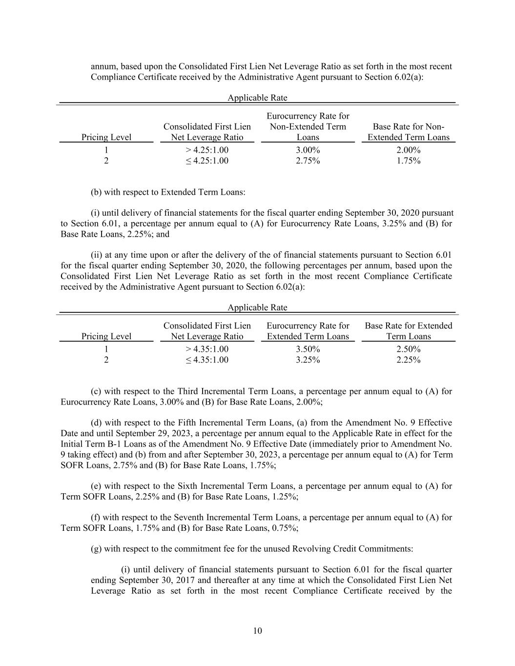 annum, based upon the Consolidated First Lien Net Leverage Ratio as set forth in the most recentCompliance Certificate received by the Administrative Agent pursuant to Section 6.02(a):Applicable RatePricing Level Consolidated First LienNet Leverage Ratio Eurocurrency Rate forNon-Extended TermLoans Base Rate for Non-Extended Term Loans1 > 4.25:1.00 3.00% 2.00%2 ≤ 4.25:1.00 2.75% 1.75%(b) with respect to Extended Term Loans:(i) until delivery of financial statements for the fiscal quarter ending September 30, 2020 pursuantto Section 6.01, a percentage per annum equal to (A) for Eurocurrency Rate Loans, 3.25% and (B) forBase Rate Loans, 2.25%; and(ii) at any time upon or after the delivery of the of financial statements pursuant to Section 6.01for the fiscal quarter ending September 30, 2020, the following percentages per annum, based upon theConsolidated First Lien Net Leverage Ratio as set forth in the most recent Compliance Certificatereceived by the Administrative Agent pursuant to Section 6.02(a):Applicable RatePricing Level Consolidated First LienNet Leverage Ratio Eurocurrency Rate forExtended Term Loans Base Rate for ExtendedTerm Loans1 > 4.35:1.00 3.50% 2.50%2 ≤ 4.35:1.00 3.25% 2.25% (c) with respect to the Third Incremental Term Loans, a percentage per annum equal to (A) forEurocurrency Rate Loans, 3.00% and (B) for Base Rate Loans, 2.00%;(d) with respect to the Fifth Incremental Term Loans, (a) from the Amendment No. 9 EffectiveDate and until September 29, 2023, a percentage per annum equal to the Applicable Rate in effect for theInitial Term B-1 Loans as of the Amendment No. 9 Effective Date (immediately prior to Amendment No.9 taking effect) and (b) from and after September 30, 2023, a percentage per annum equal to (A) for TermSOFR Loans, 2.75% and (B) for Base Rate Loans, 1.75%;(e) with respect to the Sixth Incremental Term Loans, a percentage per annum equal to (A) forTerm SOFR Loans, 2.25% and (B) for Base Rate Loans, 1.25%;(f) with respect to the Seventh Incremental Term Loans, a percentage per annum equal to (A) forTerm SOFR Loans, 1.75% and (B) for Base Rate Loans, 0.75%;(g) with respect to the commitment fee for the unused Revolving Credit Commitments:(i) until delivery of financial statements pursuant to Section 6.01 for the fiscal quarterending September 30, 2017 and thereafter at any time at which the Consolidated First Lien NetLeverage Ratio as set forth in the most recent Compliance Certificate received by the10
