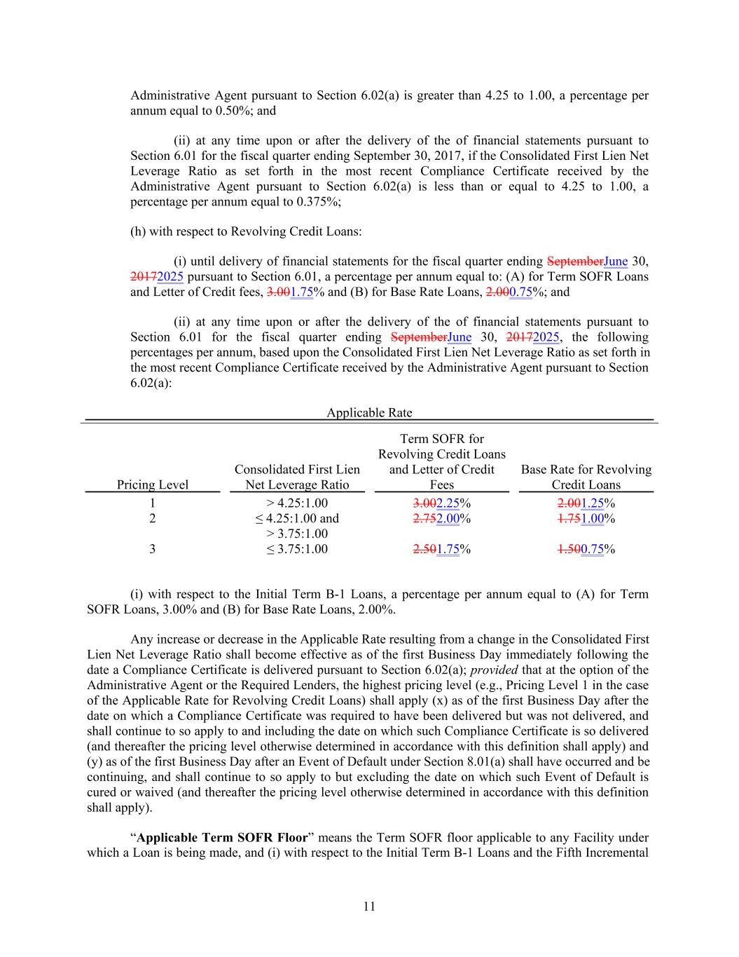 Administrative Agent pursuant to Section 6.02(a) is greater than 4.25 to 1.00, a percentage perannum equal to 0.50%; and(ii) at any time upon or after the delivery of the of financial statements pursuant toSection 6.01 for the fiscal quarter ending September 30, 2017, if the Consolidated First Lien NetLeverage Ratio as set forth in the most recent Compliance Certificate received by theAdministrative Agent pursuant to Section 6.02(a) is less than or equal to 4.25 to 1.00, apercentage per annum equal to 0.375%;(h) with respect to Revolving Credit Loans:(i) until delivery of financial statements for the fiscal quarter ending SeptemberJune 30,20172025 pursuant to Section 6.01, a percentage per annum equal to: (A) for Term SOFR Loansand Letter of Credit fees, 3.001.75% and (B) for Base Rate Loans, 2.000.75%; and(ii) at any time upon or after the delivery of the of financial statements pursuant toSection 6.01 for the fiscal quarter ending SeptemberJune 30, 20172025, the followingpercentages per annum, based upon the Consolidated First Lien Net Leverage Ratio as set forth inthe most recent Compliance Certificate received by the Administrative Agent pursuant to Section6.02(a): Applicable RatePricing Level Consolidated First LienNet Leverage Ratio Term SOFR forRevolving Credit Loansand Letter of CreditFees Base Rate for RevolvingCredit Loans1 > 4.25:1.00 3.002.25% 2.001.25%2 ≤ 4.25:1.00 and> 3.75:1.00 2.752.00% 1.751.00%3 ≤ 3.75:1.00 2.501.75% 1.500.75%(i) with respect to the Initial Term B-1 Loans, a percentage per annum equal to (A) for TermSOFR Loans, 3.00% and (B) for Base Rate Loans, 2.00%.Any increase or decrease in the Applicable Rate resulting from a change in the Consolidated FirstLien Net Leverage Ratio shall become effective as of the first Business Day immediately following thedate a Compliance Certificate is delivered pursuant to Section 6.02(a); provided that at the option of theAdministrative Agent or the Required Lenders, the highest pricing level (e.g., Pricing Level 1 in the caseof the Applicable Rate for Revolving Credit Loans) shall apply (x) as of the first Business Day after thedate on which a Compliance Certificate was required to have been delivered but was not delivered, andshall continue to so apply to and including the date on which such Compliance Certificate is so delivered(and thereafter the pricing level otherwise determined in accordance with this definition shall apply) and(y) as of the first Business Day after an Event of Default under Section 8.01(a) shall have occurred and becontinuing, and shall continue to so apply to but excluding the date on which such Event of Default iscured or waived (and thereafter the pricing level otherwise determined in accordance with this definitionshall apply).“Applicable Term SOFR Floor” means the Term SOFR floor applicable to any Facility underwhich a Loan is being made, and (i) with respect to the Initial Term B-1 Loans and the Fifth Incremental11