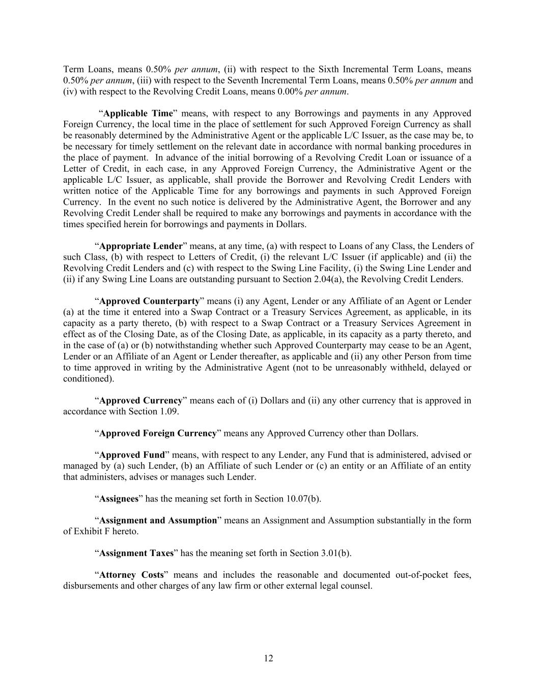 Term Loans, means 0.50% per annum, (ii) with respect to the Sixth Incremental Term Loans, means0.50% per annum, (iii) with respect to the Seventh Incremental Term Loans, means 0.50% per annum and(iv) with respect to the Revolving Credit Loans, means 0.00% per annum. “Applicable Time” means, with respect to any Borrowings and payments in any ApprovedForeign Currency, the local time in the place of settlement for such Approved Foreign Currency as shallbe reasonably determined by the Administrative Agent or the applicable L/C Issuer, as the case may be, tobe necessary for timely settlement on the relevant date in accordance with normal banking procedures inthe place of payment. In advance of the initial borrowing of a Revolving Credit Loan or issuance of aLetter of Credit, in each case, in any Approved Foreign Currency, the Administrative Agent or theapplicable L/C Issuer, as applicable, shall provide the Borrower and Revolving Credit Lenders withwritten notice of the Applicable Time for any borrowings and payments in such Approved ForeignCurrency. In the event no such notice is delivered by the Administrative Agent, the Borrower and anyRevolving Credit Lender shall be required to make any borrowings and payments in accordance with thetimes specified herein for borrowings and payments in Dollars.“Appropriate Lender” means, at any time, (a) with respect to Loans of any Class, the Lenders ofsuch Class, (b) with respect to Letters of Credit, (i) the relevant L/C Issuer (if applicable) and (ii) theRevolving Credit Lenders and (c) with respect to the Swing Line Facility, (i) the Swing Line Lender and(ii) if any Swing Line Loans are outstanding pursuant to Section 2.04(a), the Revolving Credit Lenders.“Approved Counterparty” means (i) any Agent, Lender or any Affiliate of an Agent or Lender(a) at the time it entered into a Swap Contract or a Treasury Services Agreement, as applicable, in itscapacity as a party thereto, (b) with respect to a Swap Contract or a Treasury Services Agreement ineffect as of the Closing Date, as of the Closing Date, as applicable, in its capacity as a party thereto, andin the case of (a) or (b) notwithstanding whether such Approved Counterparty may cease to be an Agent,Lender or an Affiliate of an Agent or Lender thereafter, as applicable and (ii) any other Person from timeto time approved in writing by the Administrative Agent (not to be unreasonably withheld, delayed orconditioned).“Approved Currency” means each of (i) Dollars and (ii) any other currency that is approved inaccordance with Section 1.09.“Approved Foreign Currency” means any Approved Currency other than Dollars.“Approved Fund” means, with respect to any Lender, any Fund that is administered, advised ormanaged by (a) such Lender, (b) an Affiliate of such Lender or (c) an entity or an Affiliate of an entitythat administers, advises or manages such Lender.“Assignees” has the meaning set forth in Section 10.07(b).“Assignment and Assumption” means an Assignment and Assumption substantially in the formof Exhibit F hereto.“Assignment Taxes” has the meaning set forth in Section 3.01(b).“Attorney Costs” means and includes the reasonable and documented out-of-pocket fees,disbursements and other charges of any law firm or other external legal counsel.12