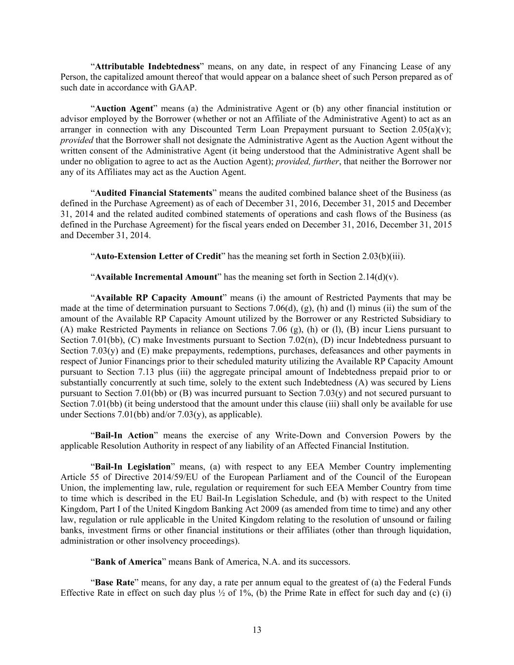 “Attributable Indebtedness” means, on any date, in respect of any Financing Lease of anyPerson, the capitalized amount thereof that would appear on a balance sheet of such Person prepared as ofsuch date in accordance with GAAP.“Auction Agent” means (a) the Administrative Agent or (b) any other financial institution oradvisor employed by the Borrower (whether or not an Affiliate of the Administrative Agent) to act as anarranger in connection with any Discounted Term Loan Prepayment pursuant to Section 2.05(a)(v);provided that the Borrower shall not designate the Administrative Agent as the Auction Agent without thewritten consent of the Administrative Agent (it being understood that the Administrative Agent shall beunder no obligation to agree to act as the Auction Agent); provided, further, that neither the Borrower norany of its Affiliates may act as the Auction Agent.“Audited Financial Statements” means the audited combined balance sheet of the Business (asdefined in the Purchase Agreement) as of each of December 31, 2016, December 31, 2015 and December31, 2014 and the related audited combined statements of operations and cash flows of the Business (asdefined in the Purchase Agreement) for the fiscal years ended on December 31, 2016, December 31, 2015and December 31, 2014.“Auto-Extension Letter of Credit” has the meaning set forth in Section 2.03(b)(iii).“Available Incremental Amount” has the meaning set forth in Section 2.14(d)(v).“Available RP Capacity Amount” means (i) the amount of Restricted Payments that may bemade at the time of determination pursuant to Sections 7.06(d), (g), (h) and (l) minus (ii) the sum of theamount of the Available RP Capacity Amount utilized by the Borrower or any Restricted Subsidiary to(A) make Restricted Payments in reliance on Sections 7.06 (g), (h) or (l), (B) incur Liens pursuant toSection 7.01(bb), (C) make Investments pursuant to Section 7.02(n), (D) incur Indebtedness pursuant toSection 7.03(y) and (E) make prepayments, redemptions, purchases, defeasances and other payments inrespect of Junior Financings prior to their scheduled maturity utilizing the Available RP Capacity Amountpursuant to Section 7.13 plus (iii) the aggregate principal amount of Indebtedness prepaid prior to orsubstantially concurrently at such time, solely to the extent such Indebtedness (A) was secured by Lienspursuant to Section 7.01(bb) or (B) was incurred pursuant to Section 7.03(y) and not secured pursuant toSection 7.01(bb) (it being understood that the amount under this clause (iii) shall only be available for useunder Sections 7.01(bb) and/or 7.03(y), as applicable).“Bail-In Action” means the exercise of any Write-Down and Conversion Powers by theapplicable Resolution Authority in respect of any liability of an Affected Financial Institution.“Bail-In Legislation” means, (a) with respect to any EEA Member Country implementingArticle 55 of Directive 2014/59/EU of the European Parliament and of the Council of the EuropeanUnion, the implementing law, rule, regulation or requirement for such EEA Member Country from timeto time which is described in the EU Bail-In Legislation Schedule, and (b) with respect to the UnitedKingdom, Part I of the United Kingdom Banking Act 2009 (as amended from time to time) and any otherlaw, regulation or rule applicable in the United Kingdom relating to the resolution of unsound or failingbanks, investment firms or other financial institutions or their affiliates (other than through liquidation,administration or other insolvency proceedings).“Bank of America” means Bank of America, N.A. and its successors.“Base Rate” means, for any day, a rate per annum equal to the greatest of (a) the Federal FundsEffective Rate in effect on such day plus ½ of 1%, (b) the Prime Rate in effect for such day and (c) (i)13