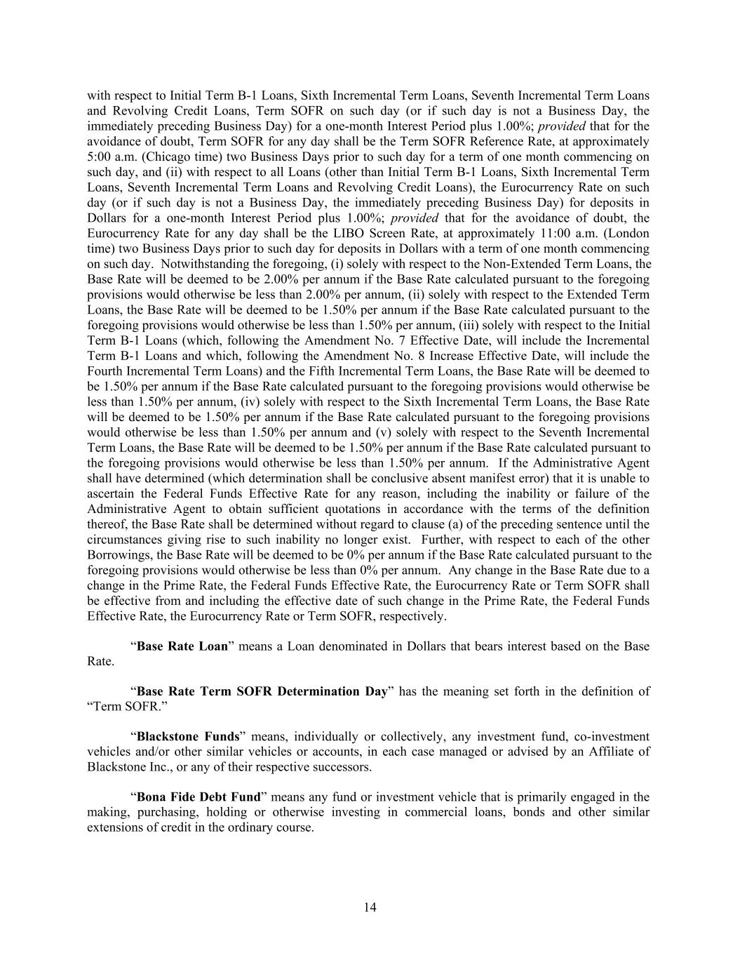 with respect to Initial Term B-1 Loans, Sixth Incremental Term Loans, Seventh Incremental Term Loansand Revolving Credit Loans, Term SOFR on such day (or if such day is not a Business Day, theimmediately preceding Business Day) for a one-month Interest Period plus 1.00%; provided that for theavoidance of doubt, Term SOFR for any day shall be the Term SOFR Reference Rate, at approximately5:00 a.m. (Chicago time) two Business Days prior to such day for a term of one month commencing onsuch day, and (ii) with respect to all Loans (other than Initial Term B-1 Loans, Sixth Incremental TermLoans, Seventh Incremental Term Loans and Revolving Credit Loans), the Eurocurrency Rate on suchday (or if such day is not a Business Day, the immediately preceding Business Day) for deposits inDollars for a one-month Interest Period plus 1.00%; provided that for the avoidance of doubt, theEurocurrency Rate for any day shall be the LIBO Screen Rate, at approximately 11:00 a.m. (Londontime) two Business Days prior to such day for deposits in Dollars with a term of one month commencingon such day. Notwithstanding the foregoing, (i) solely with respect to the Non-Extended Term Loans, theBase Rate will be deemed to be 2.00% per annum if the Base Rate calculated pursuant to the foregoingprovisions would otherwise be less than 2.00% per annum, (ii) solely with respect to the Extended TermLoans, the Base Rate will be deemed to be 1.50% per annum if the Base Rate calculated pursuant to theforegoing provisions would otherwise be less than 1.50% per annum, (iii) solely with respect to the InitialTerm B-1 Loans (which, following the Amendment No. 7 Effective Date, will include the IncrementalTerm B-1 Loans and which, following the Amendment No. 8 Increase Effective Date, will include theFourth Incremental Term Loans) and the Fifth Incremental Term Loans, the Base Rate will be deemed tobe 1.50% per annum if the Base Rate calculated pursuant to the foregoing provisions would otherwise beless than 1.50% per annum, (iv) solely with respect to the Sixth Incremental Term Loans, the Base Ratewill be deemed to be 1.50% per annum if the Base Rate calculated pursuant to the foregoing provisionswould otherwise be less than 1.50% per annum and (v) solely with respect to the Seventh IncrementalTerm Loans, the Base Rate will be deemed to be 1.50% per annum if the Base Rate calculated pursuant tothe foregoing provisions would otherwise be less than 1.50% per annum. If the Administrative Agentshall have determined (which determination shall be conclusive absent manifest error) that it is unable toascertain the Federal Funds Effective Rate for any reason, including the inability or failure of theAdministrative Agent to obtain sufficient quotations in accordance with the terms of the definitionthereof, the Base Rate shall be determined without regard to clause (a) of the preceding sentence until thecircumstances giving rise to such inability no longer exist. Further, with respect to each of the otherBorrowings, the Base Rate will be deemed to be 0% per annum if the Base Rate calculated pursuant to theforegoing provisions would otherwise be less than 0% per annum. Any change in the Base Rate due to achange in the Prime Rate, the Federal Funds Effective Rate, the Eurocurrency Rate or Term SOFR shallbe effective from and including the effective date of such change in the Prime Rate, the Federal FundsEffective Rate, the Eurocurrency Rate or Term SOFR, respectively.“Base Rate Loan” means a Loan denominated in Dollars that bears interest based on the BaseRate. “Base Rate Term SOFR Determination Day” has the meaning set forth in the definition of“Term SOFR.”“Blackstone Funds” means, individually or collectively, any investment fund, co-investmentvehicles and/or other similar vehicles or accounts, in each case managed or advised by an Affiliate ofBlackstone Inc., or any of their respective successors.“Bona Fide Debt Fund” means any fund or investment vehicle that is primarily engaged in themaking, purchasing, holding or otherwise investing in commercial loans, bonds and other similarextensions of credit in the ordinary course. 14