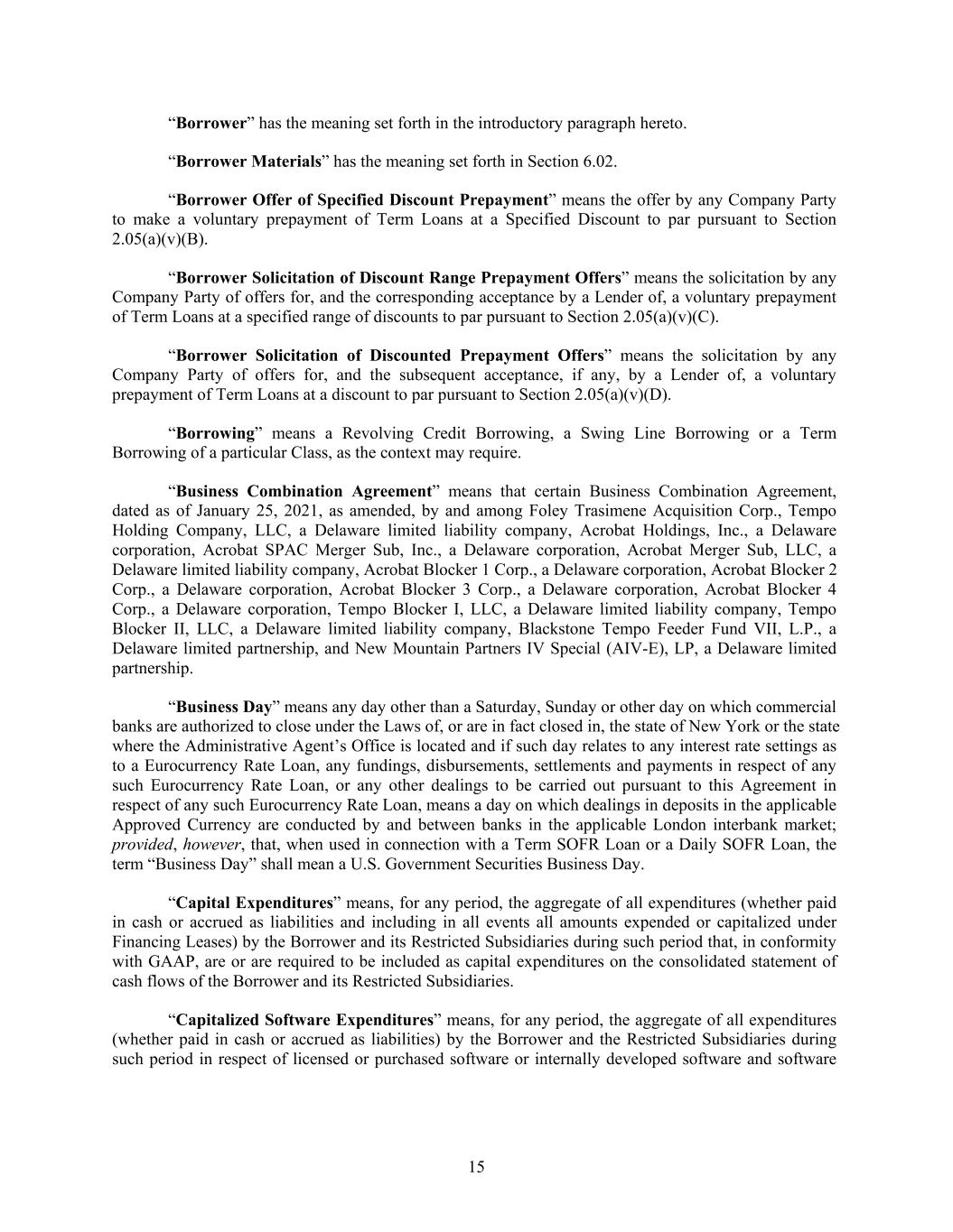 “Borrower” has the meaning set forth in the introductory paragraph hereto.“Borrower Materials” has the meaning set forth in Section 6.02.“Borrower Offer of Specified Discount Prepayment” means the offer by any Company Partyto make a voluntary prepayment of Term Loans at a Specified Discount to par pursuant to Section2.05(a)(v)(B).“Borrower Solicitation of Discount Range Prepayment Offers” means the solicitation by anyCompany Party of offers for, and the corresponding acceptance by a Lender of, a voluntary prepaymentof Term Loans at a specified range of discounts to par pursuant to Section 2.05(a)(v)(C).“Borrower Solicitation of Discounted Prepayment Offers” means the solicitation by anyCompany Party of offers for, and the subsequent acceptance, if any, by a Lender of, a voluntaryprepayment of Term Loans at a discount to par pursuant to Section 2.05(a)(v)(D).“Borrowing” means a Revolving Credit Borrowing, a Swing Line Borrowing or a TermBorrowing of a particular Class, as the context may require.“Business Combination Agreement” means that certain Business Combination Agreement,dated as of January 25, 2021, as amended, by and among Foley Trasimene Acquisition Corp., TempoHolding Company, LLC, a Delaware limited liability company, Acrobat Holdings, Inc., a Delawarecorporation, Acrobat SPAC Merger Sub, Inc., a Delaware corporation, Acrobat Merger Sub, LLC, aDelaware limited liability company, Acrobat Blocker 1 Corp., a Delaware corporation, Acrobat Blocker 2Corp., a Delaware corporation, Acrobat Blocker 3 Corp., a Delaware corporation, Acrobat Blocker 4Corp., a Delaware corporation, Tempo Blocker I, LLC, a Delaware limited liability company, TempoBlocker II, LLC, a Delaware limited liability company, Blackstone Tempo Feeder Fund VII, L.P., aDelaware limited partnership, and New Mountain Partners IV Special (AIV-E), LP, a Delaware limitedpartnership.“Business Day” means any day other than a Saturday, Sunday or other day on which commercialbanks are authorized to close under the Laws of, or are in fact closed in, the state of New York or the statewhere the Administrative Agent’s Office is located and if such day relates to any interest rate settings asto a Eurocurrency Rate Loan, any fundings, disbursements, settlements and payments in respect of anysuch Eurocurrency Rate Loan, or any other dealings to be carried out pursuant to this Agreement inrespect of any such Eurocurrency Rate Loan, means a day on which dealings in deposits in the applicableApproved Currency are conducted by and between banks in the applicable London interbank market;provided, however, that, when used in connection with a Term SOFR Loan or a Daily SOFR Loan, theterm “Business Day” shall mean a U.S. Government Securities Business Day.“Capital Expenditures” means, for any period, the aggregate of all expenditures (whether paidin cash or accrued as liabilities and including in all events all amounts expended or capitalized underFinancing Leases) by the Borrower and its Restricted Subsidiaries during such period that, in conformitywith GAAP, are or are required to be included as capital expenditures on the consolidated statement ofcash flows of the Borrower and its Restricted Subsidiaries.“Capitalized Software Expenditures” means, for any period, the aggregate of all expenditures(whether paid in cash or accrued as liabilities) by the Borrower and the Restricted Subsidiaries duringsuch period in respect of licensed or purchased software or internally developed software and software15