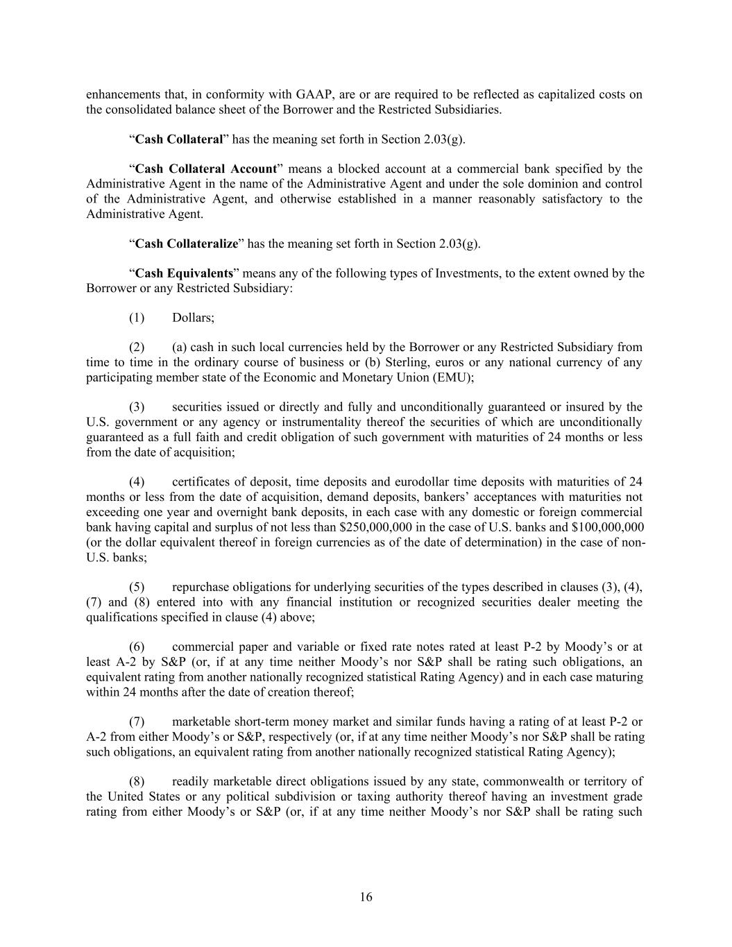 enhancements that, in conformity with GAAP, are or are required to be reflected as capitalized costs onthe consolidated balance sheet of the Borrower and the Restricted Subsidiaries.“Cash Collateral” has the meaning set forth in Section 2.03(g).“Cash Collateral Account” means a blocked account at a commercial bank specified by theAdministrative Agent in the name of the Administrative Agent and under the sole dominion and controlof the Administrative Agent, and otherwise established in a manner reasonably satisfactory to theAdministrative Agent.“Cash Collateralize” has the meaning set forth in Section 2.03(g).“Cash Equivalents” means any of the following types of Investments, to the extent owned by theBorrower or any Restricted Subsidiary:(1) Dollars;(2) (a) cash in such local currencies held by the Borrower or any Restricted Subsidiary fromtime to time in the ordinary course of business or (b) Sterling, euros or any national currency of anyparticipating member state of the Economic and Monetary Union (EMU);(3) securities issued or directly and fully and unconditionally guaranteed or insured by theU.S. government or any agency or instrumentality thereof the securities of which are unconditionallyguaranteed as a full faith and credit obligation of such government with maturities of 24 months or lessfrom the date of acquisition;(4) certificates of deposit, time deposits and eurodollar time deposits with maturities of 24months or less from the date of acquisition, demand deposits, bankers’ acceptances with maturities notexceeding one year and overnight bank deposits, in each case with any domestic or foreign commercialbank having capital and surplus of not less than $250,000,000 in the case of U.S. banks and $100,000,000(or the dollar equivalent thereof in foreign currencies as of the date of determination) in the case of non-U.S. banks;(5) repurchase obligations for underlying securities of the types described in clauses (3), (4),(7) and (8) entered into with any financial institution or recognized securities dealer meeting thequalifications specified in clause (4) above;(6) commercial paper and variable or fixed rate notes rated at least P-2 by Moody’s or atleast A-2 by S&P (or, if at any time neither Moody’s nor S&P shall be rating such obligations, anequivalent rating from another nationally recognized statistical Rating Agency) and in each case maturingwithin 24 months after the date of creation thereof;(7) marketable short-term money market and similar funds having a rating of at least P-2 orA-2 from either Moody’s or S&P, respectively (or, if at any time neither Moody’s nor S&P shall be ratingsuch obligations, an equivalent rating from another nationally recognized statistical Rating Agency);(8) readily marketable direct obligations issued by any state, commonwealth or territory ofthe United States or any political subdivision or taxing authority thereof having an investment graderating from either Moody’s or S&P (or, if at any time neither Moody’s nor S&P shall be rating such16