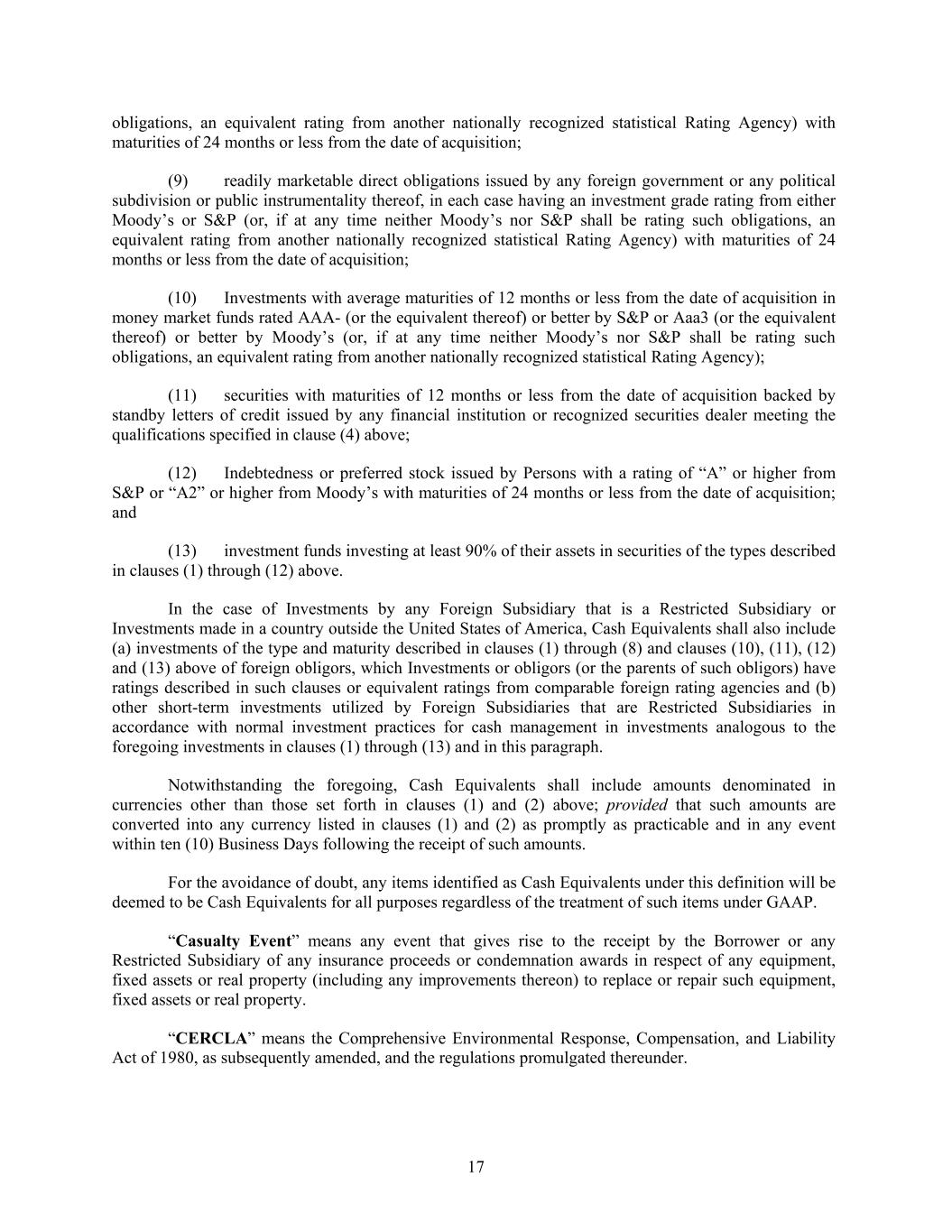 obligations, an equivalent rating from another nationally recognized statistical Rating Agency) withmaturities of 24 months or less from the date of acquisition;(9) readily marketable direct obligations issued by any foreign government or any politicalsubdivision or public instrumentality thereof, in each case having an investment grade rating from eitherMoody’s or S&P (or, if at any time neither Moody’s nor S&P shall be rating such obligations, anequivalent rating from another nationally recognized statistical Rating Agency) with maturities of 24months or less from the date of acquisition;(10) Investments with average maturities of 12 months or less from the date of acquisition inmoney market funds rated AAA- (or the equivalent thereof) or better by S&P or Aaa3 (or the equivalentthereof) or better by Moody’s (or, if at any time neither Moody’s nor S&P shall be rating suchobligations, an equivalent rating from another nationally recognized statistical Rating Agency);(11) securities with maturities of 12 months or less from the date of acquisition backed bystandby letters of credit issued by any financial institution or recognized securities dealer meeting thequalifications specified in clause (4) above;(12) Indebtedness or preferred stock issued by Persons with a rating of “A” or higher fromS&P or “A2” or higher from Moody’s with maturities of 24 months or less from the date of acquisition;and (13) investment funds investing at least 90% of their assets in securities of the types describedin clauses (1) through (12) above.In the case of Investments by any Foreign Subsidiary that is a Restricted Subsidiary orInvestments made in a country outside the United States of America, Cash Equivalents shall also include(a) investments of the type and maturity described in clauses (1) through (8) and clauses (10), (11), (12)and (13) above of foreign obligors, which Investments or obligors (or the parents of such obligors) haveratings described in such clauses or equivalent ratings from comparable foreign rating agencies and (b)other short-term investments utilized by Foreign Subsidiaries that are Restricted Subsidiaries inaccordance with normal investment practices for cash management in investments analogous to theforegoing investments in clauses (1) through (13) and in this paragraph.Notwithstanding the foregoing, Cash Equivalents shall include amounts denominated incurrencies other than those set forth in clauses (1) and (2) above; provided that such amounts areconverted into any currency listed in clauses (1) and (2) as promptly as practicable and in any eventwithin ten (10) Business Days following the receipt of such amounts.For the avoidance of doubt, any items identified as Cash Equivalents under this definition will bedeemed to be Cash Equivalents for all purposes regardless of the treatment of such items under GAAP.“Casualty Event” means any event that gives rise to the receipt by the Borrower or anyRestricted Subsidiary of any insurance proceeds or condemnation awards in respect of any equipment,fixed assets or real property (including any improvements thereon) to replace or repair such equipment,fixed assets or real property.“CERCLA” means the Comprehensive Environmental Response, Compensation, and LiabilityAct of 1980, as subsequently amended, and the regulations promulgated thereunder.17