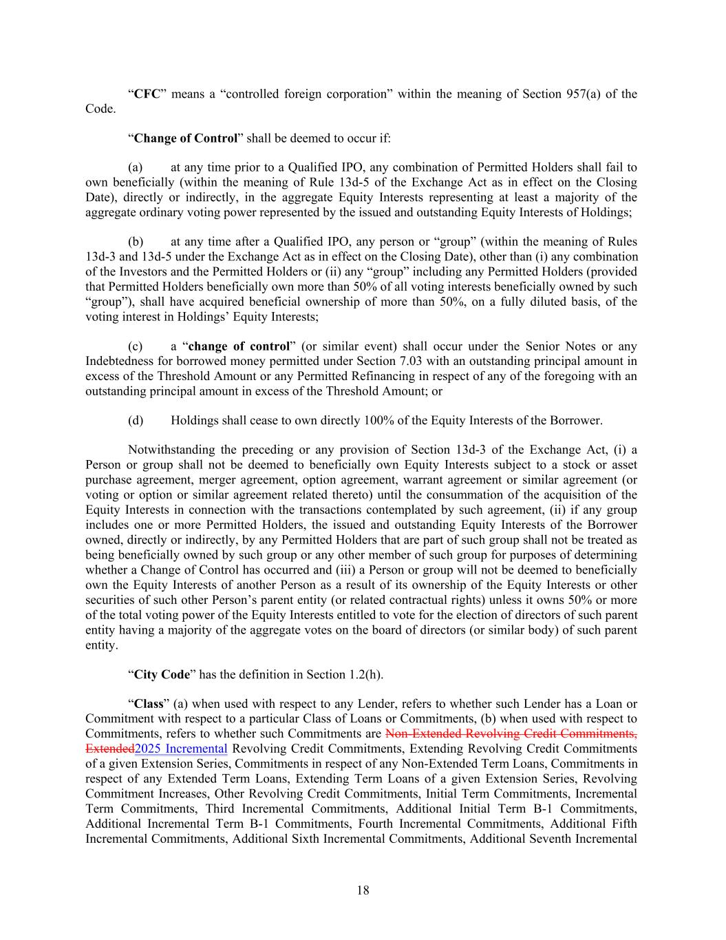 “CFC” means a “controlled foreign corporation” within the meaning of Section 957(a) of theCode. “Change of Control” shall be deemed to occur if:(a) at any time prior to a Qualified IPO, any combination of Permitted Holders shall fail toown beneficially (within the meaning of Rule 13d-5 of the Exchange Act as in effect on the ClosingDate), directly or indirectly, in the aggregate Equity Interests representing at least a majority of theaggregate ordinary voting power represented by the issued and outstanding Equity Interests of Holdings;(b) at any time after a Qualified IPO, any person or “group” (within the meaning of Rules13d-3 and 13d-5 under the Exchange Act as in effect on the Closing Date), other than (i) any combinationof the Investors and the Permitted Holders or (ii) any “group” including any Permitted Holders (providedthat Permitted Holders beneficially own more than 50% of all voting interests beneficially owned by such“group”), shall have acquired beneficial ownership of more than 50%, on a fully diluted basis, of thevoting interest in Holdings’ Equity Interests;(c) a “change of control” (or similar event) shall occur under the Senior Notes or anyIndebtedness for borrowed money permitted under Section 7.03 with an outstanding principal amount inexcess of the Threshold Amount or any Permitted Refinancing in respect of any of the foregoing with anoutstanding principal amount in excess of the Threshold Amount; or(d) Holdings shall cease to own directly 100% of the Equity Interests of the Borrower.Notwithstanding the preceding or any provision of Section 13d-3 of the Exchange Act, (i) aPerson or group shall not be deemed to beneficially own Equity Interests subject to a stock or assetpurchase agreement, merger agreement, option agreement, warrant agreement or similar agreement (orvoting or option or similar agreement related thereto) until the consummation of the acquisition of theEquity Interests in connection with the transactions contemplated by such agreement, (ii) if any groupincludes one or more Permitted Holders, the issued and outstanding Equity Interests of the Borrowerowned, directly or indirectly, by any Permitted Holders that are part of such group shall not be treated asbeing beneficially owned by such group or any other member of such group for purposes of determiningwhether a Change of Control has occurred and (iii) a Person or group will not be deemed to beneficiallyown the Equity Interests of another Person as a result of its ownership of the Equity Interests or othersecurities of such other Person’s parent entity (or related contractual rights) unless it owns 50% or moreof the total voting power of the Equity Interests entitled to vote for the election of directors of such parententity having a majority of the aggregate votes on the board of directors (or similar body) of such parententity. “City Code” has the definition in Section 1.2(h).“Class” (a) when used with respect to any Lender, refers to whether such Lender has a Loan orCommitment with respect to a particular Class of Loans or Commitments, (b) when used with respect toCommitments, refers to whether such Commitments are Non-Extended Revolving Credit Commitments,Extended2025 Incremental Revolving Credit Commitments, Extending Revolving Credit Commitmentsof a given Extension Series, Commitments in respect of any Non-Extended Term Loans, Commitments inrespect of any Extended Term Loans, Extending Term Loans of a given Extension Series, RevolvingCommitment Increases, Other Revolving Credit Commitments, Initial Term Commitments, IncrementalTerm Commitments, Third Incremental Commitments, Additional Initial Term B-1 Commitments,Additional Incremental Term B-1 Commitments, Fourth Incremental Commitments, Additional FifthIncremental Commitments, Additional Sixth Incremental Commitments, Additional Seventh Incremental18