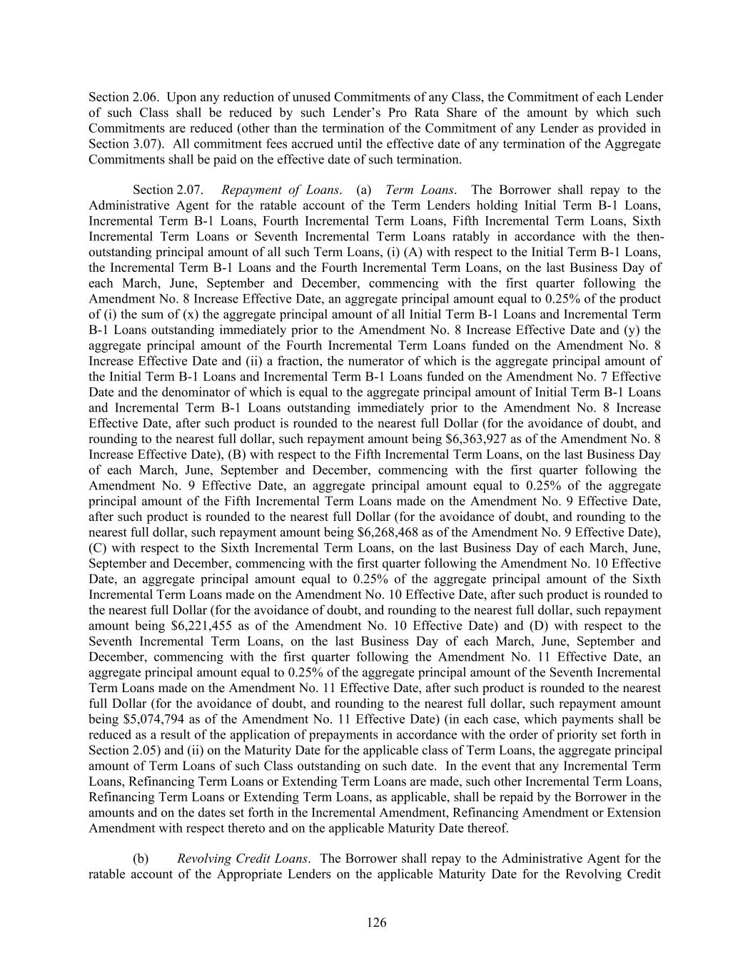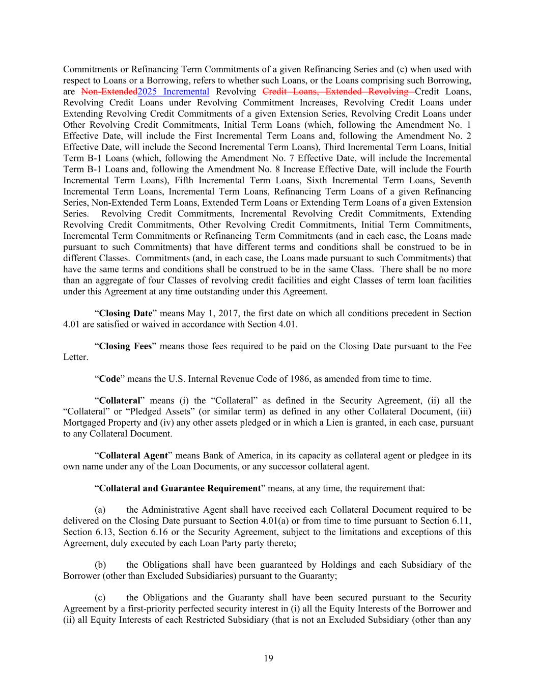 Commitments or Refinancing Term Commitments of a given Refinancing Series and (c) when used withrespect to Loans or a Borrowing, refers to whether such Loans, or the Loans comprising such Borrowing,are Non-Extended2025 Incremental Revolving Credit Loans, Extended Revolving Credit Loans,Revolving Credit Loans under Revolving Commitment Increases, Revolving Credit Loans underExtending Revolving Credit Commitments of a given Extension Series, Revolving Credit Loans underOther Revolving Credit Commitments, Initial Term Loans (which, following the Amendment No. 1Effective Date, will include the First Incremental Term Loans and, following the Amendment No. 2Effective Date, will include the Second Incremental Term Loans), Third Incremental Term Loans, InitialTerm B-1 Loans (which, following the Amendment No. 7 Effective Date, will include the IncrementalTerm B-1 Loans and, following the Amendment No. 8 Increase Effective Date, will include the FourthIncremental Term Loans), Fifth Incremental Term Loans, Sixth Incremental Term Loans, SeventhIncremental Term Loans, Incremental Term Loans, Refinancing Term Loans of a given RefinancingSeries, Non-Extended Term Loans, Extended Term Loans or Extending Term Loans of a given ExtensionSeries. Revolving Credit Commitments, Incremental Revolving Credit Commitments, ExtendingRevolving Credit Commitments, Other Revolving Credit Commitments, Initial Term Commitments,Incremental Term Commitments or Refinancing Term Commitments (and in each case, the Loans madepursuant to such Commitments) that have different terms and conditions shall be construed to be indifferent Classes. Commitments (and, in each case, the Loans made pursuant to such Commitments) thathave the same terms and conditions shall be construed to be in the same Class. There shall be no morethan an aggregate of four Classes of revolving credit facilities and eight Classes of term loan facilitiesunder this Agreement at any time outstanding under this Agreement.“Closing Date” means May 1, 2017, the first date on which all conditions precedent in Section4.01 are satisfied or waived in accordance with Section 4.01.“Closing Fees” means those fees required to be paid on the Closing Date pursuant to the FeeLetter. “Code” means the U.S. Internal Revenue Code of 1986, as amended from time to time.“Collateral” means (i) the “Collateral” as defined in the Security Agreement, (ii) all the“Collateral” or “Pledged Assets” (or similar term) as defined in any other Collateral Document, (iii)Mortgaged Property and (iv) any other assets pledged or in which a Lien is granted, in each case, pursuantto any Collateral Document.“Collateral Agent” means Bank of America, in its capacity as collateral agent or pledgee in itsown name under any of the Loan Documents, or any successor collateral agent.“Collateral and Guarantee Requirement” means, at any time, the requirement that:(a) the Administrative Agent shall have received each Collateral Document required to bedelivered on the Closing Date pursuant to Section 4.01(a) or from time to time pursuant to Section 6.11, Section 6.13, Section 6.16 or the Security Agreement, subject to the limitations and exceptions of thisAgreement, duly executed by each Loan Party party thereto;(b) the Obligations shall have been guaranteed by Holdings and each Subsidiary of theBorrower (other than Excluded Subsidiaries) pursuant to the Guaranty;(c) the Obligations and the Guaranty shall have been secured pursuant to the SecurityAgreement by a first-priority perfected security interest in (i) all the Equity Interests of the Borrower and(ii) all Equity Interests of each Restricted Subsidiary (that is not an Excluded Subsidiary (other than any19