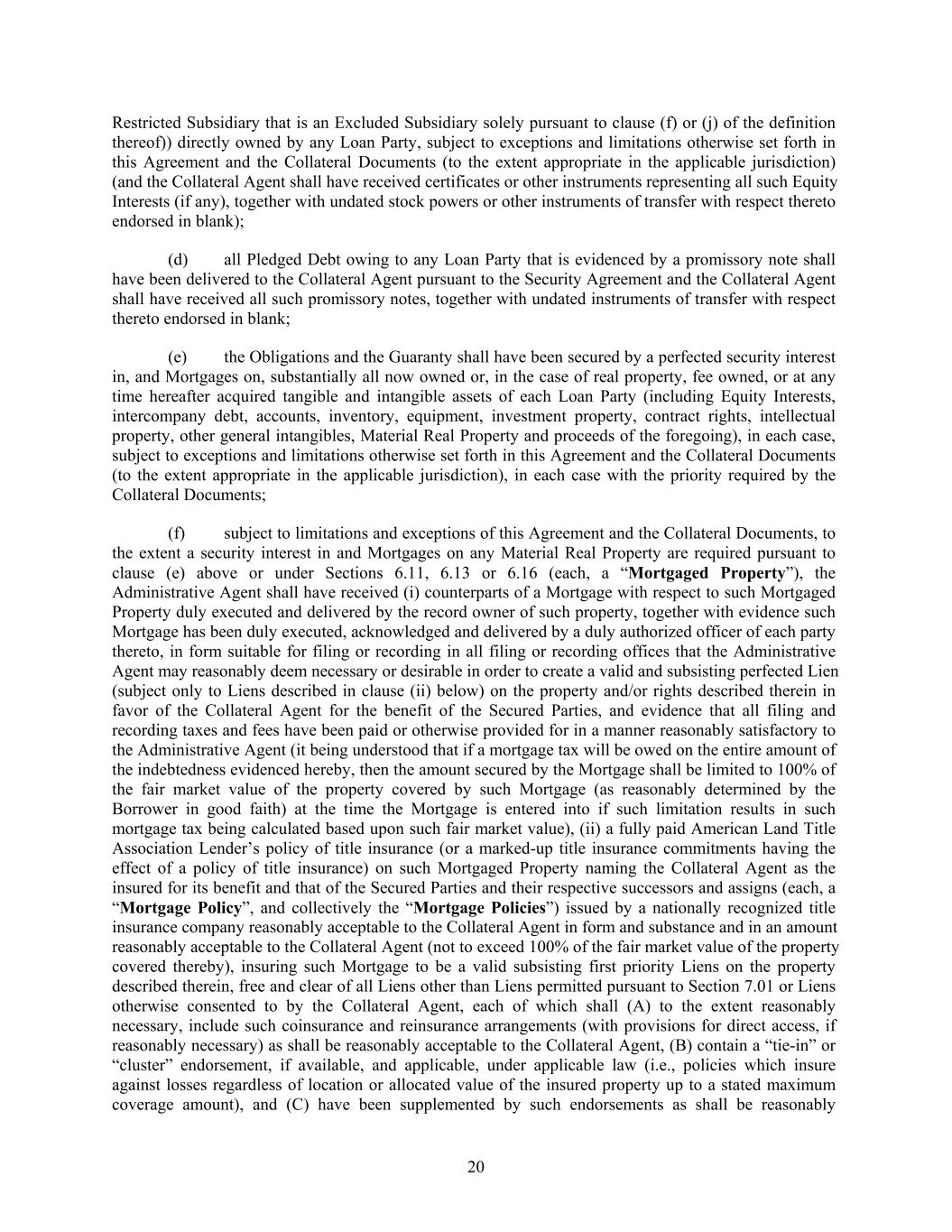 Restricted Subsidiary that is an Excluded Subsidiary solely pursuant to clause (f) or (j) of the definitionthereof)) directly owned by any Loan Party, subject to exceptions and limitations otherwise set forth inthis Agreement and the Collateral Documents (to the extent appropriate in the applicable jurisdiction)(and the Collateral Agent shall have received certificates or other instruments representing all such EquityInterests (if any), together with undated stock powers or other instruments of transfer with respect theretoendorsed in blank);(d) all Pledged Debt owing to any Loan Party that is evidenced by a promissory note shallhave been delivered to the Collateral Agent pursuant to the Security Agreement and the Collateral Agentshall have received all such promissory notes, together with undated instruments of transfer with respectthereto endorsed in blank;(e) the Obligations and the Guaranty shall have been secured by a perfected security interestin, and Mortgages on, substantially all now owned or, in the case of real property, fee owned, or at anytime hereafter acquired tangible and intangible assets of each Loan Party (including Equity Interests,intercompany debt, accounts, inventory, equipment, investment property, contract rights, intellectualproperty, other general intangibles, Material Real Property and proceeds of the foregoing), in each case,subject to exceptions and limitations otherwise set forth in this Agreement and the Collateral Documents(to the extent appropriate in the applicable jurisdiction), in each case with the priority required by theCollateral Documents;(f) subject to limitations and exceptions of this Agreement and the Collateral Documents, tothe extent a security interest in and Mortgages on any Material Real Property are required pursuant toclause (e) above or under Sections 6.11, 6.13 or 6.16 (each, a “Mortgaged Property”), theAdministrative Agent shall have received (i) counterparts of a Mortgage with respect to such MortgagedProperty duly executed and delivered by the record owner of such property, together with evidence suchMortgage has been duly executed, acknowledged and delivered by a duly authorized officer of each partythereto, in form suitable for filing or recording in all filing or recording offices that the AdministrativeAgent may reasonably deem necessary or desirable in order to create a valid and subsisting perfected Lien(subject only to Liens described in clause (ii) below) on the property and/or rights described therein infavor of the Collateral Agent for the benefit of the Secured Parties, and evidence that all filing andrecording taxes and fees have been paid or otherwise provided for in a manner reasonably satisfactory tothe Administrative Agent (it being understood that if a mortgage tax will be owed on the entire amount ofthe indebtedness evidenced hereby, then the amount secured by the Mortgage shall be limited to 100% ofthe fair market value of the property covered by such Mortgage (as reasonably determined by theBorrower in good faith) at the time the Mortgage is entered into if such limitation results in suchmortgage tax being calculated based upon such fair market value), (ii) a fully paid American Land TitleAssociation Lender’s policy of title insurance (or a marked-up title insurance commitments having theeffect of a policy of title insurance) on such Mortgaged Property naming the Collateral Agent as theinsured for its benefit and that of the Secured Parties and their respective successors and assigns (each, a“Mortgage Policy”, and collectively the “Mortgage Policies”) issued by a nationally recognized titleinsurance company reasonably acceptable to the Collateral Agent in form and substance and in an amountreasonably acceptable to the Collateral Agent (not to exceed 100% of the fair market value of the propertycovered thereby), insuring such Mortgage to be a valid subsisting first priority Liens on the propertydescribed therein, free and clear of all Liens other than Liens permitted pursuant to Section 7.01 or Liensotherwise consented to by the Collateral Agent, each of which shall (A) to the extent reasonablynecessary, include such coinsurance and reinsurance arrangements (with provisions for direct access, ifreasonably necessary) as shall be reasonably acceptable to the Collateral Agent, (B) contain a “tie-in” or“cluster” endorsement, if available, and applicable, under applicable law (i.e., policies which insureagainst losses regardless of location or allocated value of the insured property up to a stated maximumcoverage amount), and (C) have been supplemented by such endorsements as shall be reasonably20