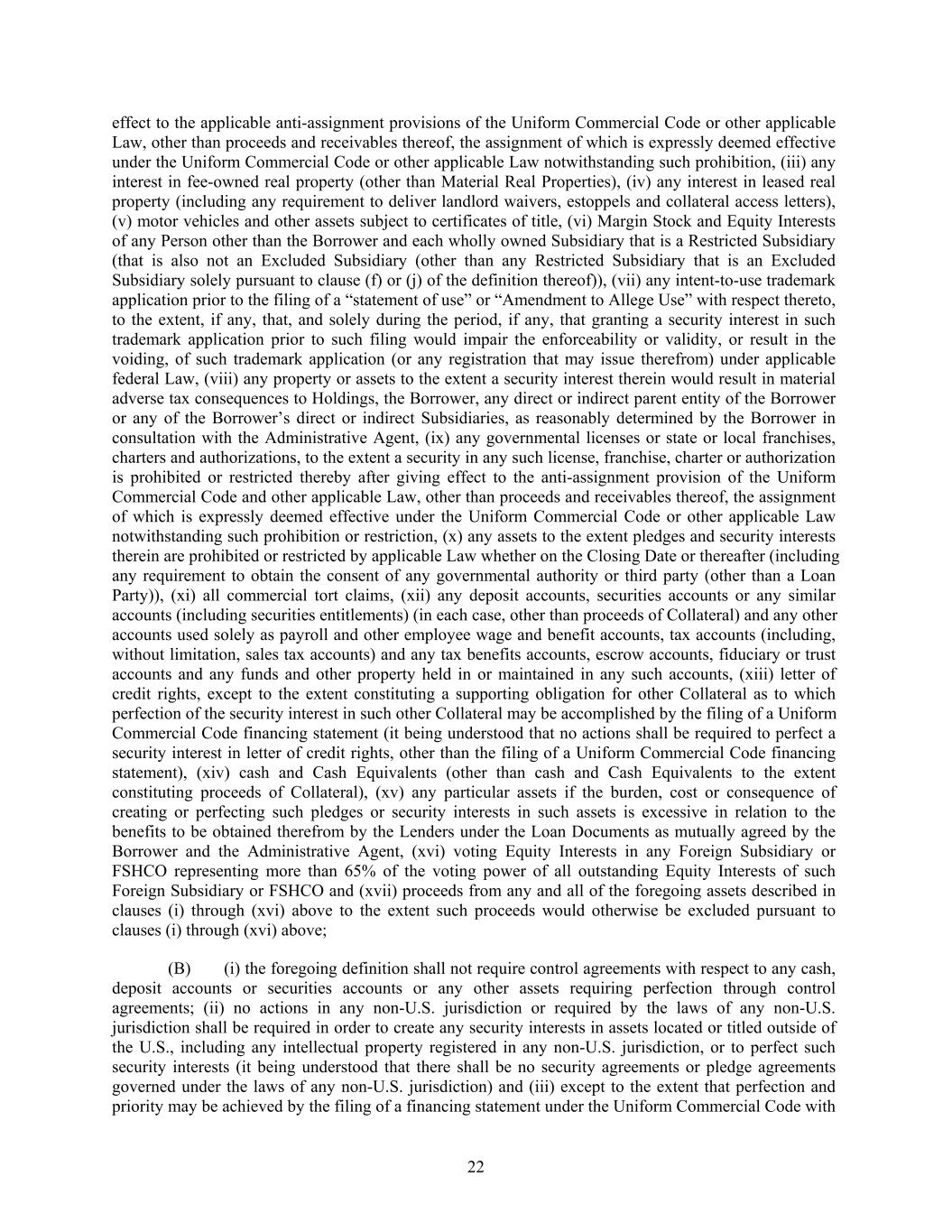 effect to the applicable anti-assignment provisions of the Uniform Commercial Code or other applicableLaw, other than proceeds and receivables thereof, the assignment of which is expressly deemed effectiveunder the Uniform Commercial Code or other applicable Law notwithstanding such prohibition, (iii) anyinterest in fee-owned real property (other than Material Real Properties), (iv) any interest in leased realproperty (including any requirement to deliver landlord waivers, estoppels and collateral access letters),(v) motor vehicles and other assets subject to certificates of title, (vi) Margin Stock and Equity Interestsof any Person other than the Borrower and each wholly owned Subsidiary that is a Restricted Subsidiary(that is also not an Excluded Subsidiary (other than any Restricted Subsidiary that is an ExcludedSubsidiary solely pursuant to clause (f) or (j) of the definition thereof)), (vii) any intent-to-use trademarkapplication prior to the filing of a “statement of use” or “Amendment to Allege Use” with respect thereto,to the extent, if any, that, and solely during the period, if any, that granting a security interest in suchtrademark application prior to such filing would impair the enforceability or validity, or result in thevoiding, of such trademark application (or any registration that may issue therefrom) under applicablefederal Law, (viii) any property or assets to the extent a security interest therein would result in materialadverse tax consequences to Holdings, the Borrower, any direct or indirect parent entity of the Borroweror any of the Borrower’s direct or indirect Subsidiaries, as reasonably determined by the Borrower inconsultation with the Administrative Agent, (ix) any governmental licenses or state or local franchises,charters and authorizations, to the extent a security in any such license, franchise, charter or authorizationis prohibited or restricted thereby after giving effect to the anti-assignment provision of the UniformCommercial Code and other applicable Law, other than proceeds and receivables thereof, the assignmentof which is expressly deemed effective under the Uniform Commercial Code or other applicable Lawnotwithstanding such prohibition or restriction, (x) any assets to the extent pledges and security intereststherein are prohibited or restricted by applicable Law whether on the Closing Date or thereafter (includingany requirement to obtain the consent of any governmental authority or third party (other than a LoanParty)), (xi) all commercial tort claims, (xii) any deposit accounts, securities accounts or any similaraccounts (including securities entitlements) (in each case, other than proceeds of Collateral) and any otheraccounts used solely as payroll and other employee wage and benefit accounts, tax accounts (including,without limitation, sales tax accounts) and any tax benefits accounts, escrow accounts, fiduciary or trustaccounts and any funds and other property held in or maintained in any such accounts, (xiii) letter ofcredit rights, except to the extent constituting a supporting obligation for other Collateral as to whichperfection of the security interest in such other Collateral may be accomplished by the filing of a UniformCommercial Code financing statement (it being understood that no actions shall be required to perfect asecurity interest in letter of credit rights, other than the filing of a Uniform Commercial Code financingstatement), (xiv) cash and Cash Equivalents (other than cash and Cash Equivalents to the extentconstituting proceeds of Collateral), (xv) any particular assets if the burden, cost or consequence ofcreating or perfecting such pledges or security interests in such assets is excessive in relation to thebenefits to be obtained therefrom by the Lenders under the Loan Documents as mutually agreed by theBorrower and the Administrative Agent, (xvi) voting Equity Interests in any Foreign Subsidiary orFSHCO representing more than 65% of the voting power of all outstanding Equity Interests of suchForeign Subsidiary or FSHCO and (xvii) proceeds from any and all of the foregoing assets described inclauses (i) through (xvi) above to the extent such proceeds would otherwise be excluded pursuant toclauses (i) through (xvi) above;(B) (i) the foregoing definition shall not require control agreements with respect to any cash,deposit accounts or securities accounts or any other assets requiring perfection through controlagreements; (ii) no actions in any non-U.S. jurisdiction or required by the laws of any non-U.S.jurisdiction shall be required in order to create any security interests in assets located or titled outside ofthe U.S., including any intellectual property registered in any non-U.S. jurisdiction, or to perfect suchsecurity interests (it being understood that there shall be no security agreements or pledge agreementsgoverned under the laws of any non-U.S. jurisdiction) and (iii) except to the extent that perfection andpriority may be achieved by the filing of a financing statement under the Uniform Commercial Code with22