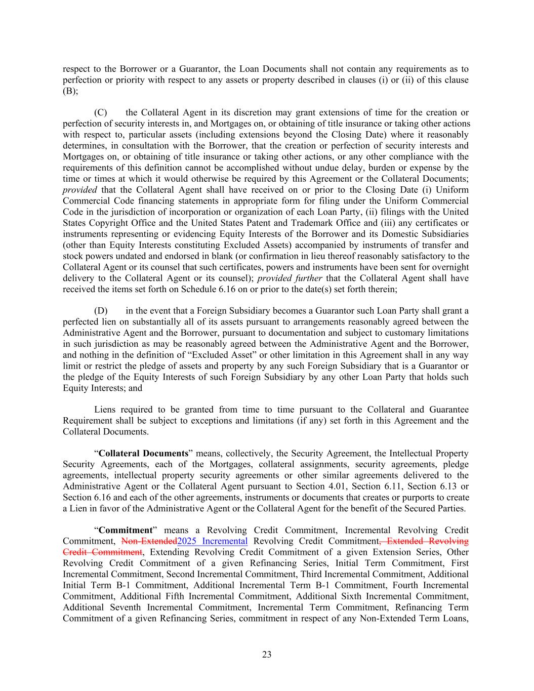 respect to the Borrower or a Guarantor, the Loan Documents shall not contain any requirements as toperfection or priority with respect to any assets or property described in clauses (i) or (ii) of this clause(B); (C) the Collateral Agent in its discretion may grant extensions of time for the creation orperfection of security interests in, and Mortgages on, or obtaining of title insurance or taking other actionswith respect to, particular assets (including extensions beyond the Closing Date) where it reasonablydetermines, in consultation with the Borrower, that the creation or perfection of security interests andMortgages on, or obtaining of title insurance or taking other actions, or any other compliance with therequirements of this definition cannot be accomplished without undue delay, burden or expense by thetime or times at which it would otherwise be required by this Agreement or the Collateral Documents;provided that the Collateral Agent shall have received on or prior to the Closing Date (i) UniformCommercial Code financing statements in appropriate form for filing under the Uniform CommercialCode in the jurisdiction of incorporation or organization of each Loan Party, (ii) filings with the UnitedStates Copyright Office and the United States Patent and Trademark Office and (iii) any certificates orinstruments representing or evidencing Equity Interests of the Borrower and its Domestic Subsidiaries(other than Equity Interests constituting Excluded Assets) accompanied by instruments of transfer andstock powers undated and endorsed in blank (or confirmation in lieu thereof reasonably satisfactory to theCollateral Agent or its counsel that such certificates, powers and instruments have been sent for overnightdelivery to the Collateral Agent or its counsel); provided further that the Collateral Agent shall havereceived the items set forth on Schedule 6.16 on or prior to the date(s) set forth therein;(D) in the event that a Foreign Subsidiary becomes a Guarantor such Loan Party shall grant aperfected lien on substantially all of its assets pursuant to arrangements reasonably agreed between theAdministrative Agent and the Borrower, pursuant to documentation and subject to customary limitationsin such jurisdiction as may be reasonably agreed between the Administrative Agent and the Borrower,and nothing in the definition of “Excluded Asset” or other limitation in this Agreement shall in any waylimit or restrict the pledge of assets and property by any such Foreign Subsidiary that is a Guarantor orthe pledge of the Equity Interests of such Foreign Subsidiary by any other Loan Party that holds suchEquity Interests; andLiens required to be granted from time to time pursuant to the Collateral and GuaranteeRequirement shall be subject to exceptions and limitations (if any) set forth in this Agreement and theCollateral Documents.“Collateral Documents” means, collectively, the Security Agreement, the Intellectual PropertySecurity Agreements, each of the Mortgages, collateral assignments, security agreements, pledgeagreements, intellectual property security agreements or other similar agreements delivered to theAdministrative Agent or the Collateral Agent pursuant to Section 4.01, Section 6.11, Section 6.13 or Section 6.16 and each of the other agreements, instruments or documents that creates or purports to createa Lien in favor of the Administrative Agent or the Collateral Agent for the benefit of the Secured Parties.“Commitment” means a Revolving Credit Commitment, Incremental Revolving CreditCommitment, Non-Extended2025 Incremental Revolving Credit Commitment, Extended RevolvingCredit Commitment, Extending Revolving Credit Commitment of a given Extension Series, OtherRevolving Credit Commitment of a given Refinancing Series, Initial Term Commitment, FirstIncremental Commitment, Second Incremental Commitment, Third Incremental Commitment, AdditionalInitial Term B-1 Commitment, Additional Incremental Term B-1 Commitment, Fourth IncrementalCommitment, Additional Fifth Incremental Commitment, Additional Sixth Incremental Commitment,Additional Seventh Incremental Commitment, Incremental Term Commitment, Refinancing TermCommitment of a given Refinancing Series, commitment in respect of any Non-Extended Term Loans,23
