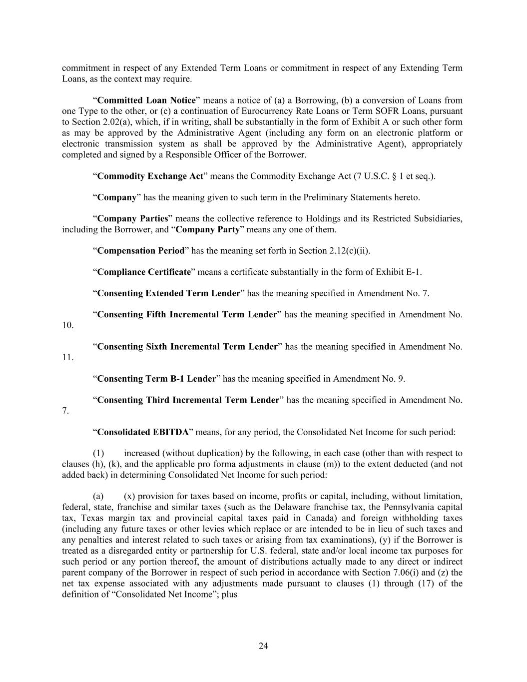 commitment in respect of any Extended Term Loans or commitment in respect of any Extending TermLoans, as the context may require.“Committed Loan Notice” means a notice of (a) a Borrowing, (b) a conversion of Loans fromone Type to the other, or (c) a continuation of Eurocurrency Rate Loans or Term SOFR Loans, pursuantto Section 2.02(a), which, if in writing, shall be substantially in the form of Exhibit A or such other formas may be approved by the Administrative Agent (including any form on an electronic platform orelectronic transmission system as shall be approved by the Administrative Agent), appropriatelycompleted and signed by a Responsible Officer of the Borrower.“Commodity Exchange Act” means the Commodity Exchange Act (7 U.S.C. § 1 et seq.).“Company” has the meaning given to such term in the Preliminary Statements hereto.“Company Parties” means the collective reference to Holdings and its Restricted Subsidiaries,including the Borrower, and “Company Party” means any one of them.“Compensation Period” has the meaning set forth in Section 2.12(c)(ii).“Compliance Certificate” means a certificate substantially in the form of Exhibit E-1.“Consenting Extended Term Lender” has the meaning specified in Amendment No. 7.“Consenting Fifth Incremental Term Lender” has the meaning specified in Amendment No.10. “Consenting Sixth Incremental Term Lender” has the meaning specified in Amendment No.11. “Consenting Term B-1 Lender” has the meaning specified in Amendment No. 9.“Consenting Third Incremental Term Lender” has the meaning specified in Amendment No.7. “Consolidated EBITDA” means, for any period, the Consolidated Net Income for such period:(1) increased (without duplication) by the following, in each case (other than with respect toclauses (h), (k), and the applicable pro forma adjustments in clause (m)) to the extent deducted (and notadded back) in determining Consolidated Net Income for such period:(a) (x) provision for taxes based on income, profits or capital, including, without limitation,federal, state, franchise and similar taxes (such as the Delaware franchise tax, the Pennsylvania capitaltax, Texas margin tax and provincial capital taxes paid in Canada) and foreign withholding taxes(including any future taxes or other levies which replace or are intended to be in lieu of such taxes andany penalties and interest related to such taxes or arising from tax examinations), (y) if the Borrower istreated as a disregarded entity or partnership for U.S. federal, state and/or local income tax purposes forsuch period or any portion thereof, the amount of distributions actually made to any direct or indirectparent company of the Borrower in respect of such period in accordance with Section 7.06(i) and (z) thenet tax expense associated with any adjustments made pursuant to clauses (1) through (17) of thedefinition of “Consolidated Net Income”; plus 24