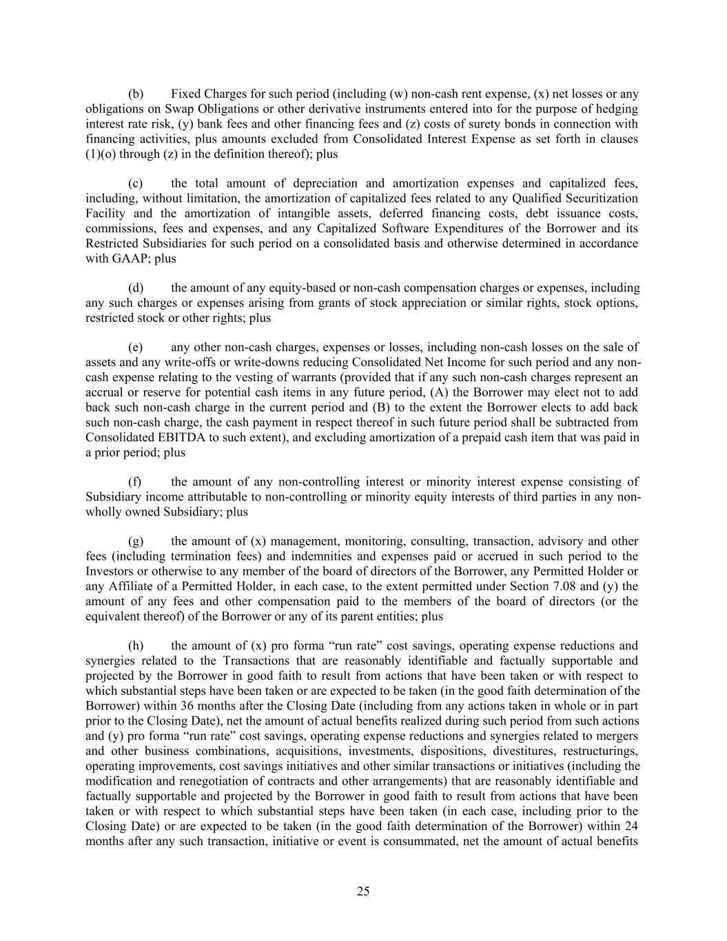 (b) Fixed Charges for such period (including (w) non-cash rent expense, (x) net losses or anyobligations on Swap Obligations or other derivative instruments entered into for the purpose of hedginginterest rate risk, (y) bank fees and other financing fees and (z) costs of surety bonds in connection withfinancing activities, plus amounts excluded from Consolidated Interest Expense as set forth in clauses(1)(o) through (z) in the definition thereof); plus(c) the total amount of depreciation and amortization expenses and capitalized fees,including, without limitation, the amortization of capitalized fees related to any Qualified SecuritizationFacility and the amortization of intangible assets, deferred financing costs, debt issuance costs,commissions, fees and expenses, and any Capitalized Software Expenditures of the Borrower and itsRestricted Subsidiaries for such period on a consolidated basis and otherwise determined in accordancewith GAAP; plus(d) the amount of any equity-based or non-cash compensation charges or expenses, includingany such charges or expenses arising from grants of stock appreciation or similar rights, stock options,restricted stock or other rights; plus(e) any other non-cash charges, expenses or losses, including non-cash losses on the sale ofassets and any write-offs or write-downs reducing Consolidated Net Income for such period and any non-cash expense relating to the vesting of warrants (provided that if any such non-cash charges represent anaccrual or reserve for potential cash items in any future period, (A) the Borrower may elect not to addback such non-cash charge in the current period and (B) to the extent the Borrower elects to add backsuch non-cash charge, the cash payment in respect thereof in such future period shall be subtracted fromConsolidated EBITDA to such extent), and excluding amortization of a prepaid cash item that was paid ina prior period; plus(f) the amount of any non-controlling interest or minority interest expense consisting ofSubsidiary income attributable to non-controlling or minority equity interests of third parties in any non-wholly owned Subsidiary; plus(g) the amount of (x) management, monitoring, consulting, transaction, advisory and otherfees (including termination fees) and indemnities and expenses paid or accrued in such period to theInvestors or otherwise to any member of the board of directors of the Borrower, any Permitted Holder orany Affiliate of a Permitted Holder, in each case, to the extent permitted under Section 7.08 and (y) theamount of any fees and other compensation paid to the members of the board of directors (or theequivalent thereof) of the Borrower or any of its parent entities; plus(h) the amount of (x) pro forma “run rate” cost savings, operating expense reductions andsynergies related to the Transactions that are reasonably identifiable and factually supportable andprojected by the Borrower in good faith to result from actions that have been taken or with respect towhich substantial steps have been taken or are expected to be taken (in the good faith determination of theBorrower) within 36 months after the Closing Date (including from any actions taken in whole or in partprior to the Closing Date), net the amount of actual benefits realized during such period from such actionsand (y) pro forma “run rate” cost savings, operating expense reductions and synergies related to mergersand other business combinations, acquisitions, investments, dispositions, divestitures, restructurings,operating improvements, cost savings initiatives and other similar transactions or initiatives (including themodification and renegotiation of contracts and other arrangements) that are reasonably identifiable andfactually supportable and projected by the Borrower in good faith to result from actions that have beentaken or with respect to which substantial steps have been taken (in each case, including prior to theClosing Date) or are expected to be taken (in the good faith determination of the Borrower) within 24months after any such transaction, initiative or event is consummated, net the amount of actual benefits25